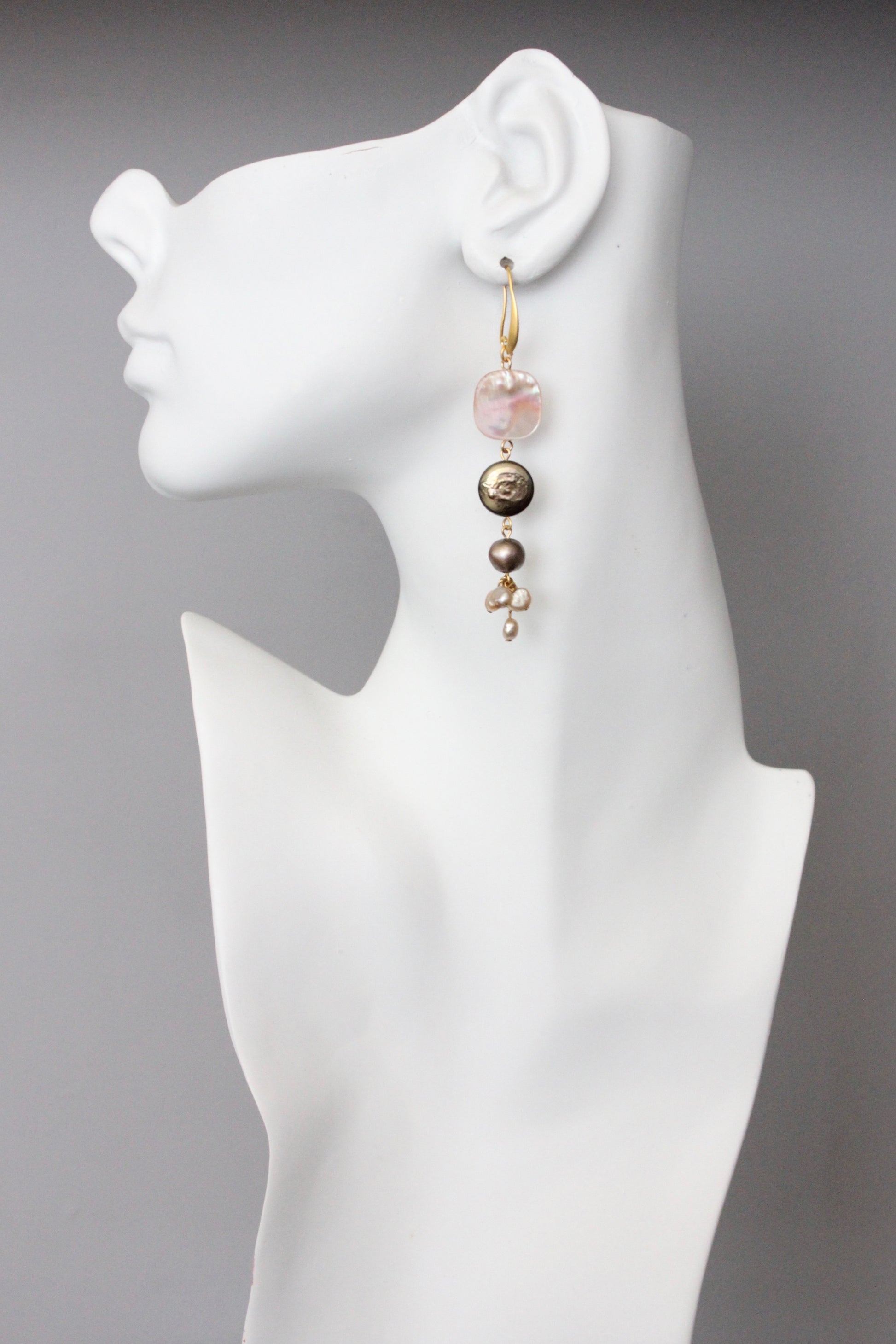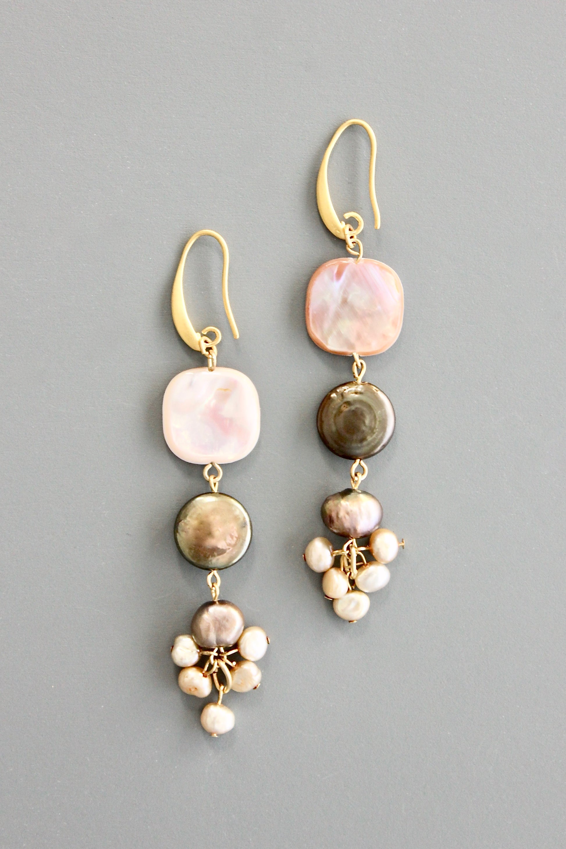 18k gold plated brass hooks with mother of pearls and fresh water pearls. 3.5 inches.