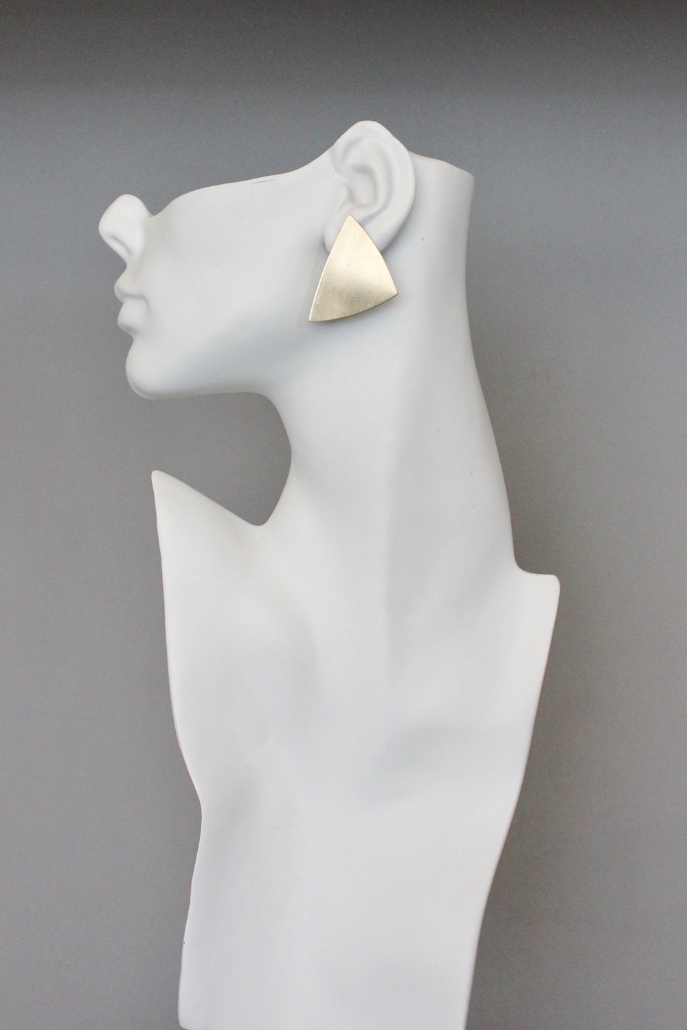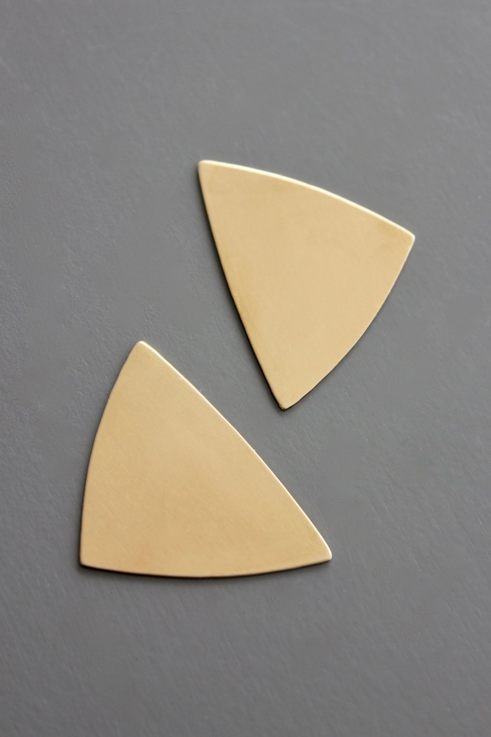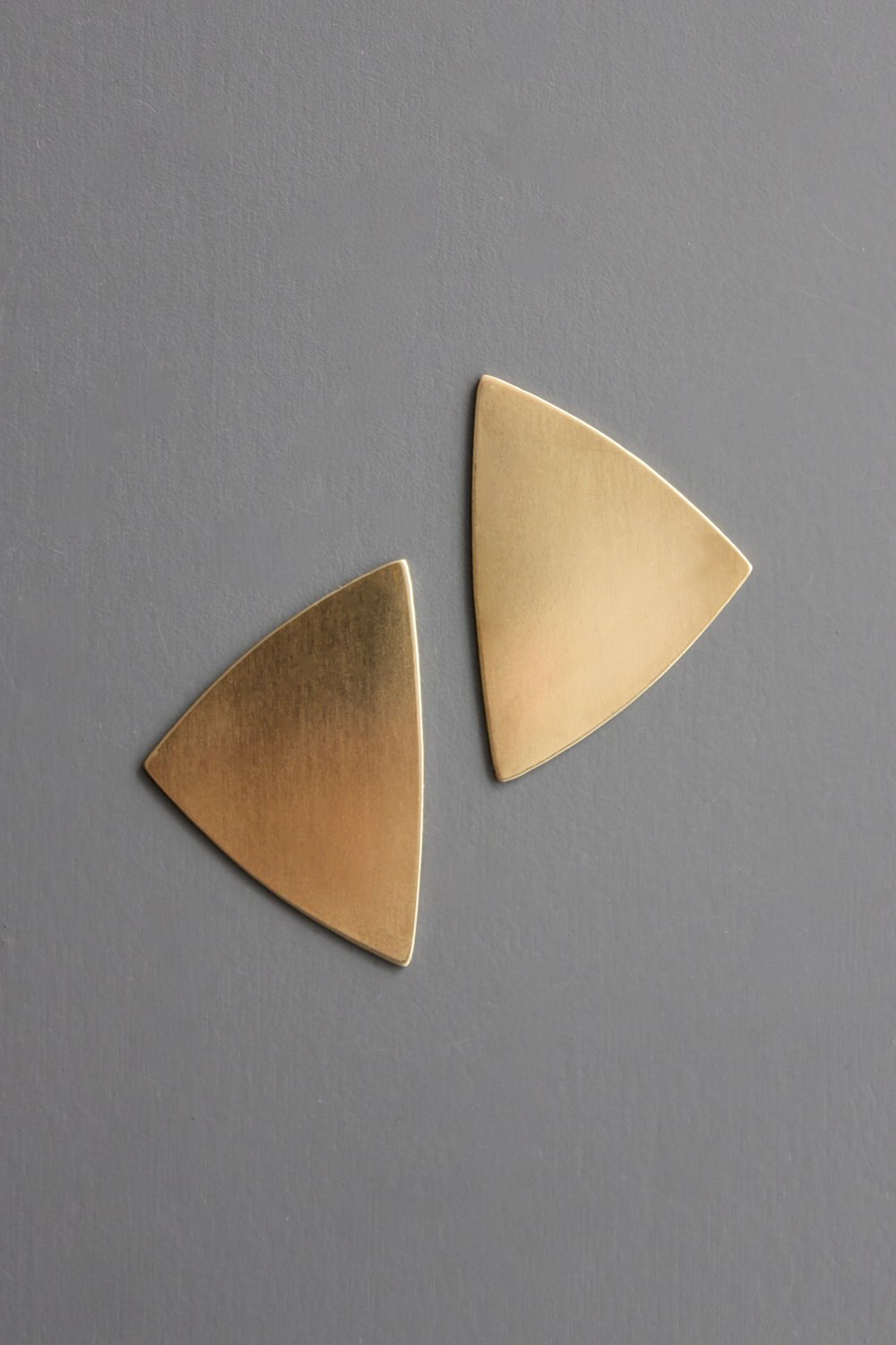 brass triangle with hypollergenic surgical steel post earrings. 1.75 X 1 inches.