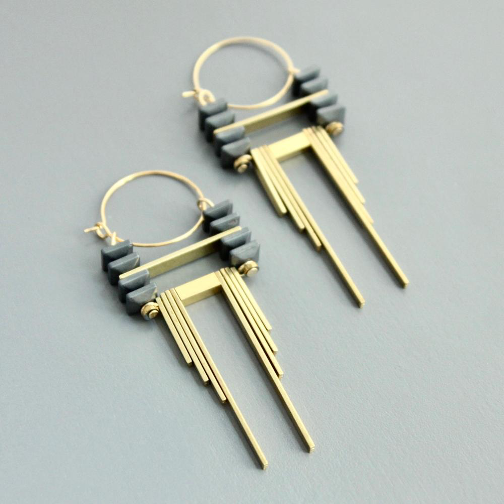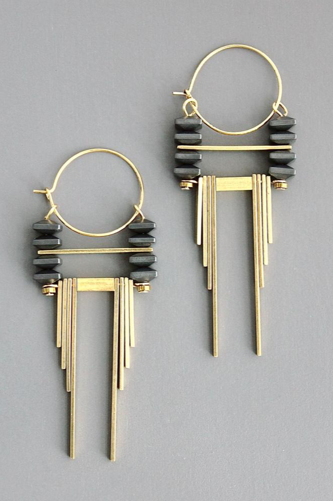 18k gold plated brass hoops with hematite and brass. 2 7/8 inches. 0.24 oz per earring.