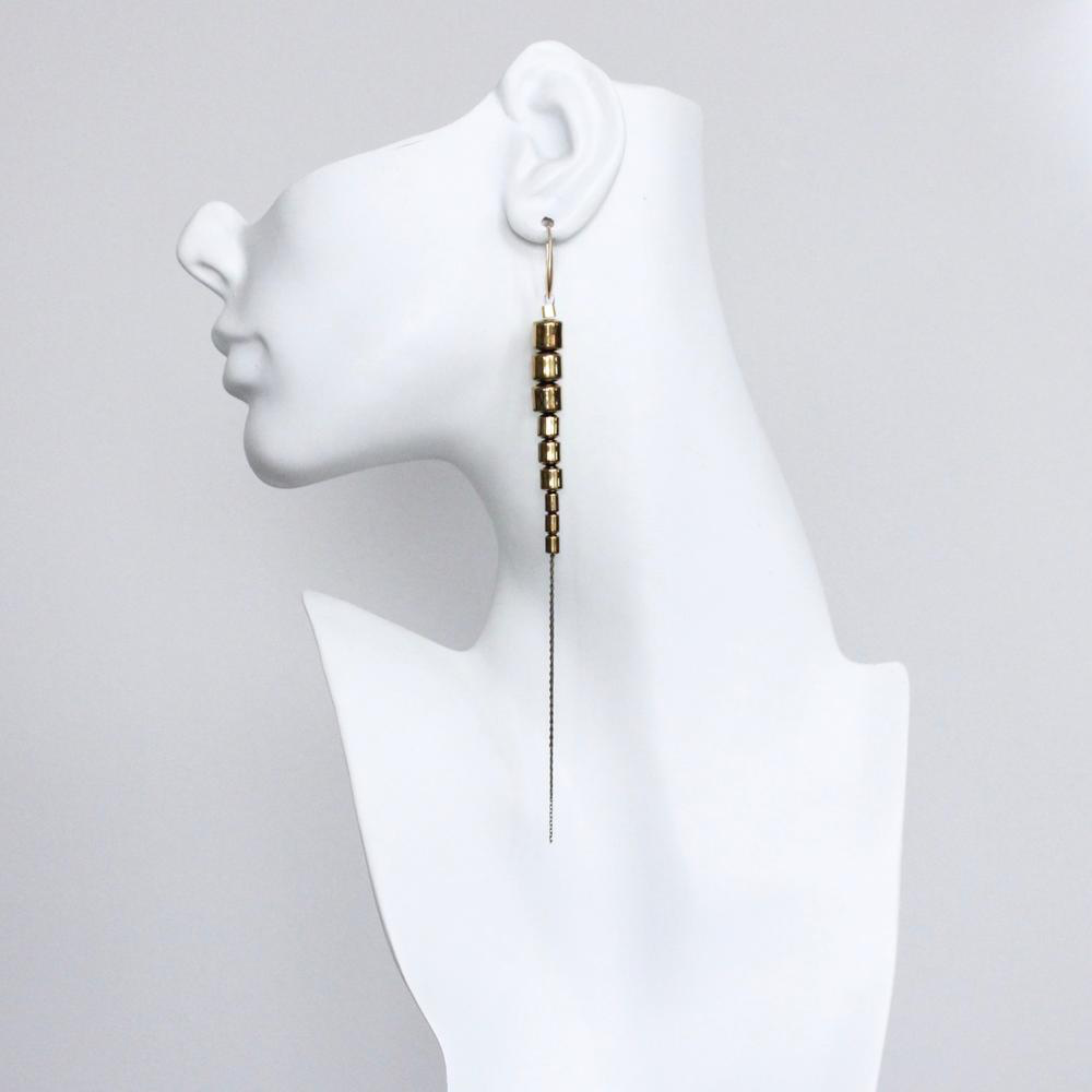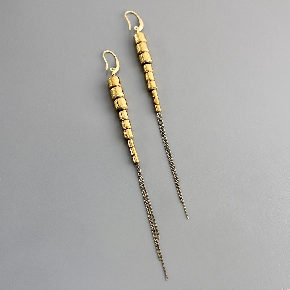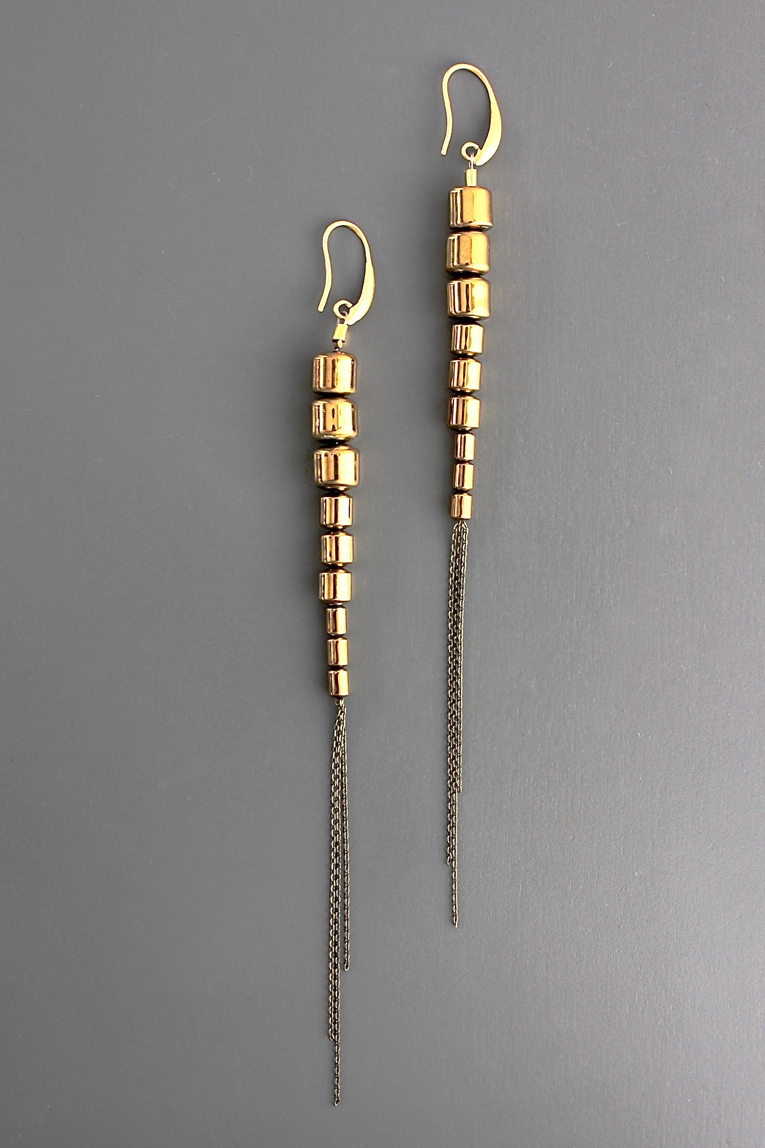 18k gold plated brass hooks with plated hematite. 6.5 inches from top of hook.