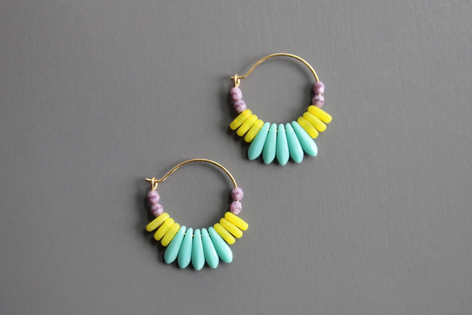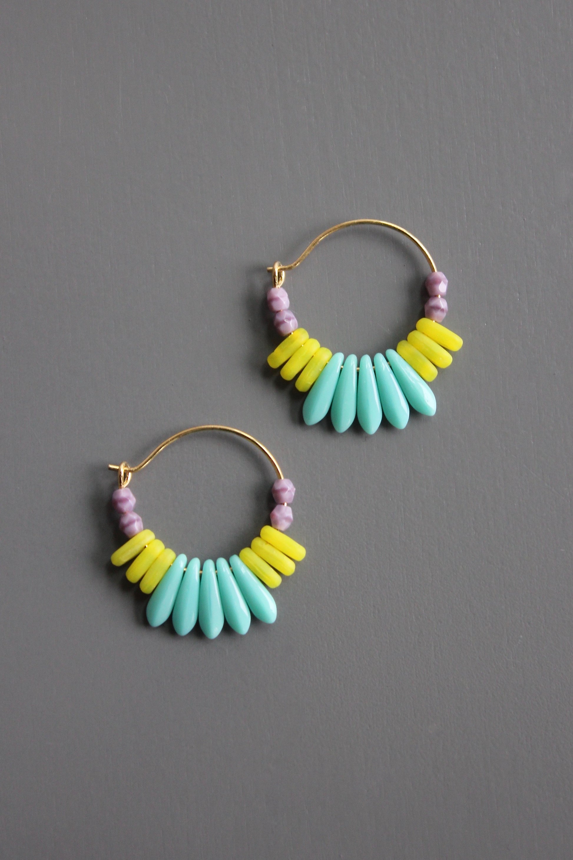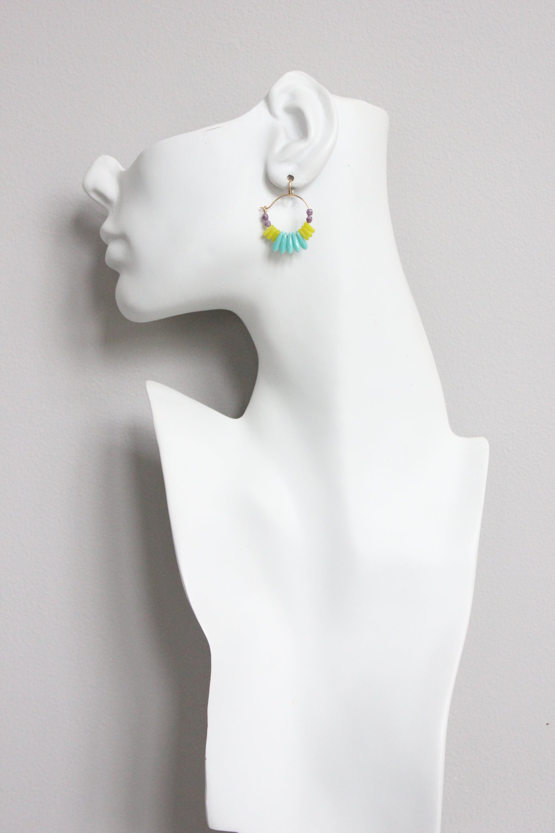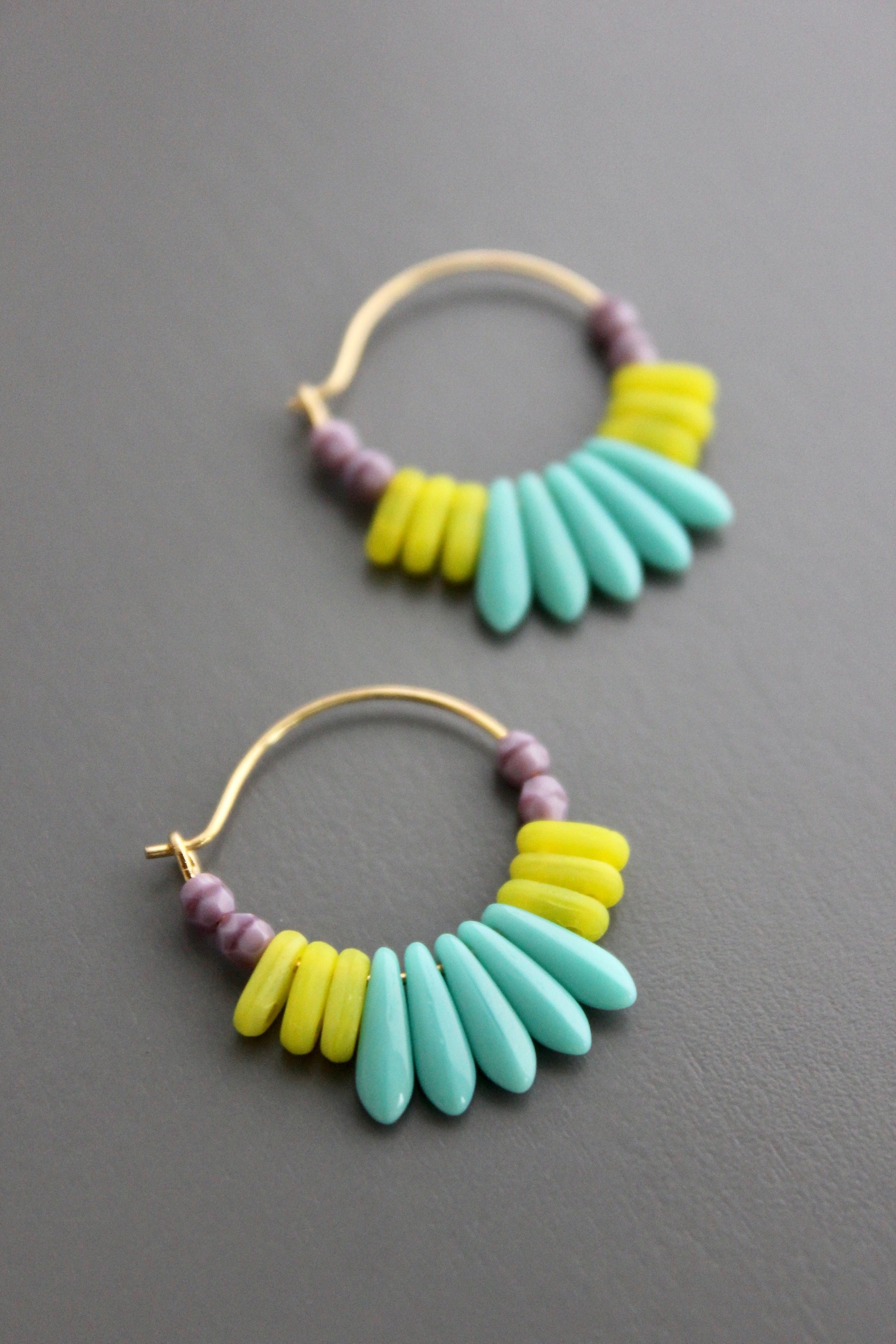18k gold plated brass hoop earrings with Czech glass. Each pair weighs .10 oz. and measures 1 1/8 inches long.