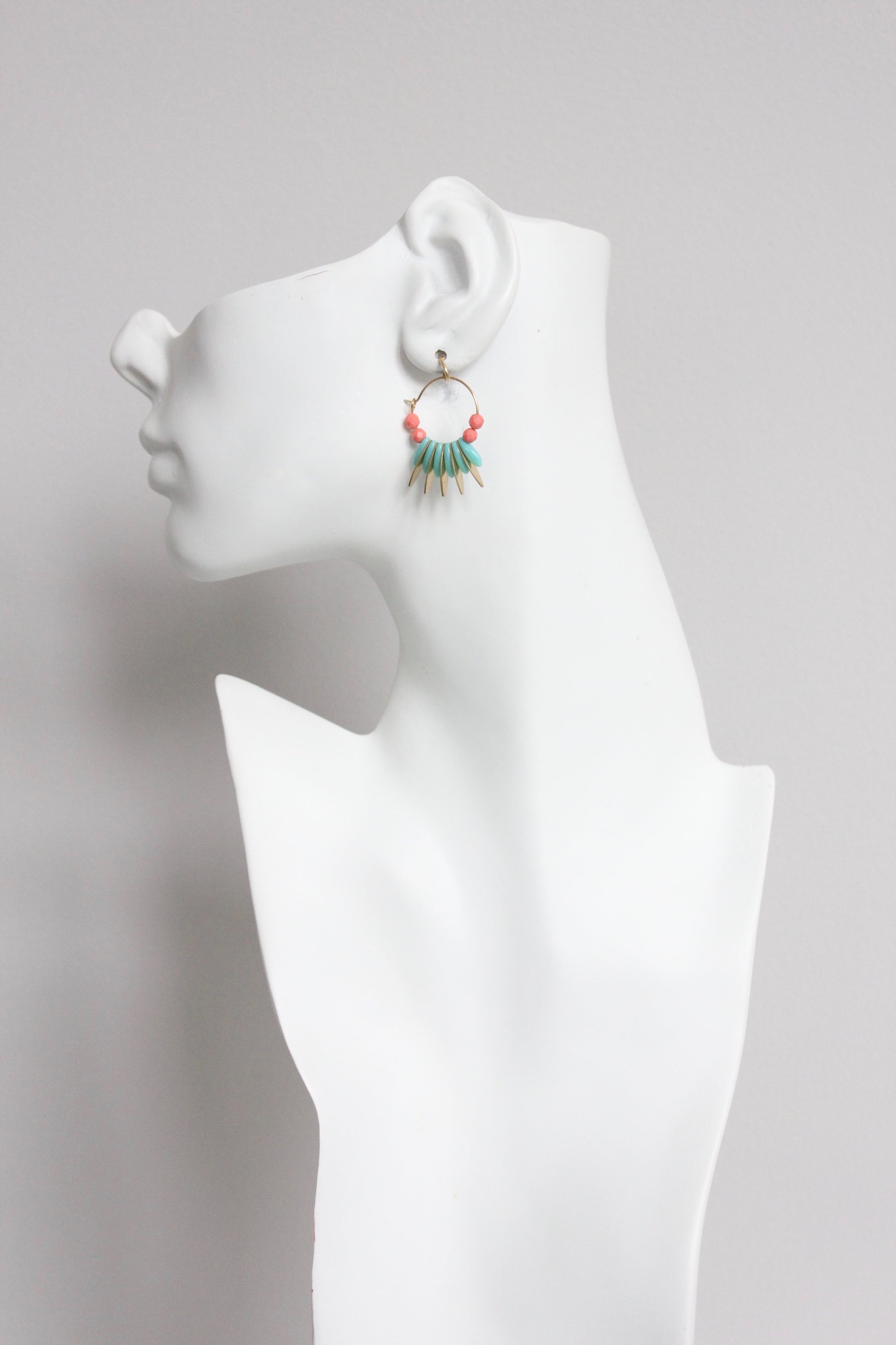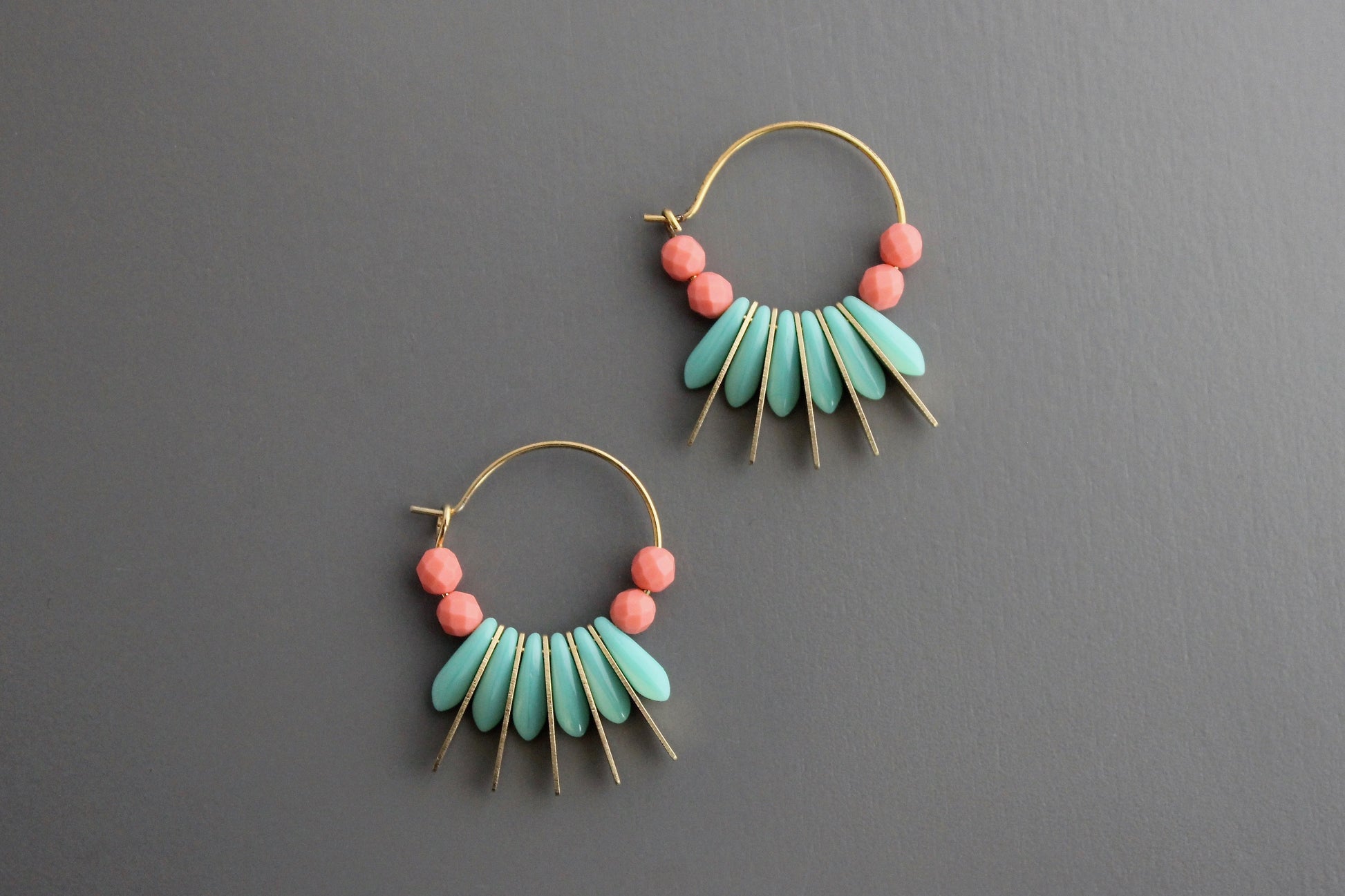 18k gold plated brass hoop earrings with glass and brass. Each pair weighs .15 oz. and measures 1 3/8 inches long.