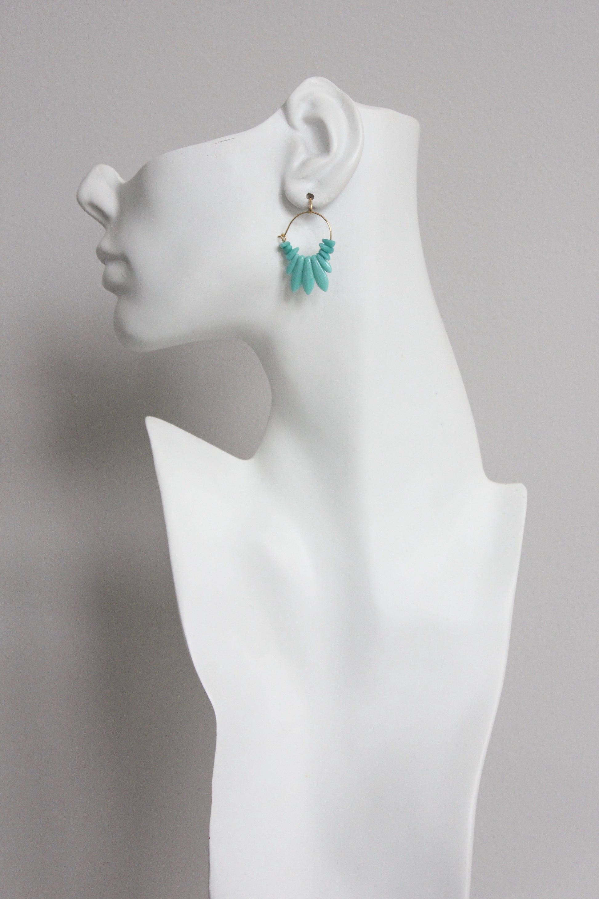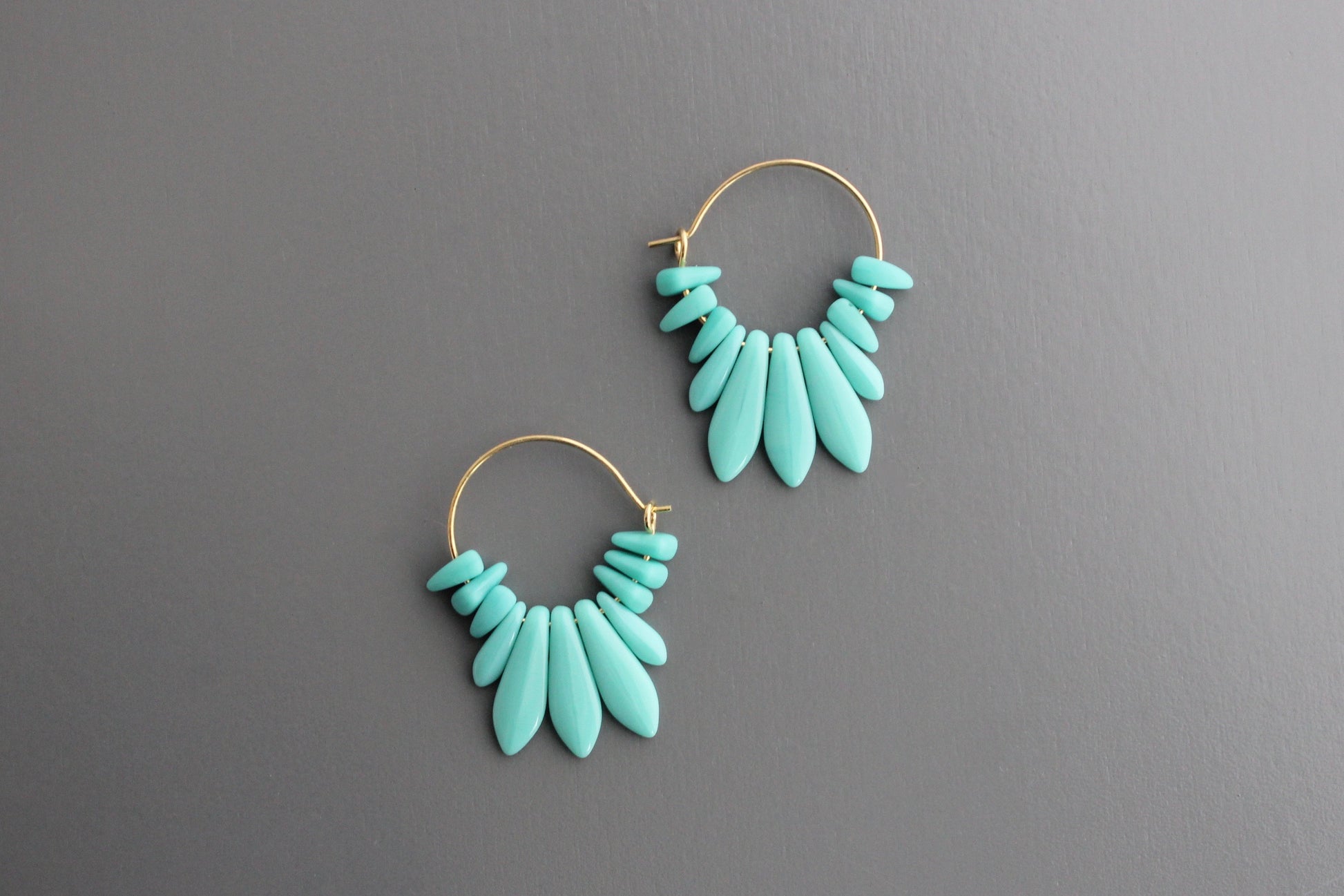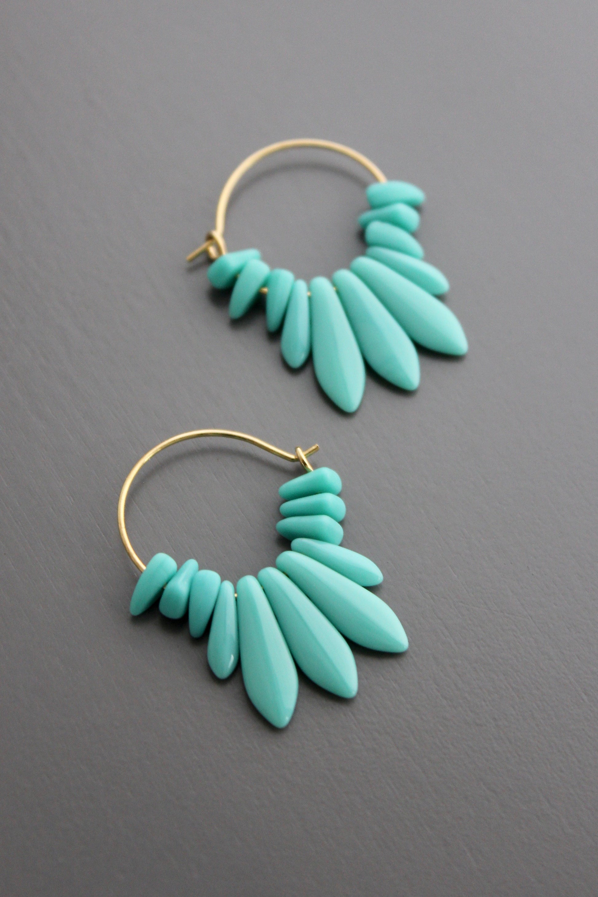 18k gold plated brass hoop earrings with czech glass. Each pair weighs .14 oz. and measures 1.25 inches long.