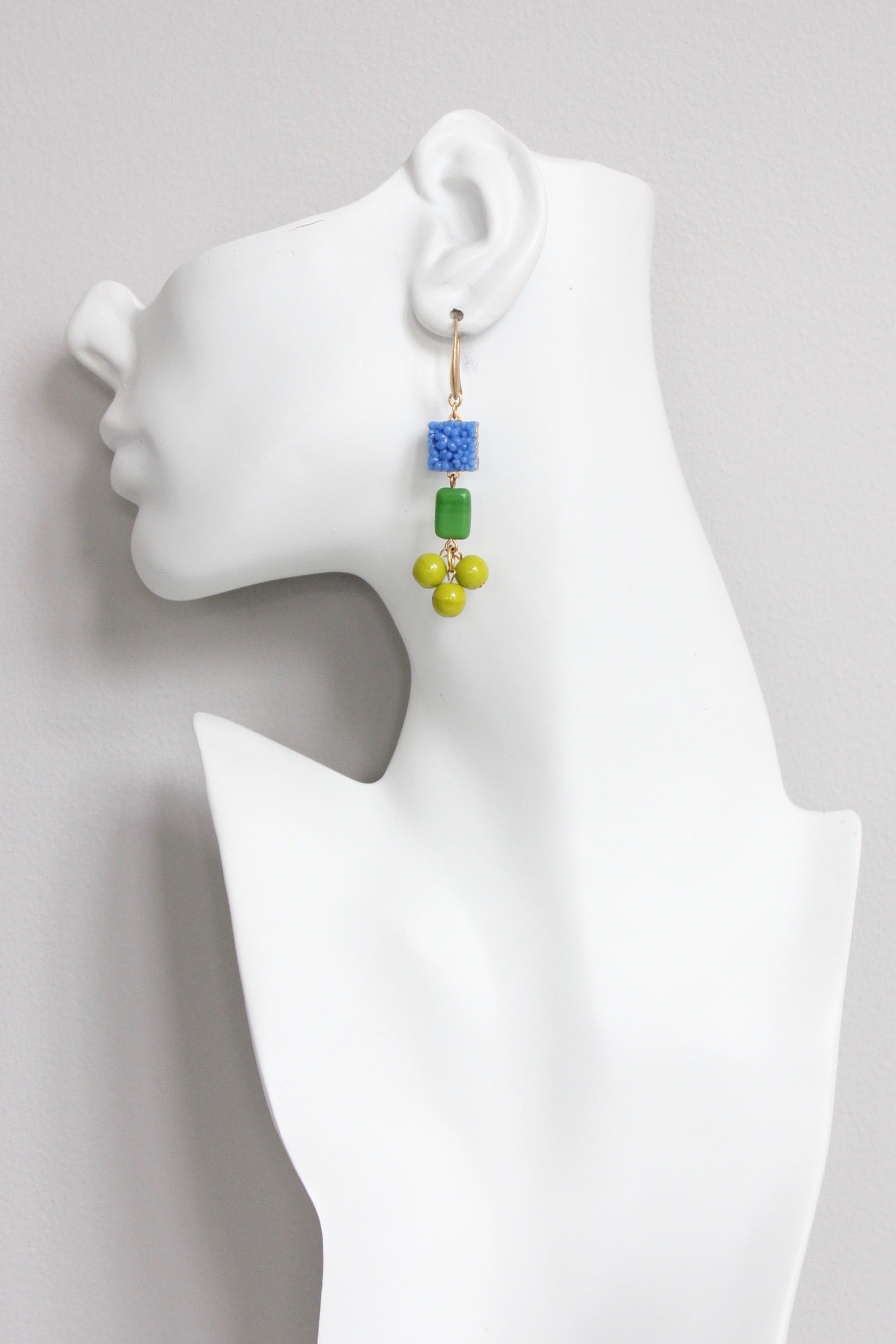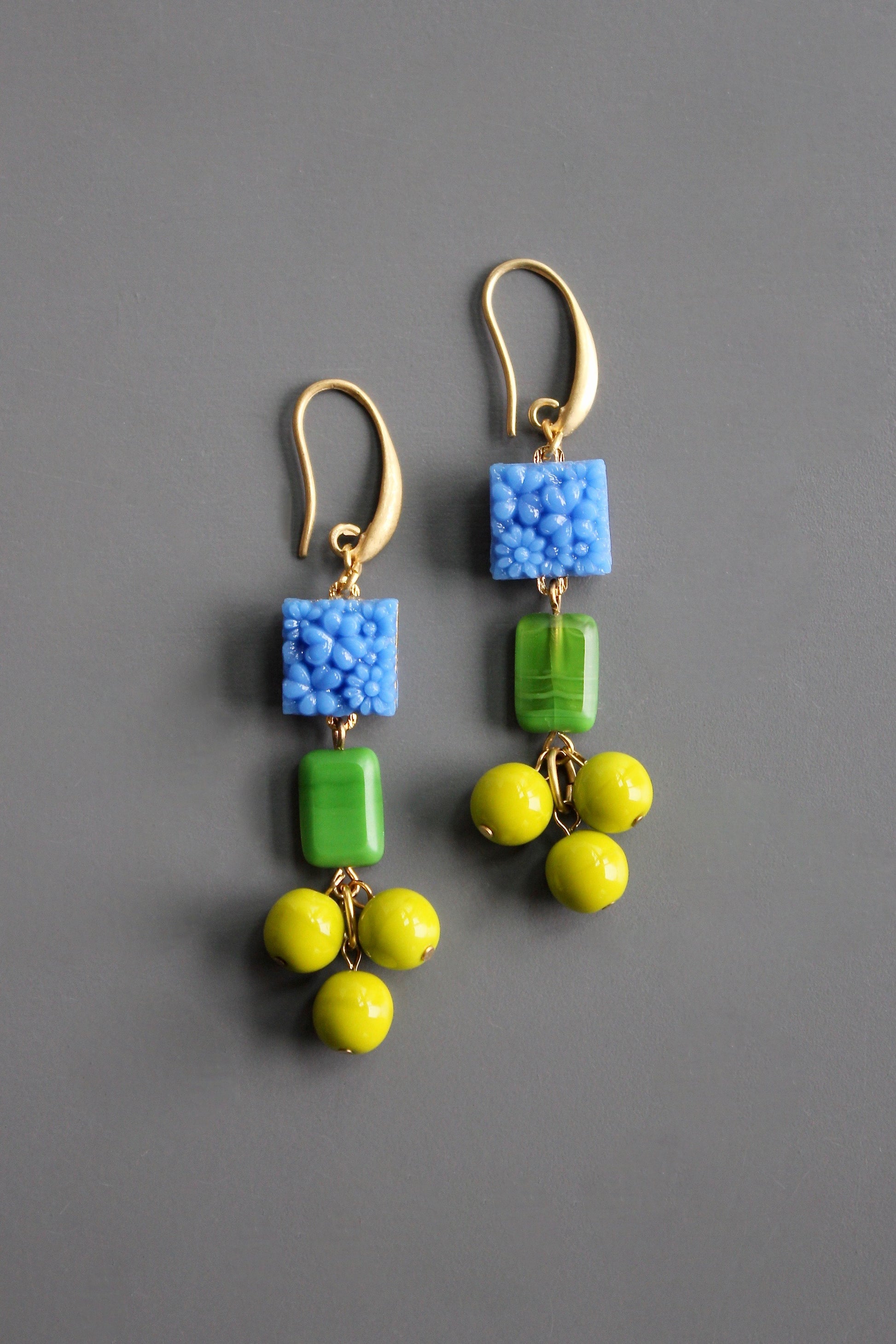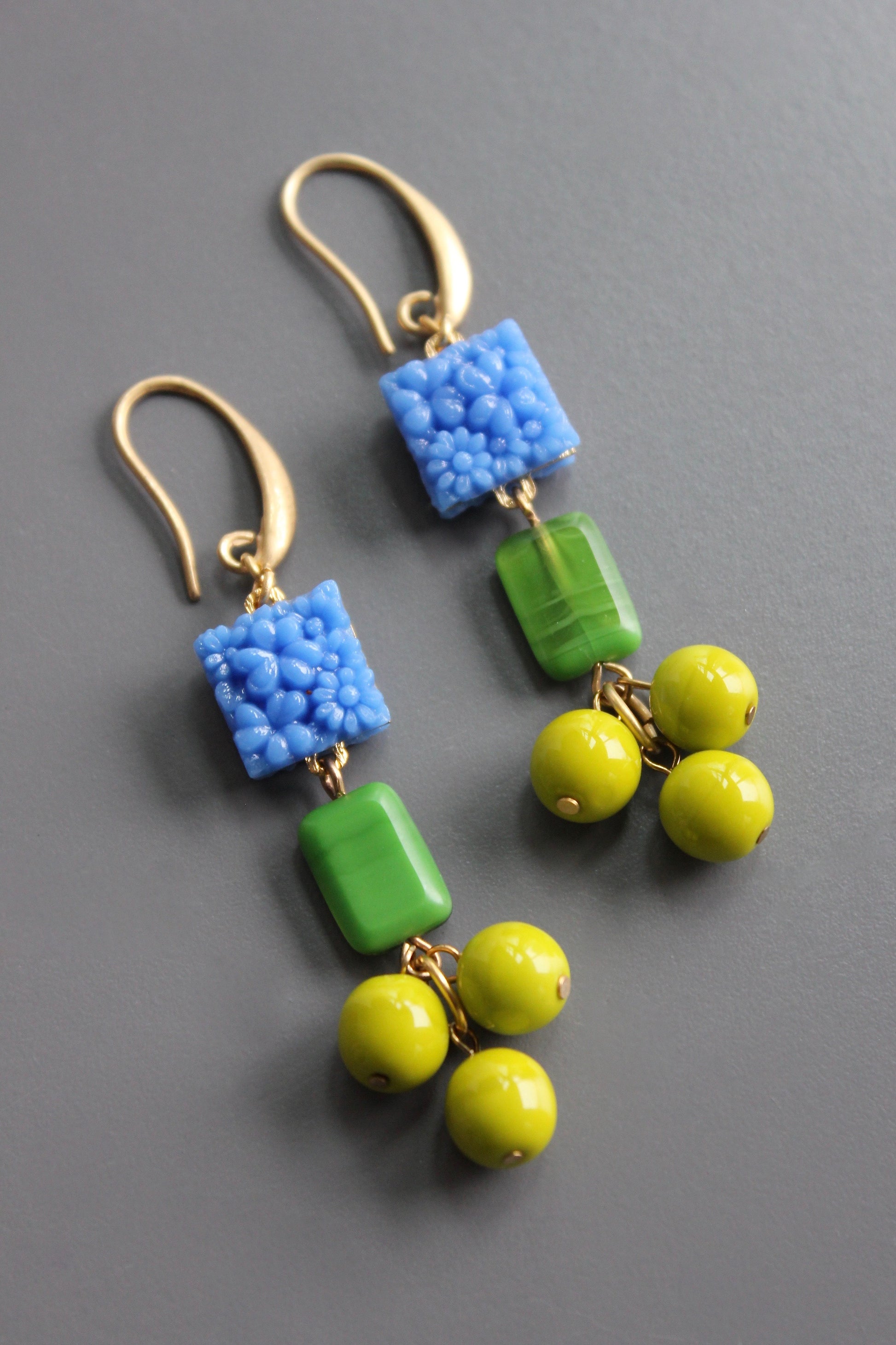18k gold plated brass hook earrings with vintage Japanese pressed glass and czech glass. Each pair weighs .42 oz. and measures 2.75 inches long.