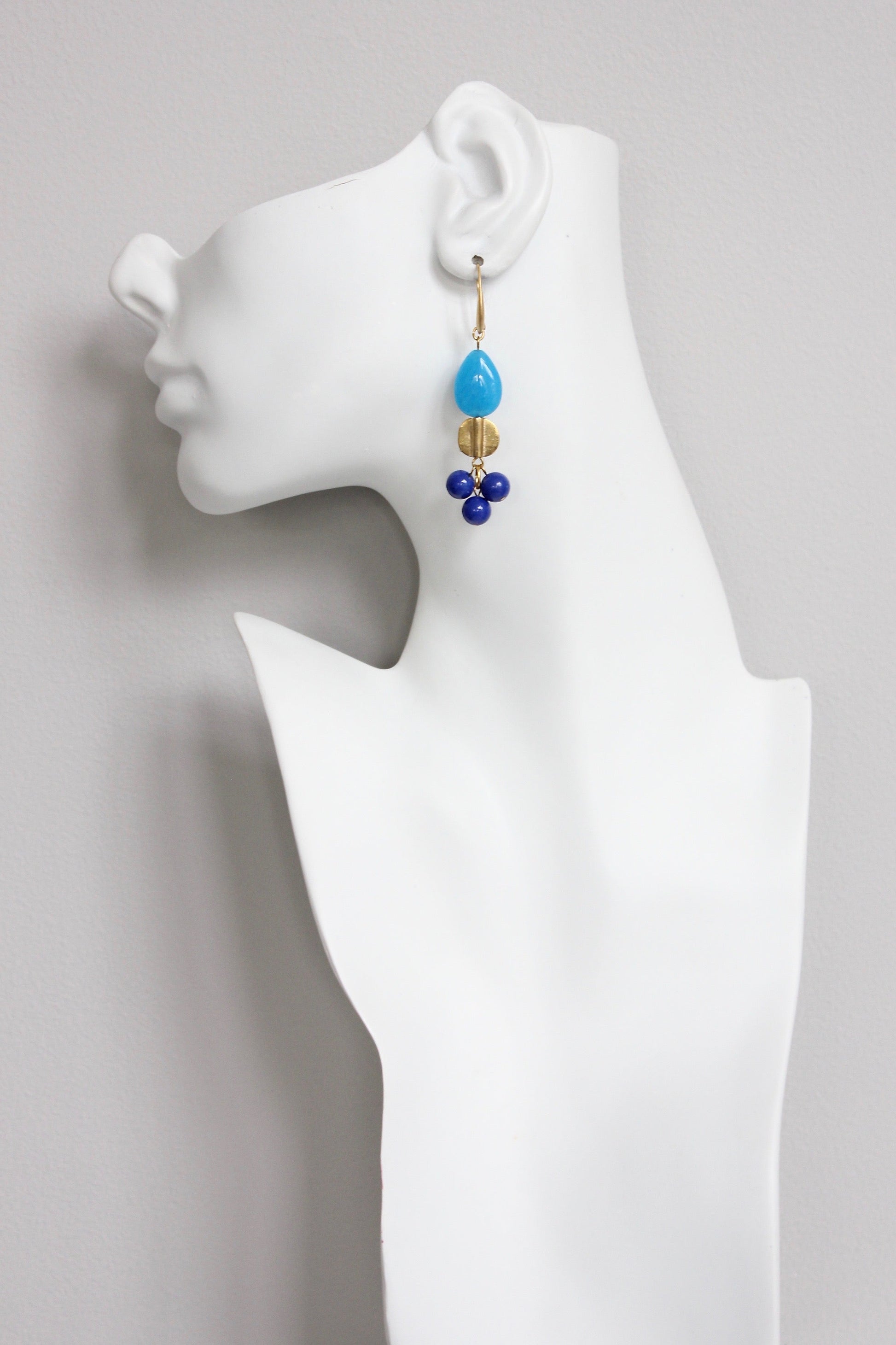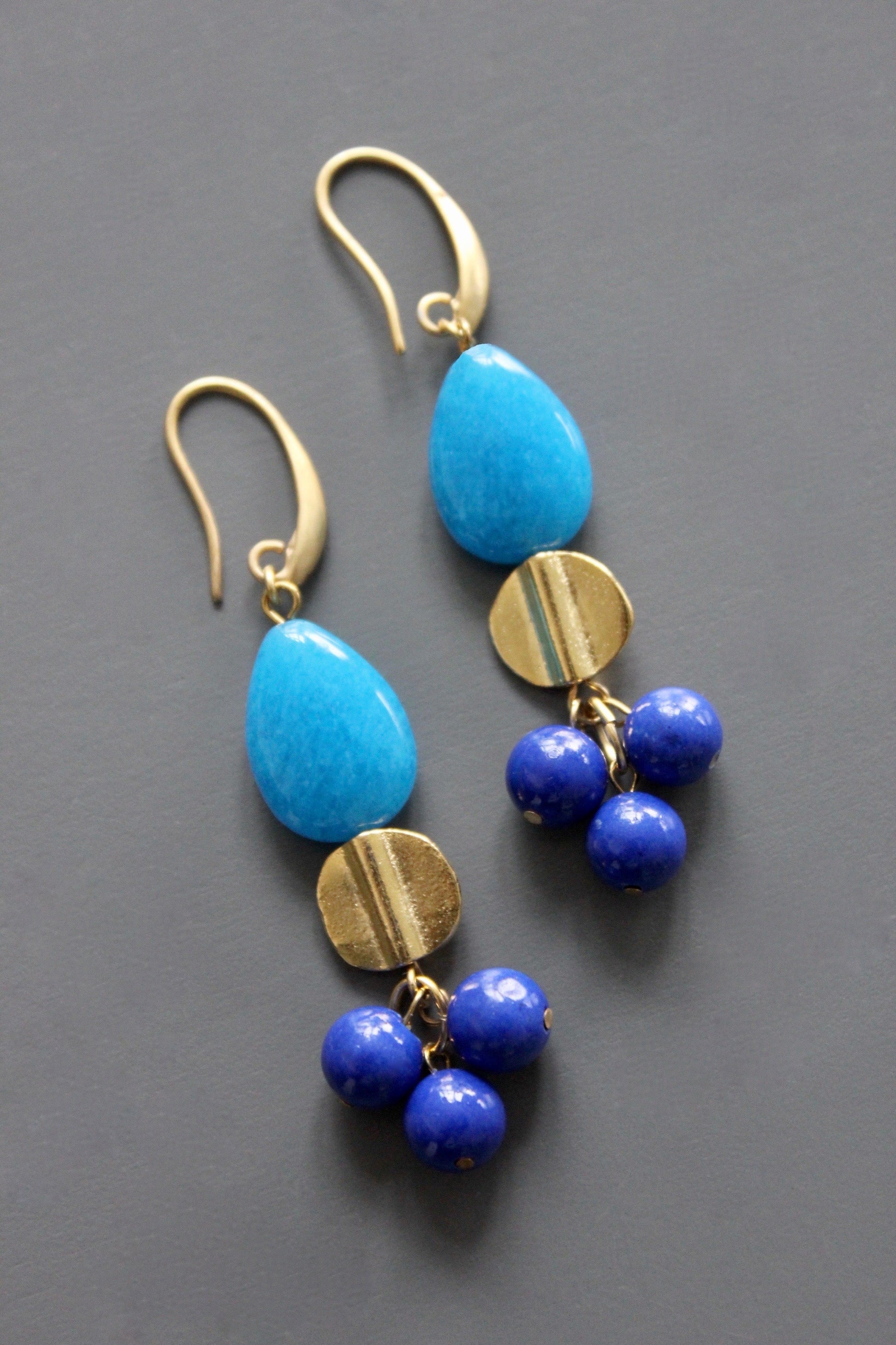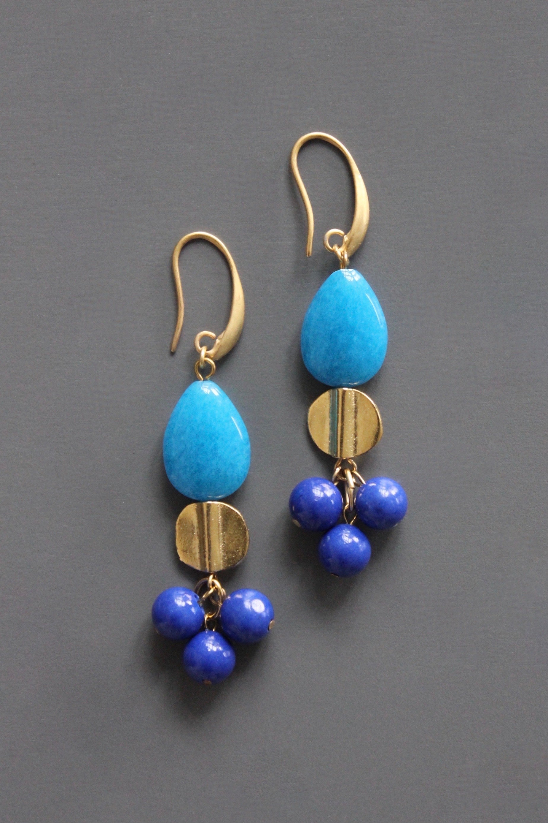 18k gold plated brass hook earrings with dyed jade, brass, and glass. Each pair weighs .44 oz. and measures 2.75 inches long.