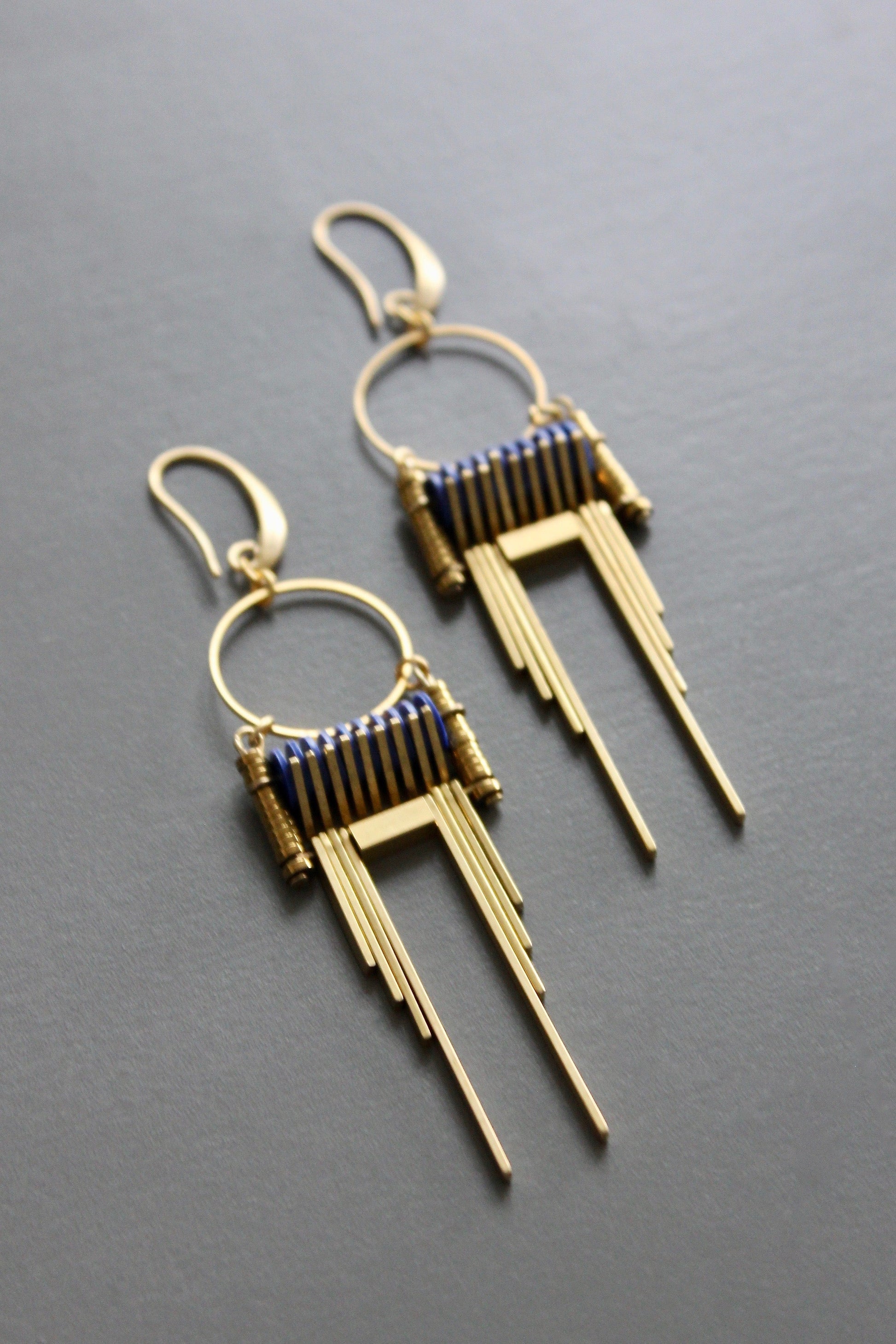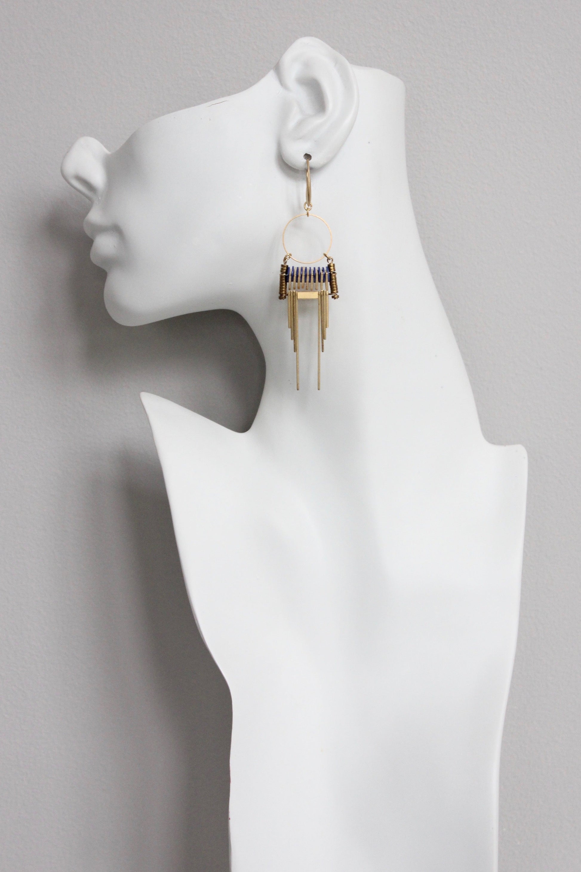 18k gold plated brass hook earrings with vulcanite, electroplated hematite, and brass. Each pair weighs .59 oz. and measures 3 5/8 inches long.