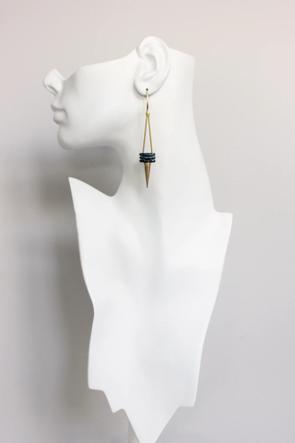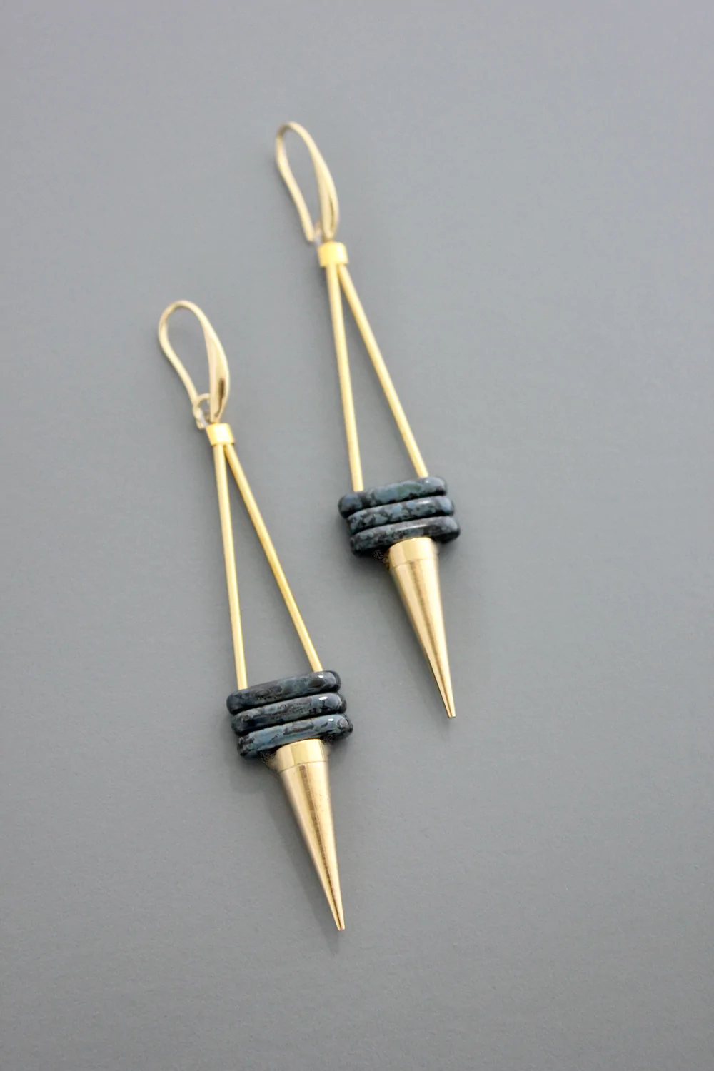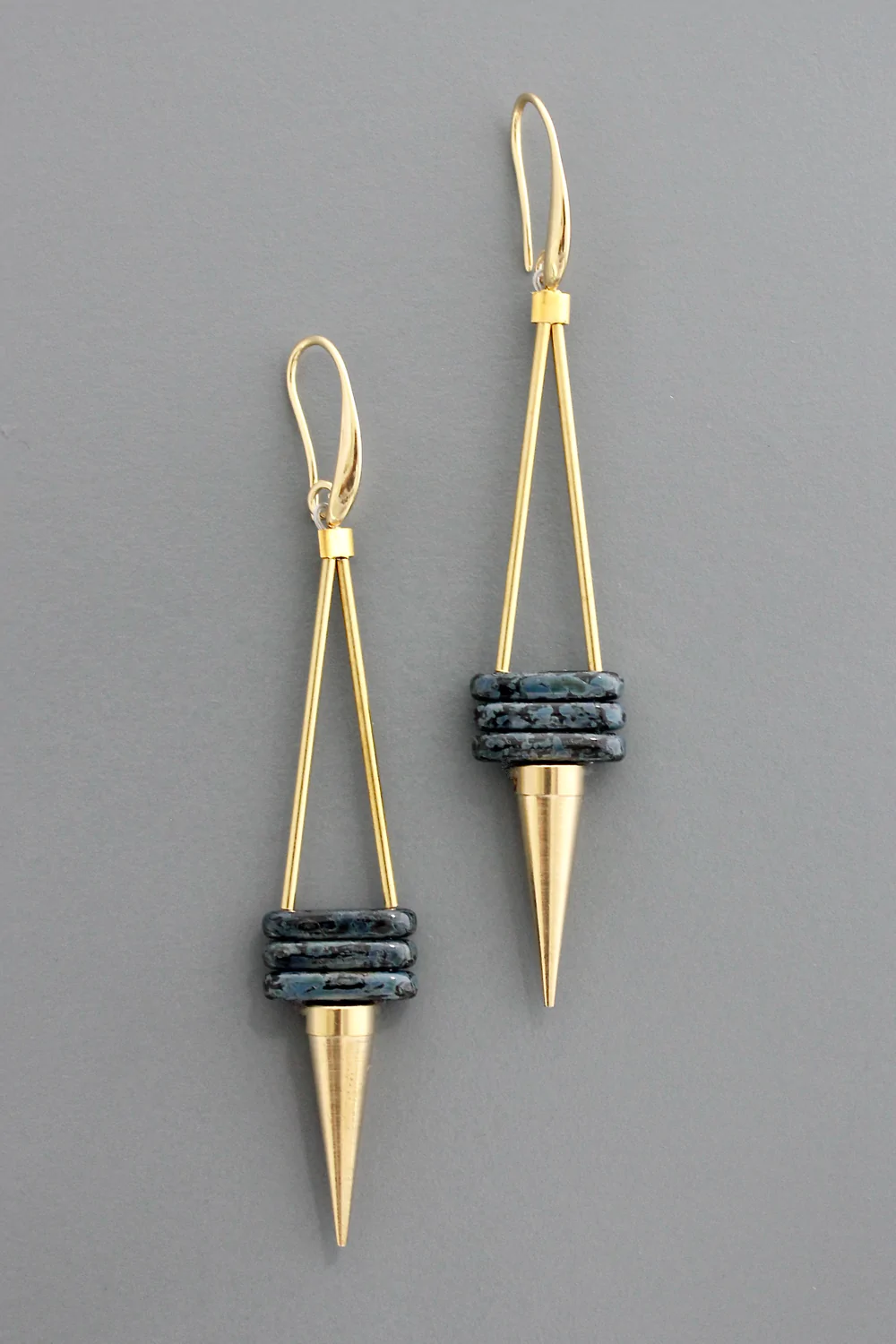 Gold plated brass hooks with czech glass and brass spikes. Each earring weighs .195 oz. and measures 3.5 inches long.