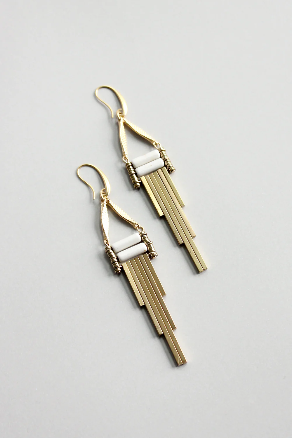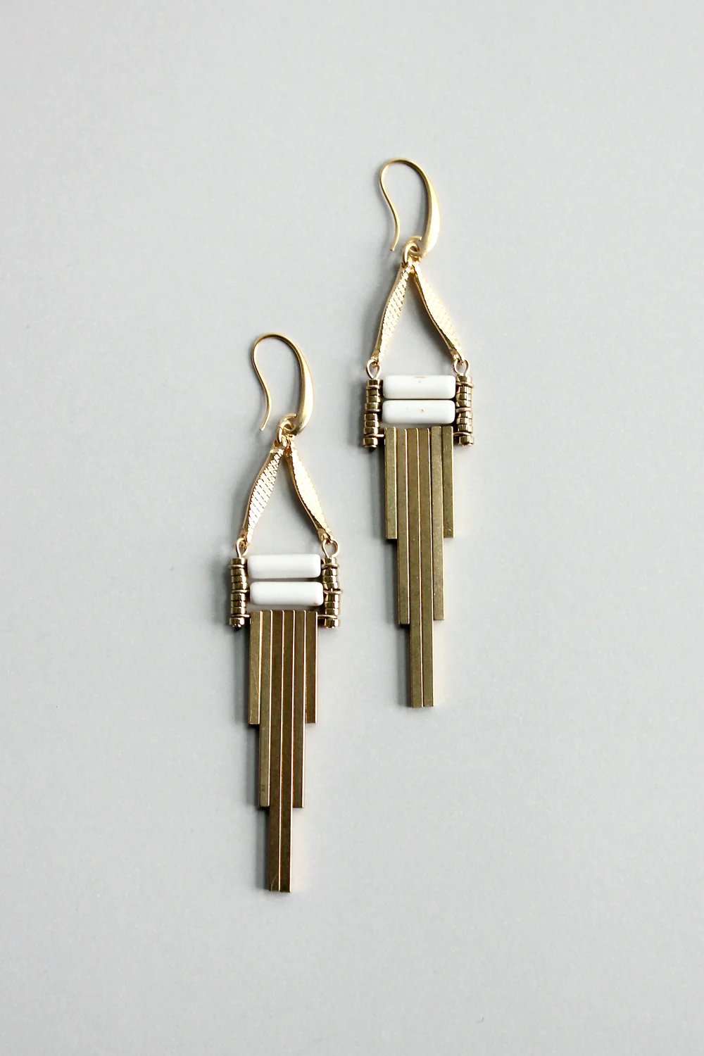 18k gold plated brass hook earrings with magnesite and brass. Each earring weighs .35 oz and measures 4 inches.