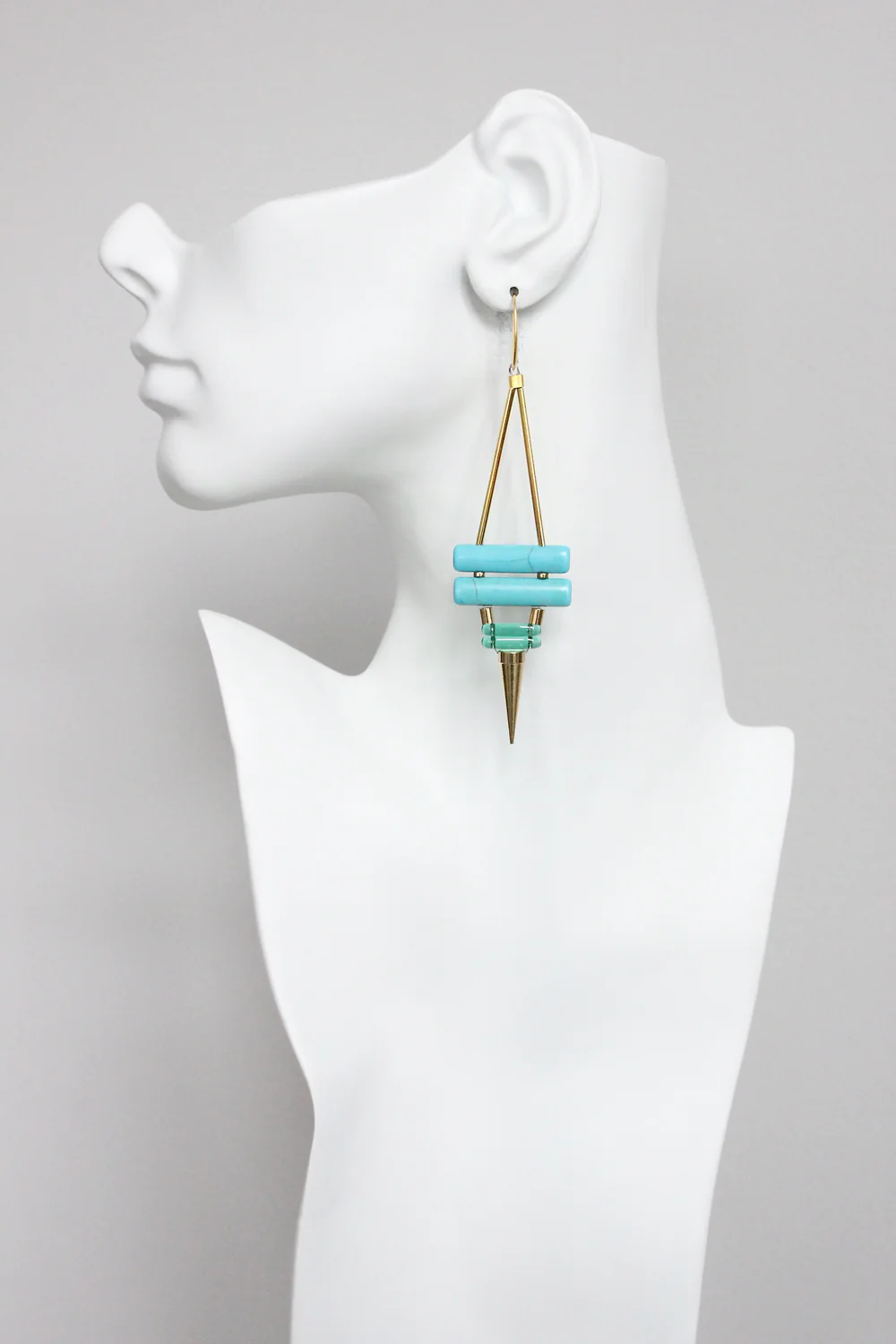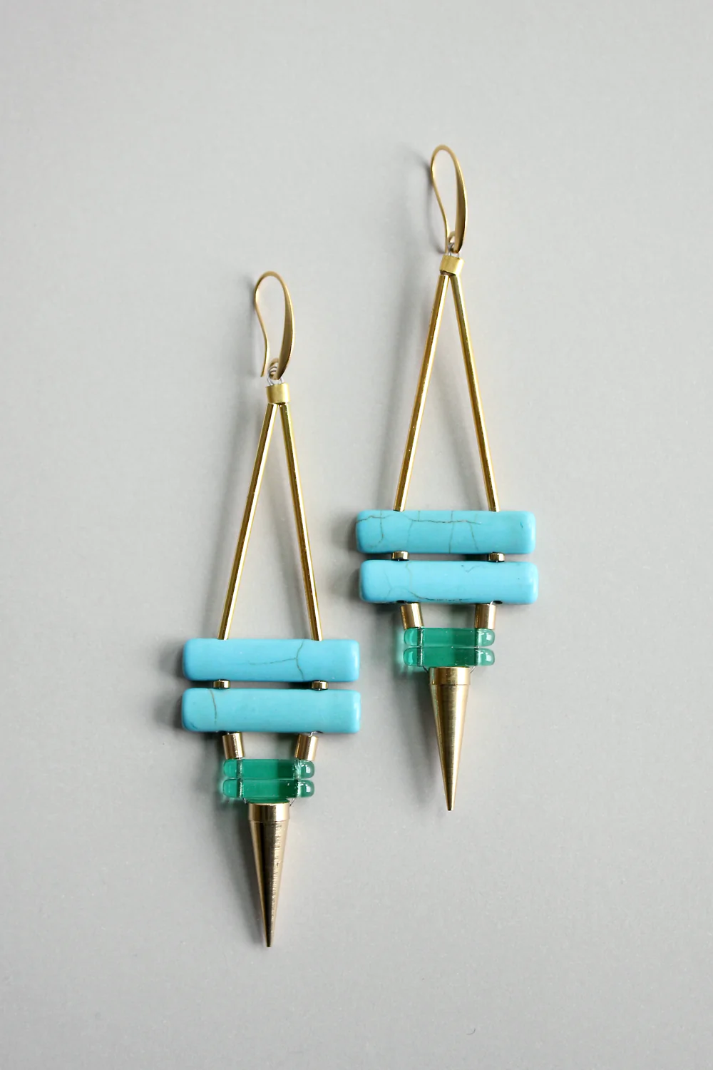18k gold plated brass hook earrings with glass and magnesite. Each earring weighs .32 oz and measures 4.5 inches.