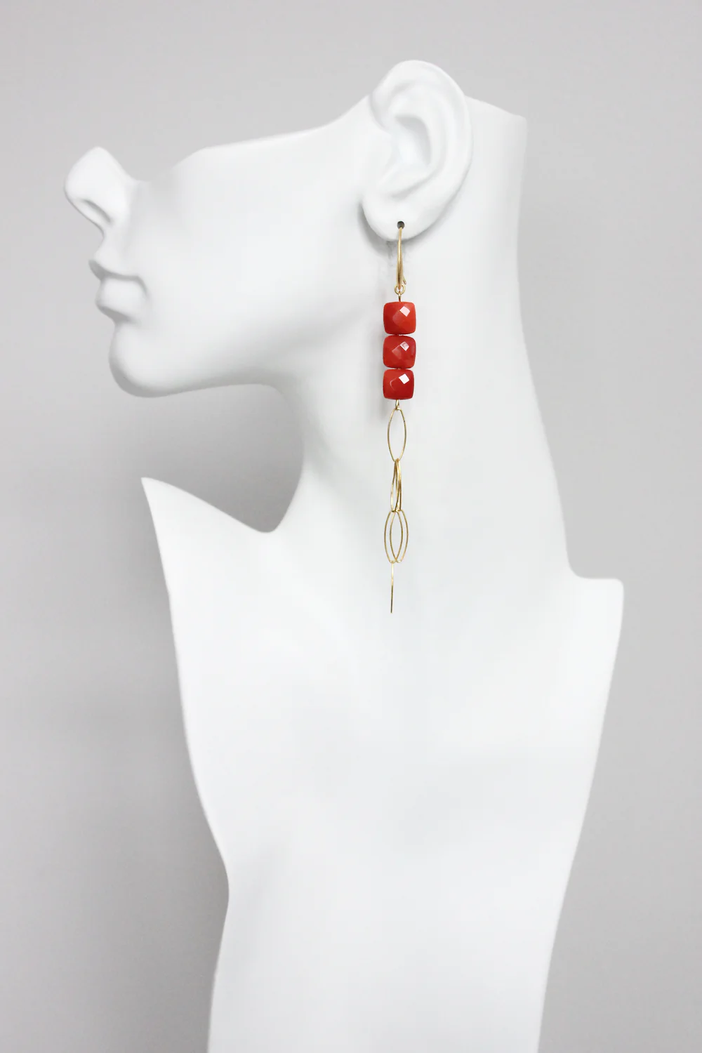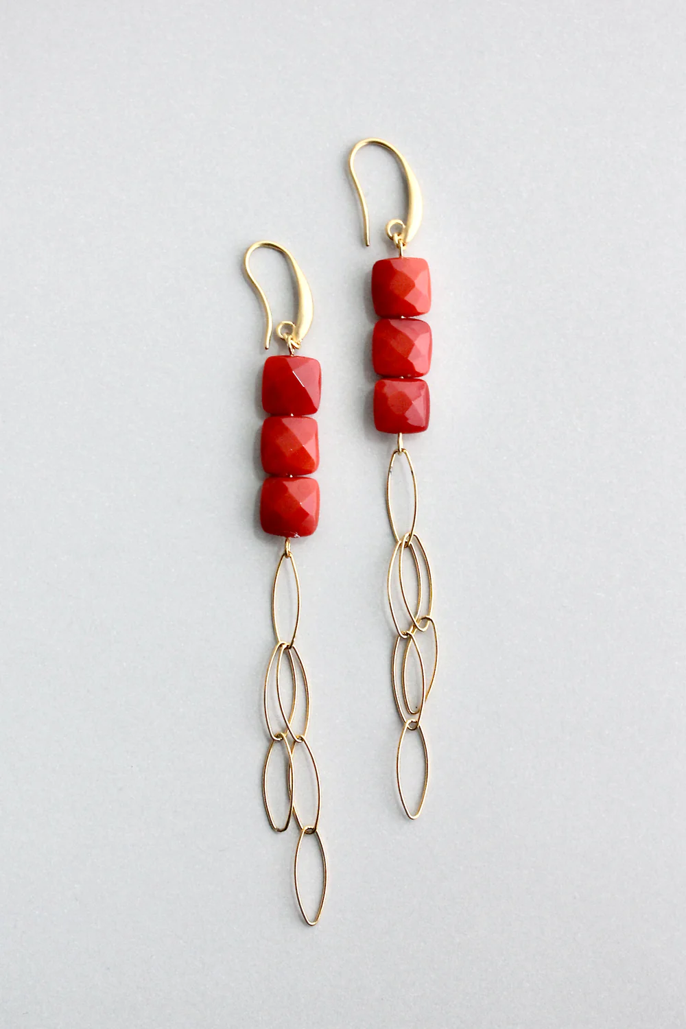 18k gold plated brass hook earrings with agate and gold plated fringe chain. Each earring weighs .13 oz and measures 4.75 inches.