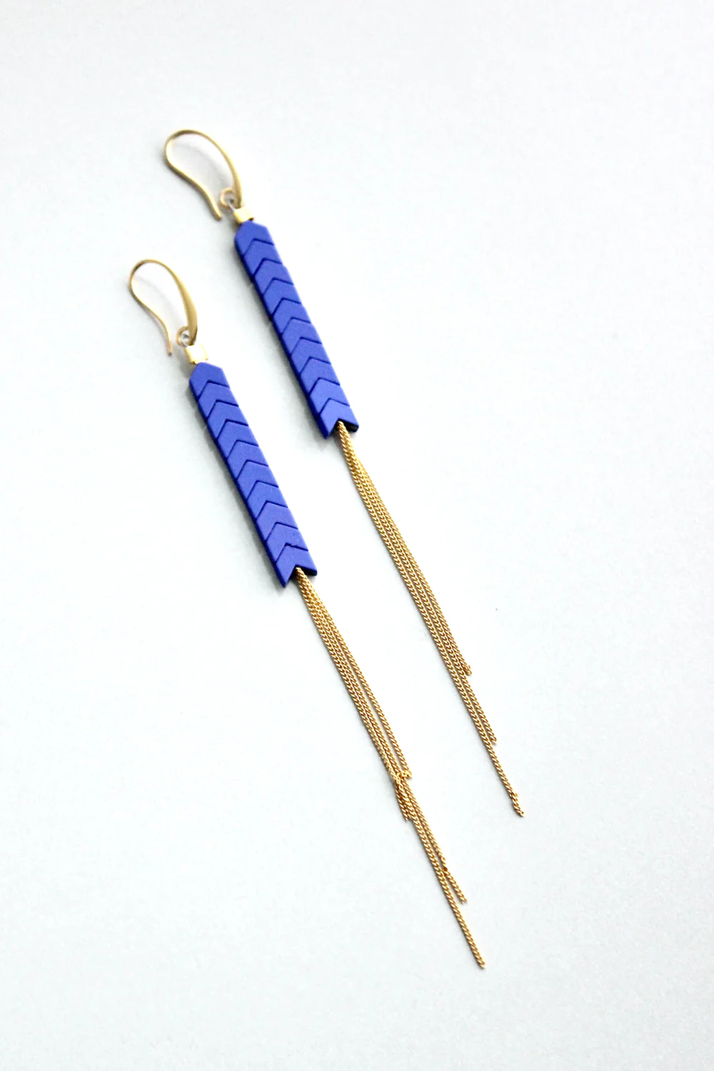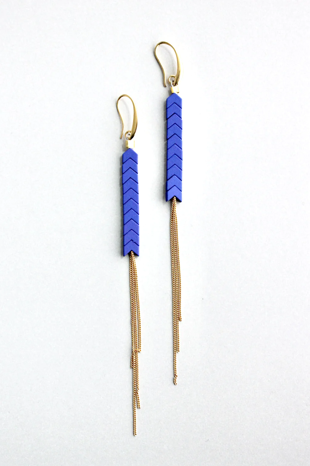 18k gold plated brass hook earrings with plated hematite and chain fringe. Each earring weighs .13 oz and measures 5.5 inches.