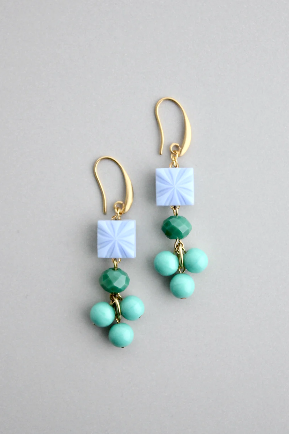 18k gold plated brass hook earrings with vintage glass. Each earring weighs .22 oz and measures 2 5/8 inches.