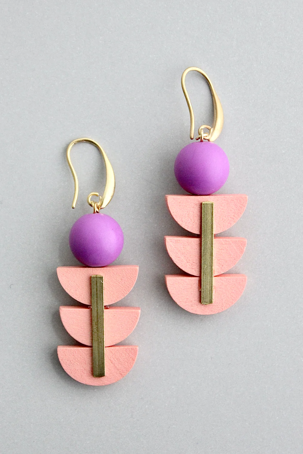 18k gold plated brass hook earrings with painted wood and acrylic. Each earring weighs .15 oz and measures 2.5 inches.