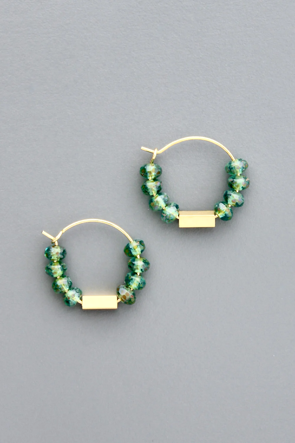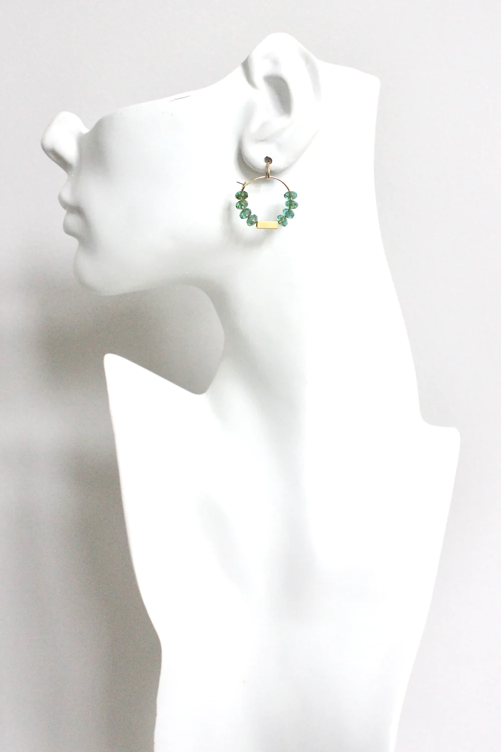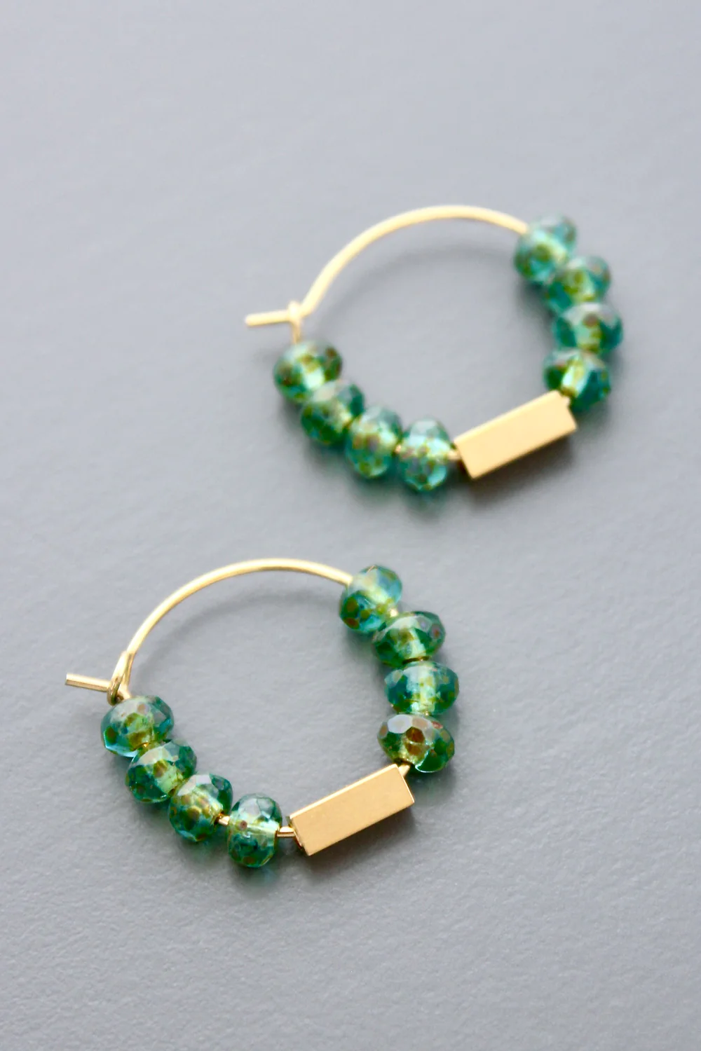18k gold plated brass hoops with Czech green Picasso glass and brass. Each half pair weighs .05 ounces and measures .75 inches.