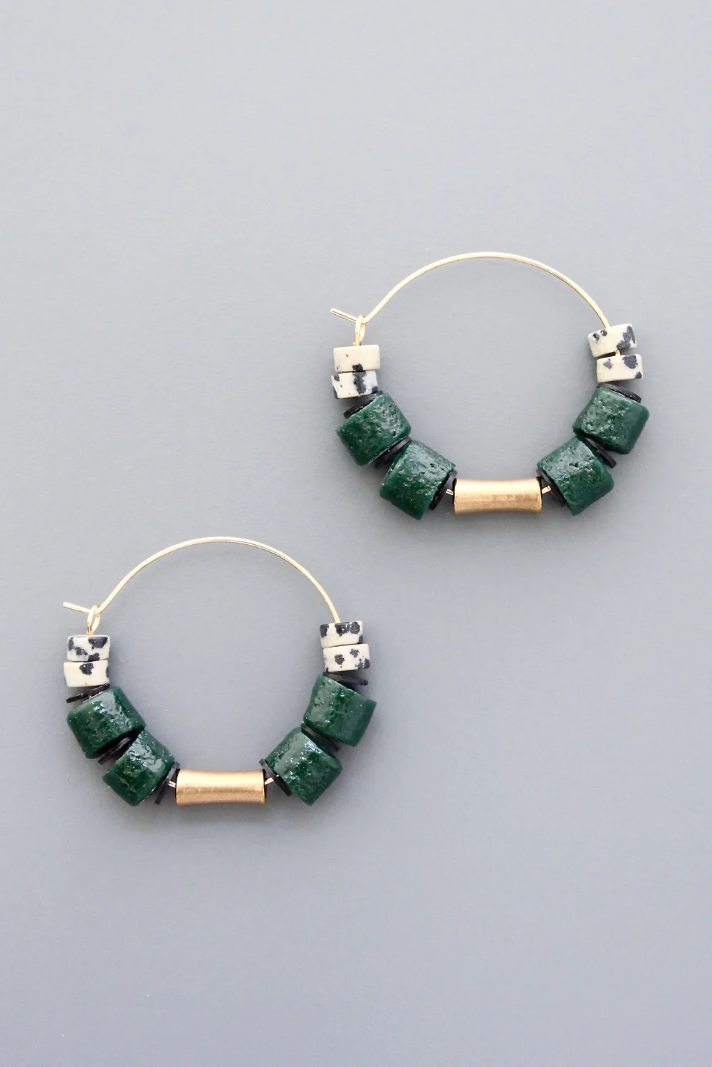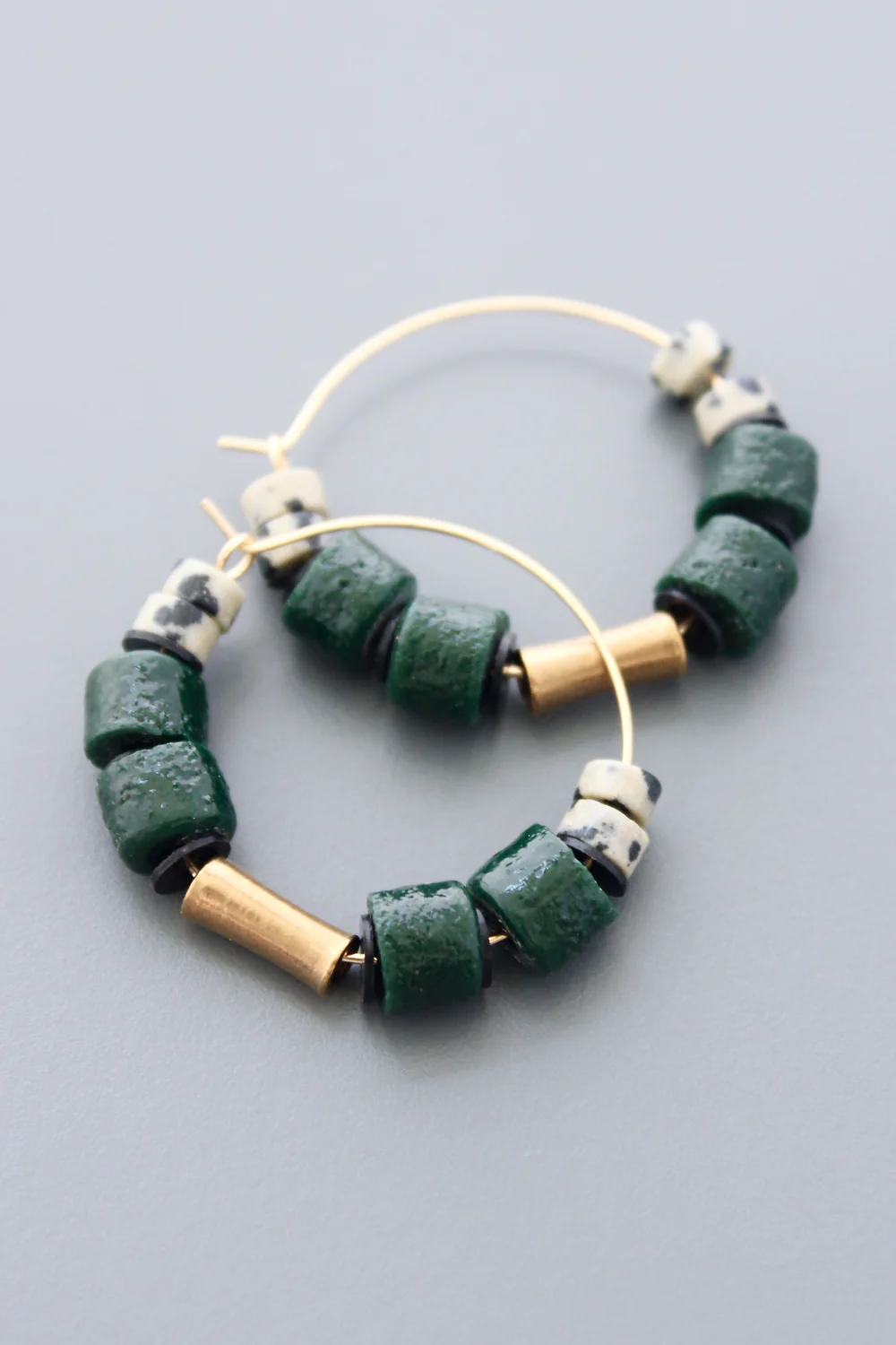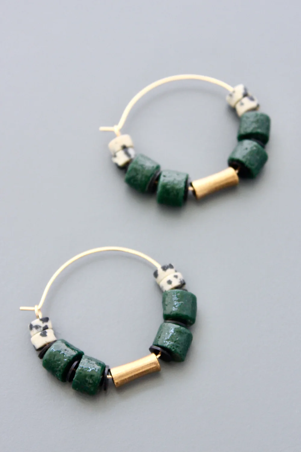 18k gold plated brass hoops with green Ghana glass, Dalmatian jasper, and brass. Each half pair weighs .23 oz and measures 1.5 inches.