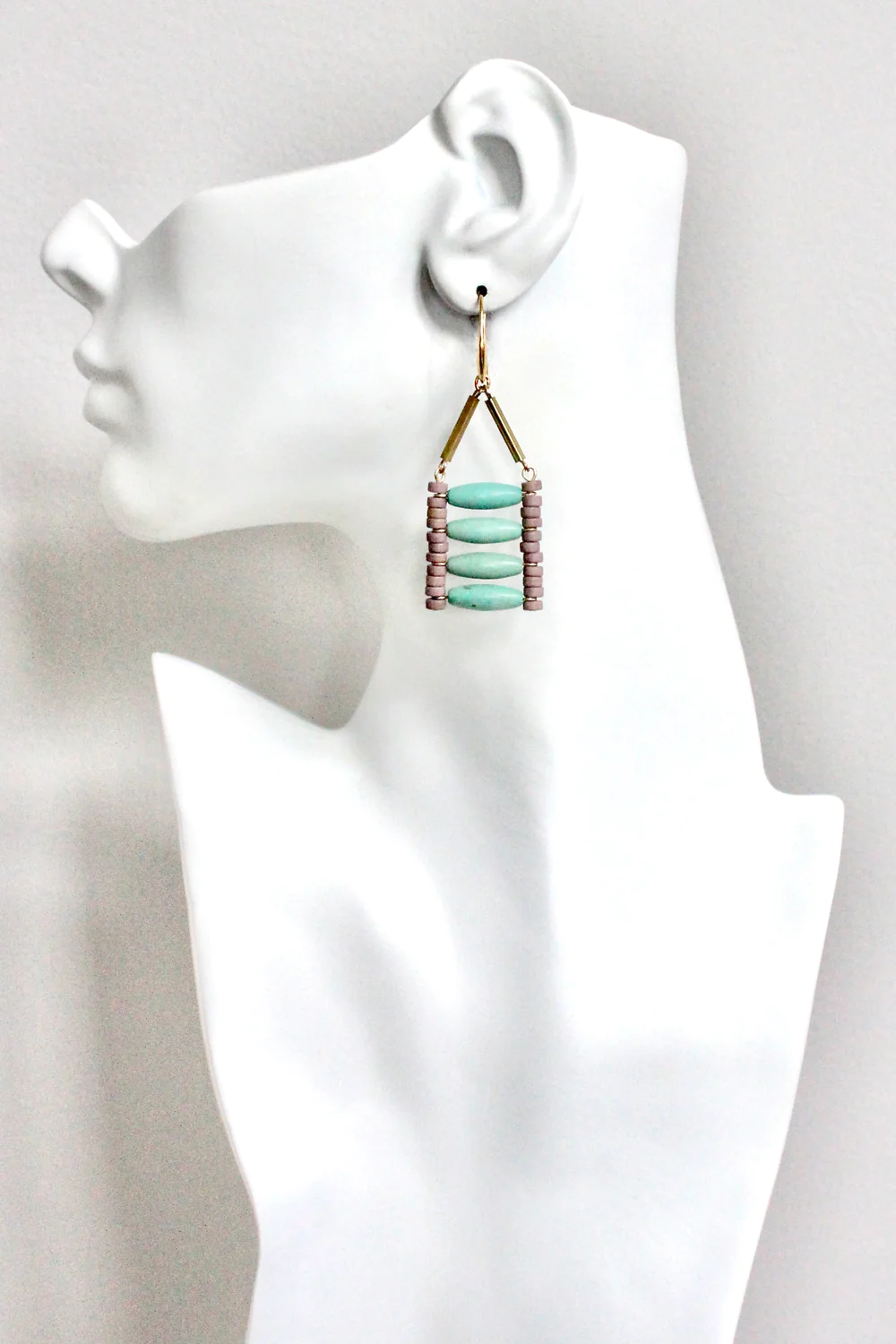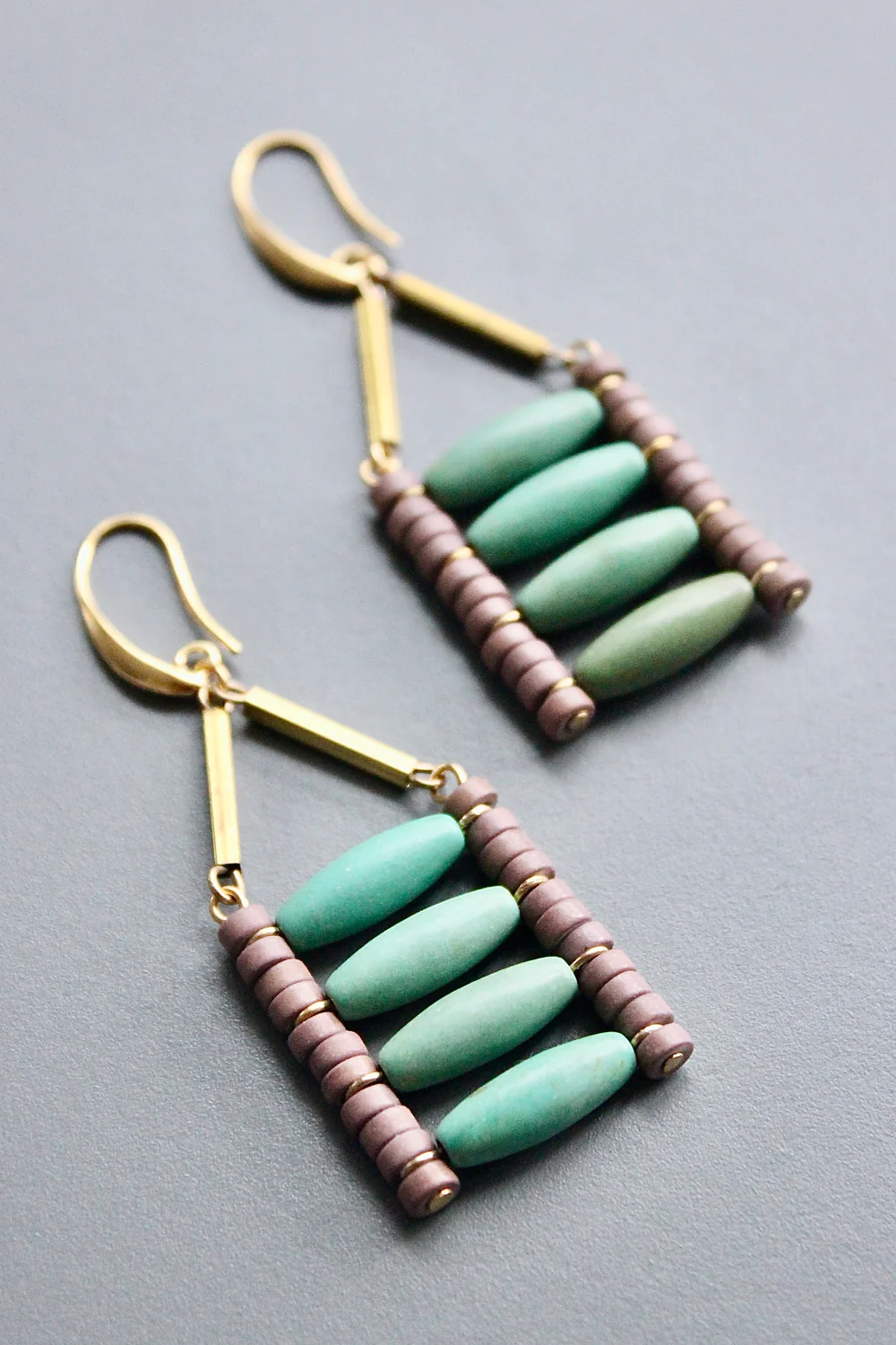 18k gold plated brass hooks with turquoise and gray magnesite. Each half pair weighs .21 oz and measures 2.75 inches.