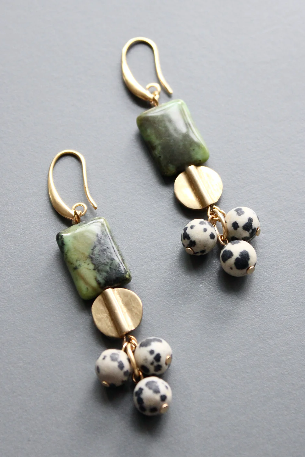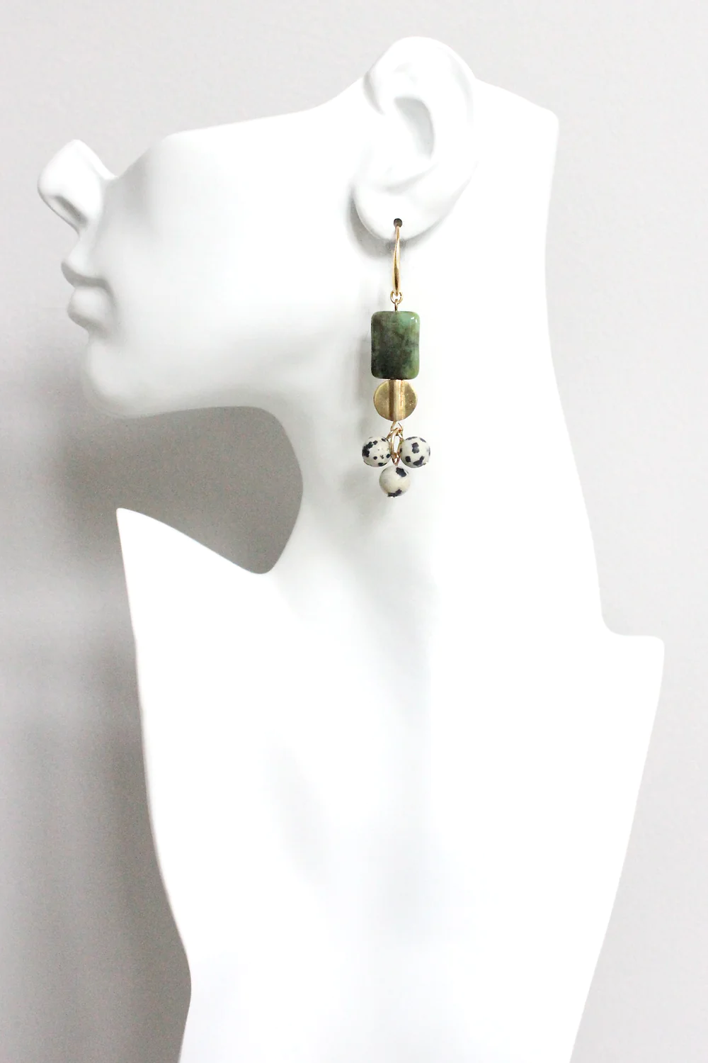 18k gold plated brass hooks with green jasper and dalmatian jasper. Each half pair weighs .26 oz and measures 2.875 inches
