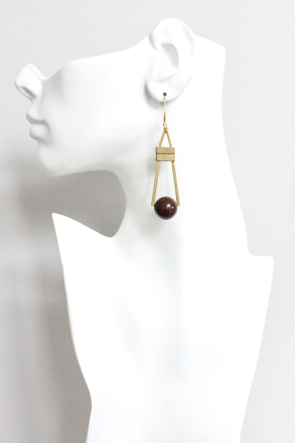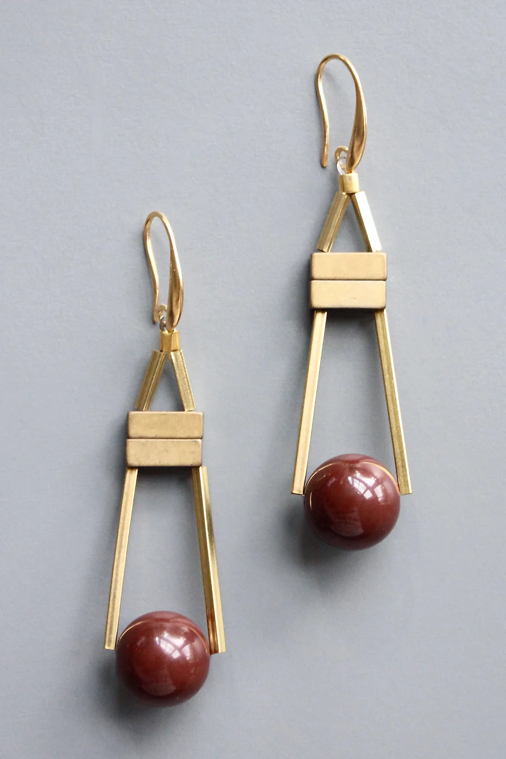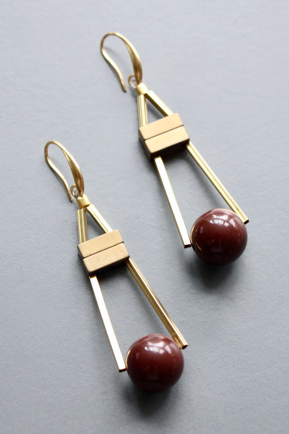 18k gold plated brass hooks with chocolate acrylic baubles and plated hematite. Each half pair weighs .22 oz and measures 3.125 inches