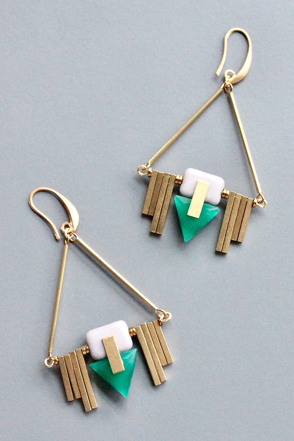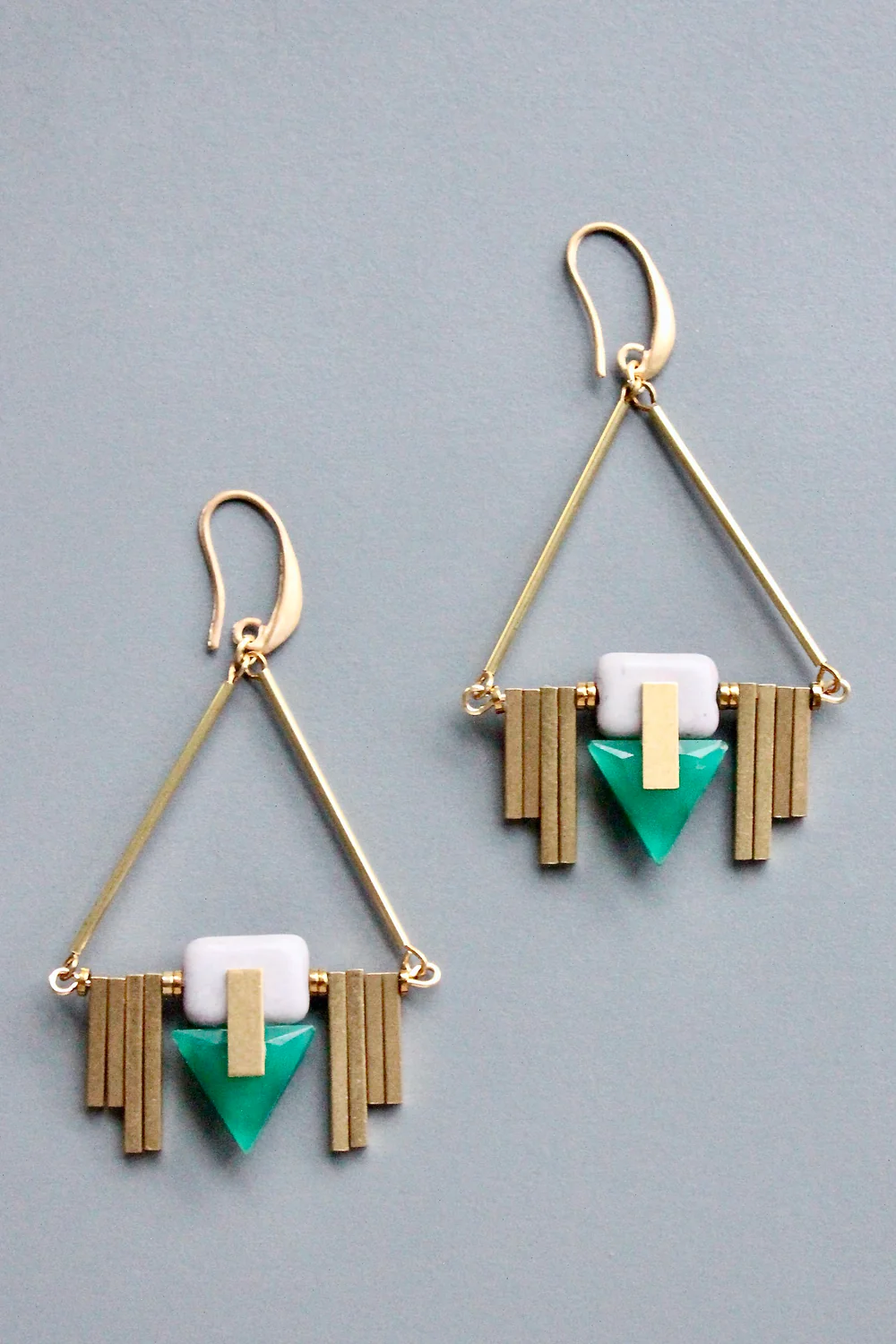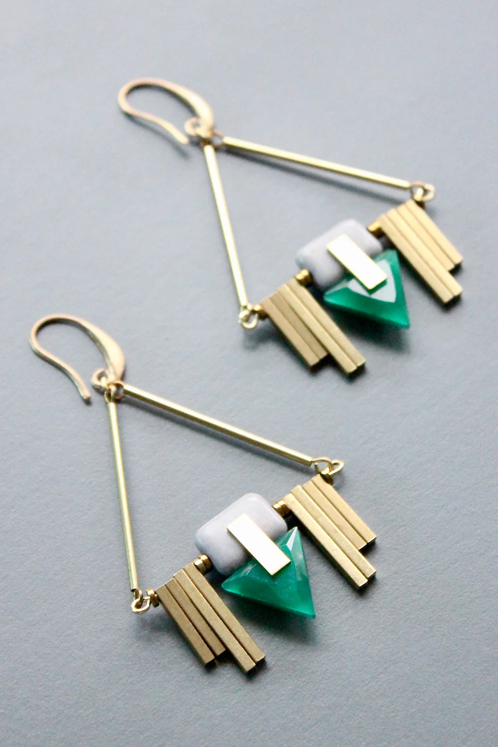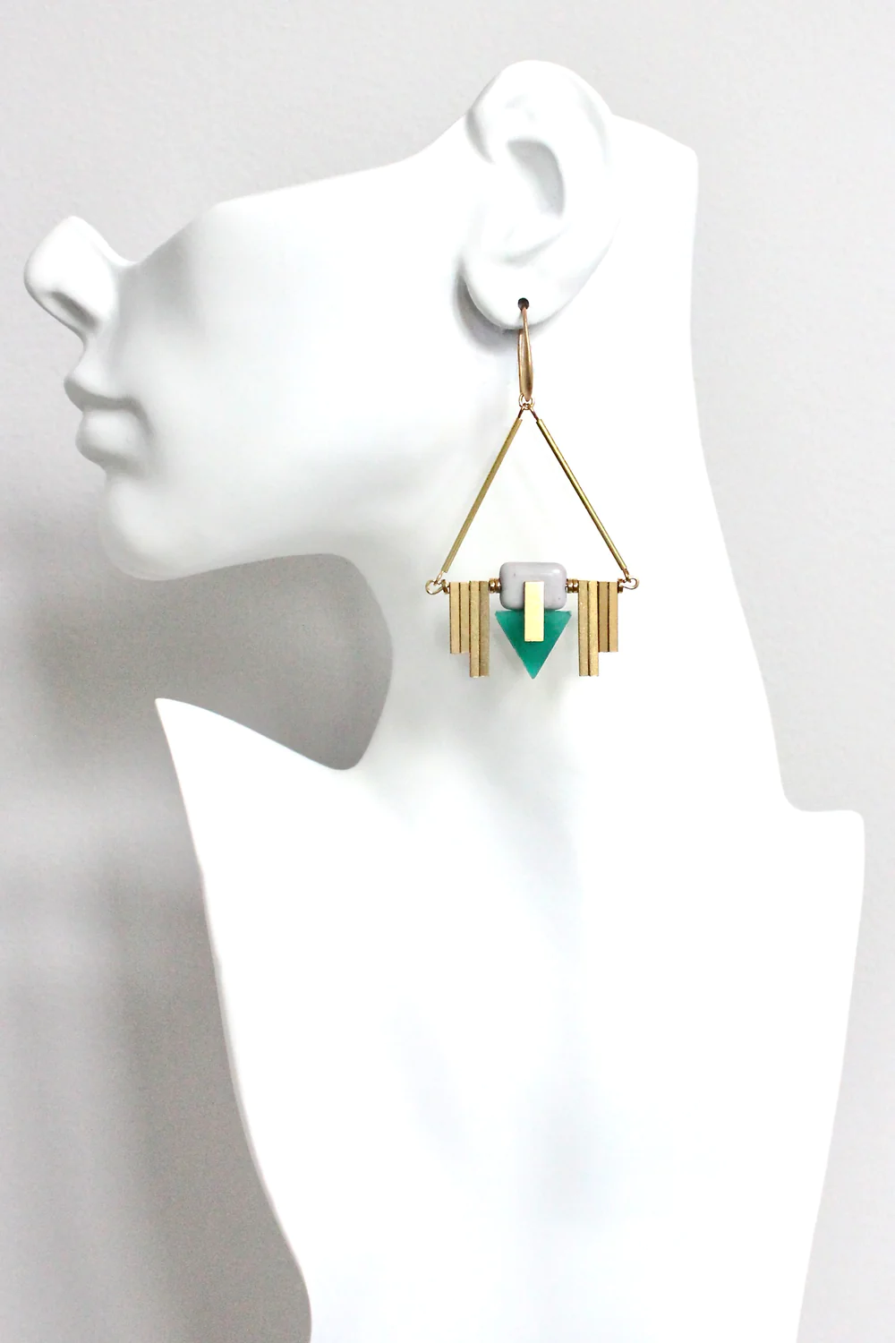 18k gold plated brass hooks with vintage green glass triangles, gray magnesite, and brass. Each half pair weighs .34 oz and measures 3 inches