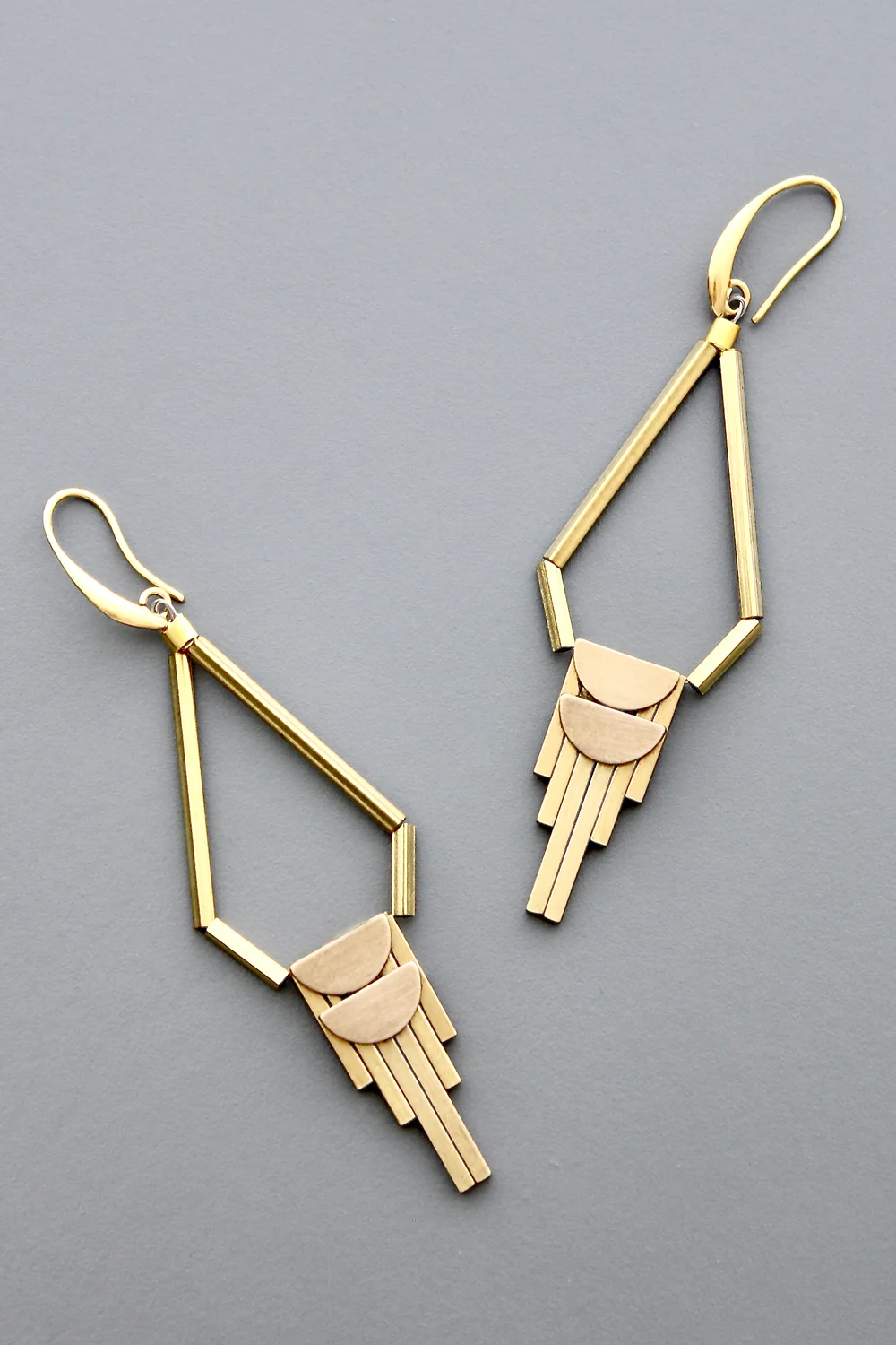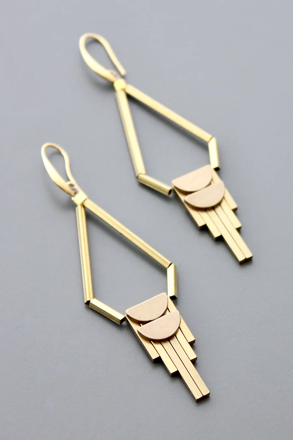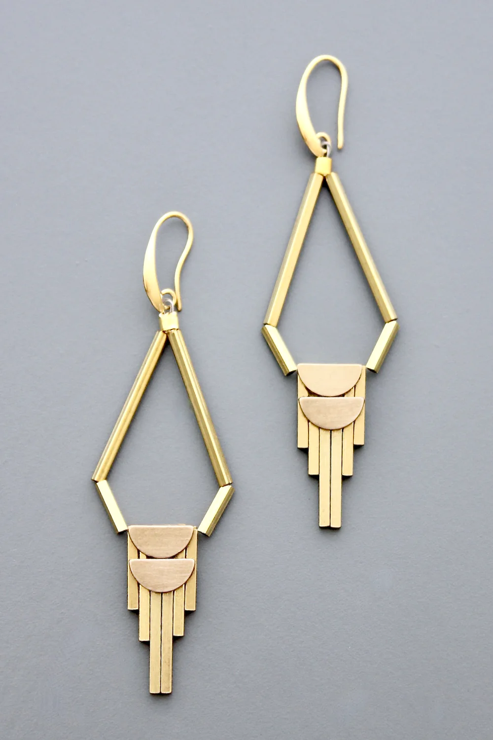 18k gold plated brass hooks with artdeco brass drop. Each half pair weighs .26 oz and measures 3.5 inches