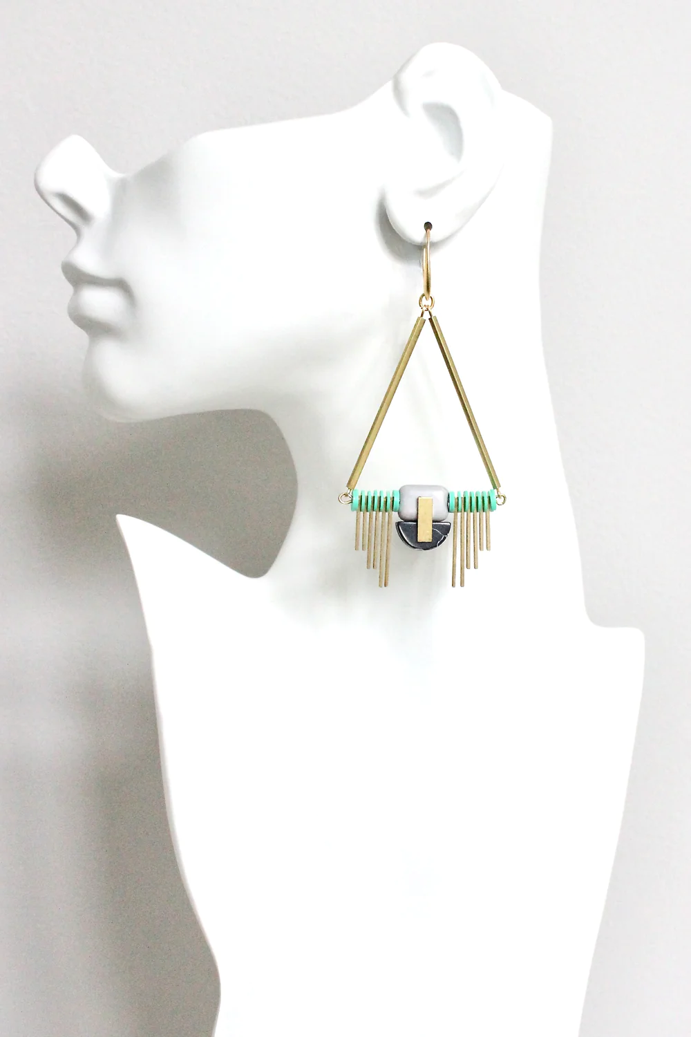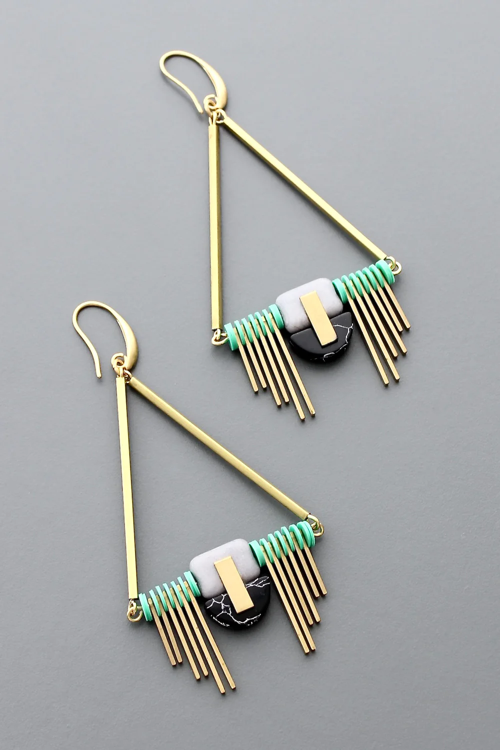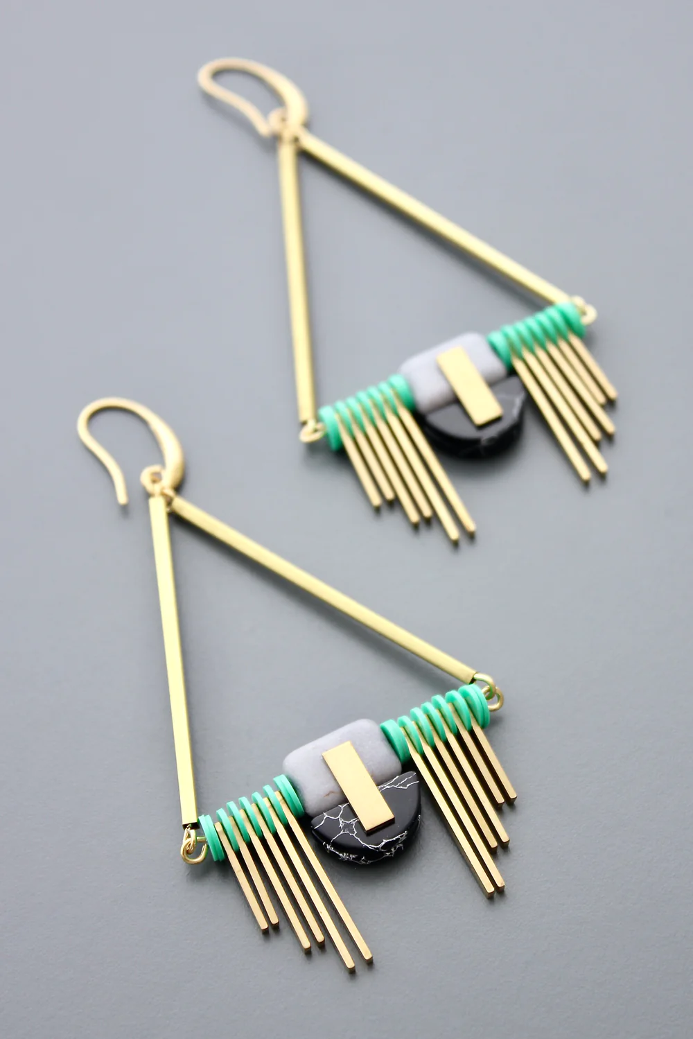 18k gold plated brass hooks with green vinyl, gray magnesite, and synthetic howlite. Each half pair weighs .32 oz and measures 3.75 inches