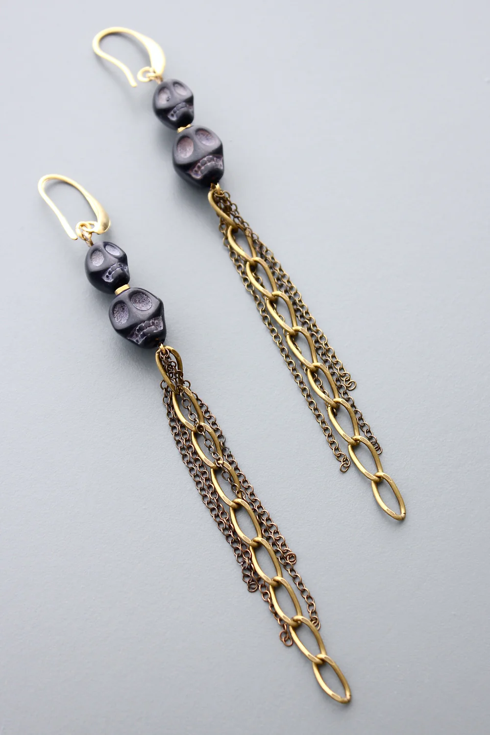 18k gold plated brass hooks with black magnesite skulls and oxidized brass chain. Each half pair weighs .19 oz and measures 4.75 inches