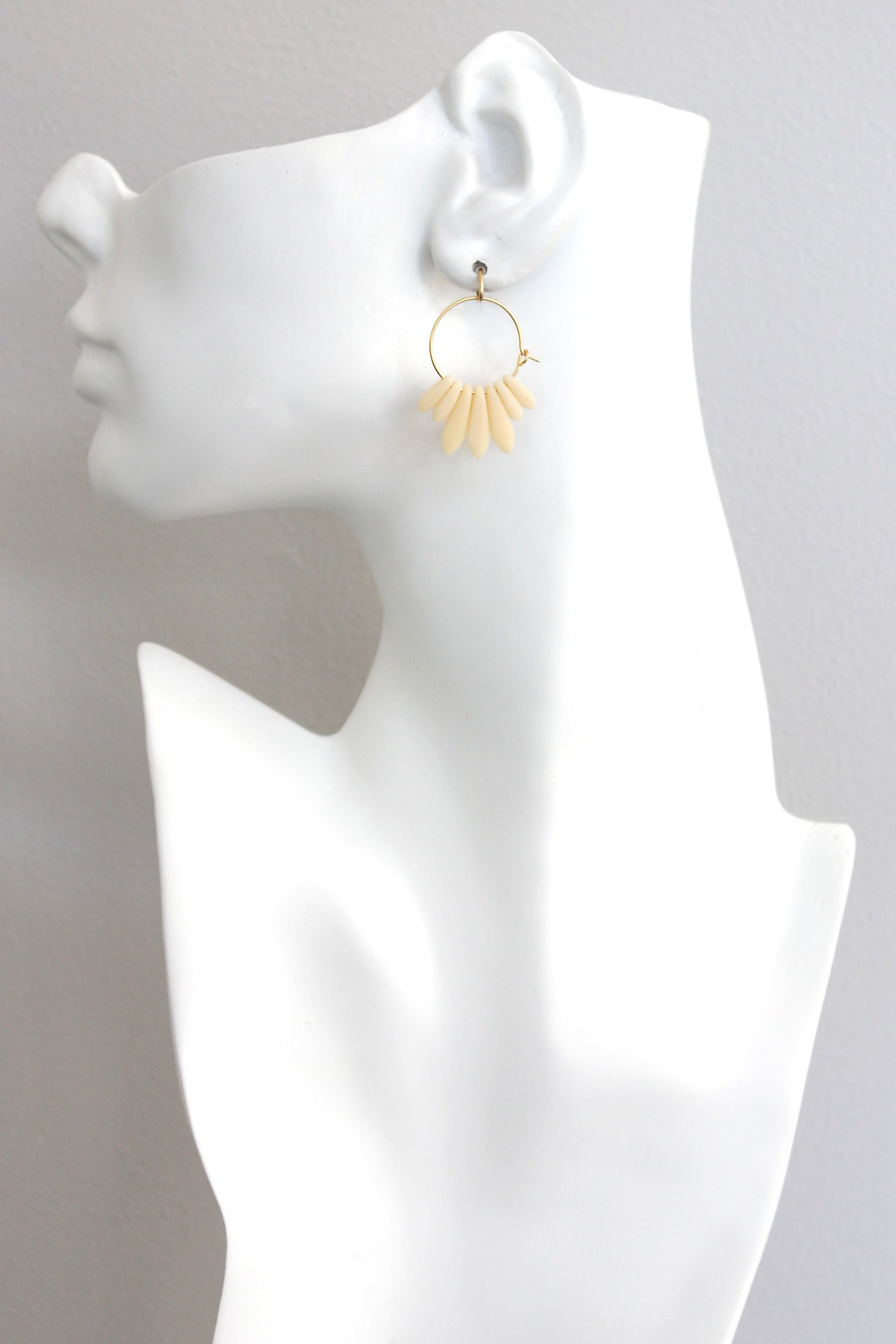 Gold color plated hoop earrings with matte cream colored glass. Each earring weighs .055oz and measures 1.375in