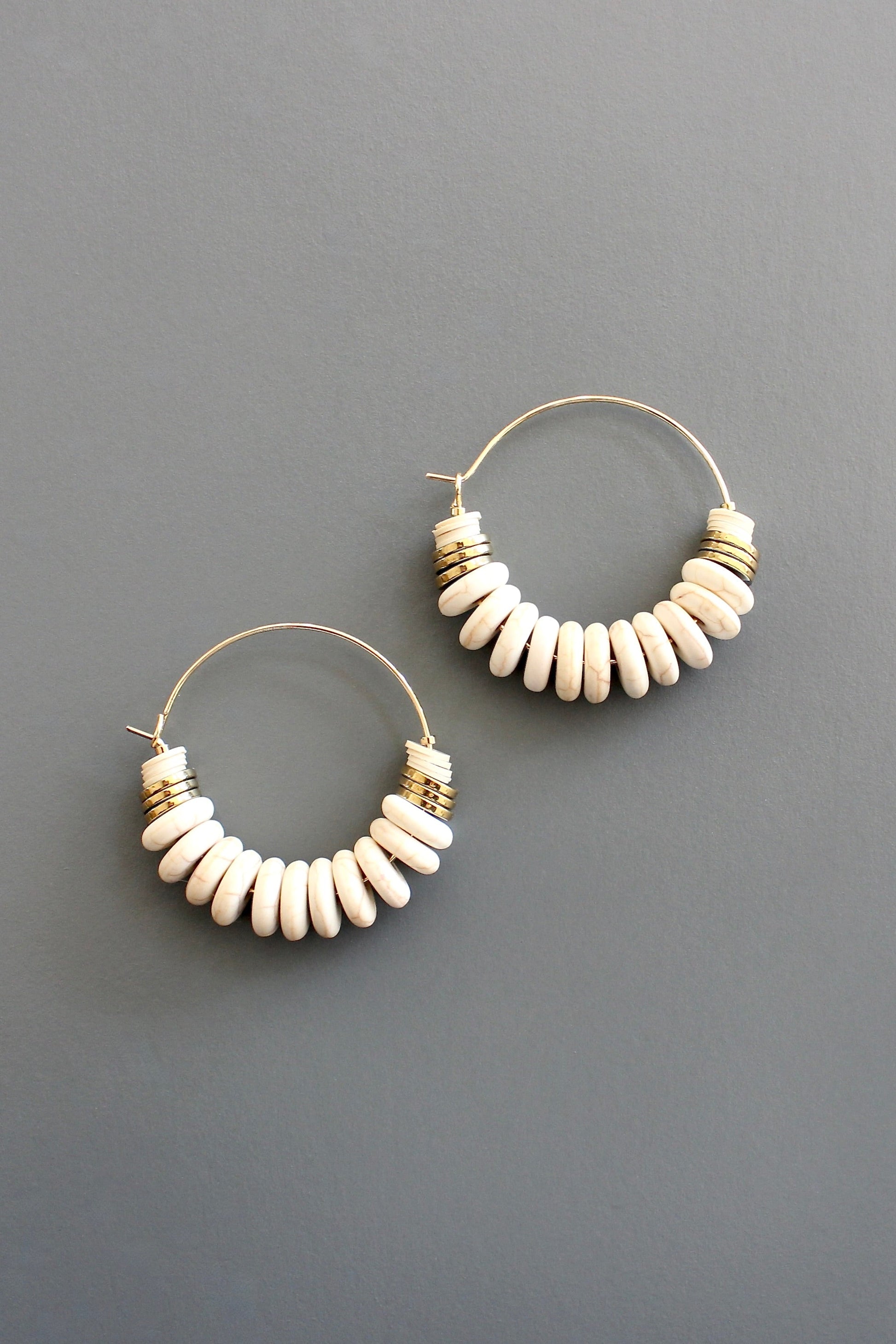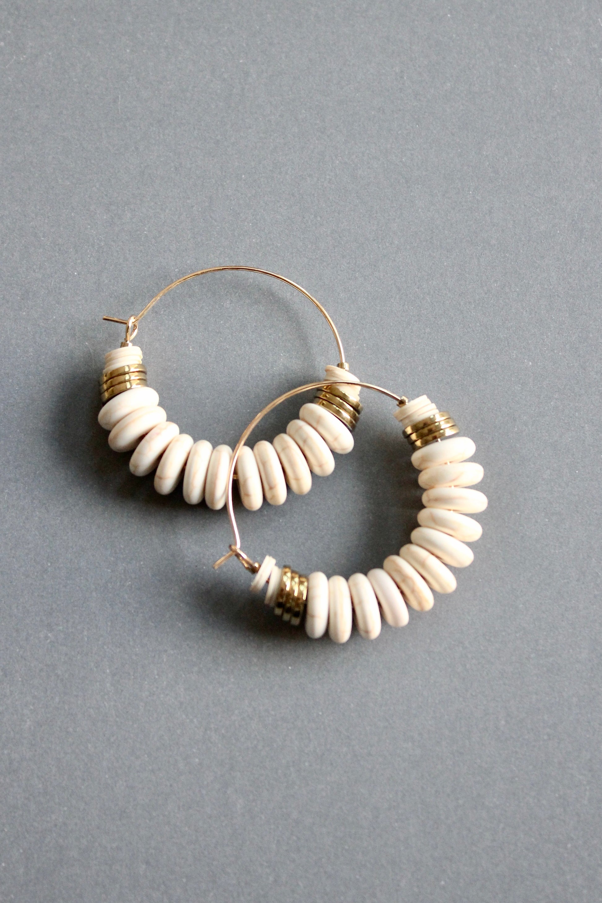 Gold color plated hoop earrings with magnesite, gold hematite, and brass beads. Each earring weighs .29oz and measures 1.625in