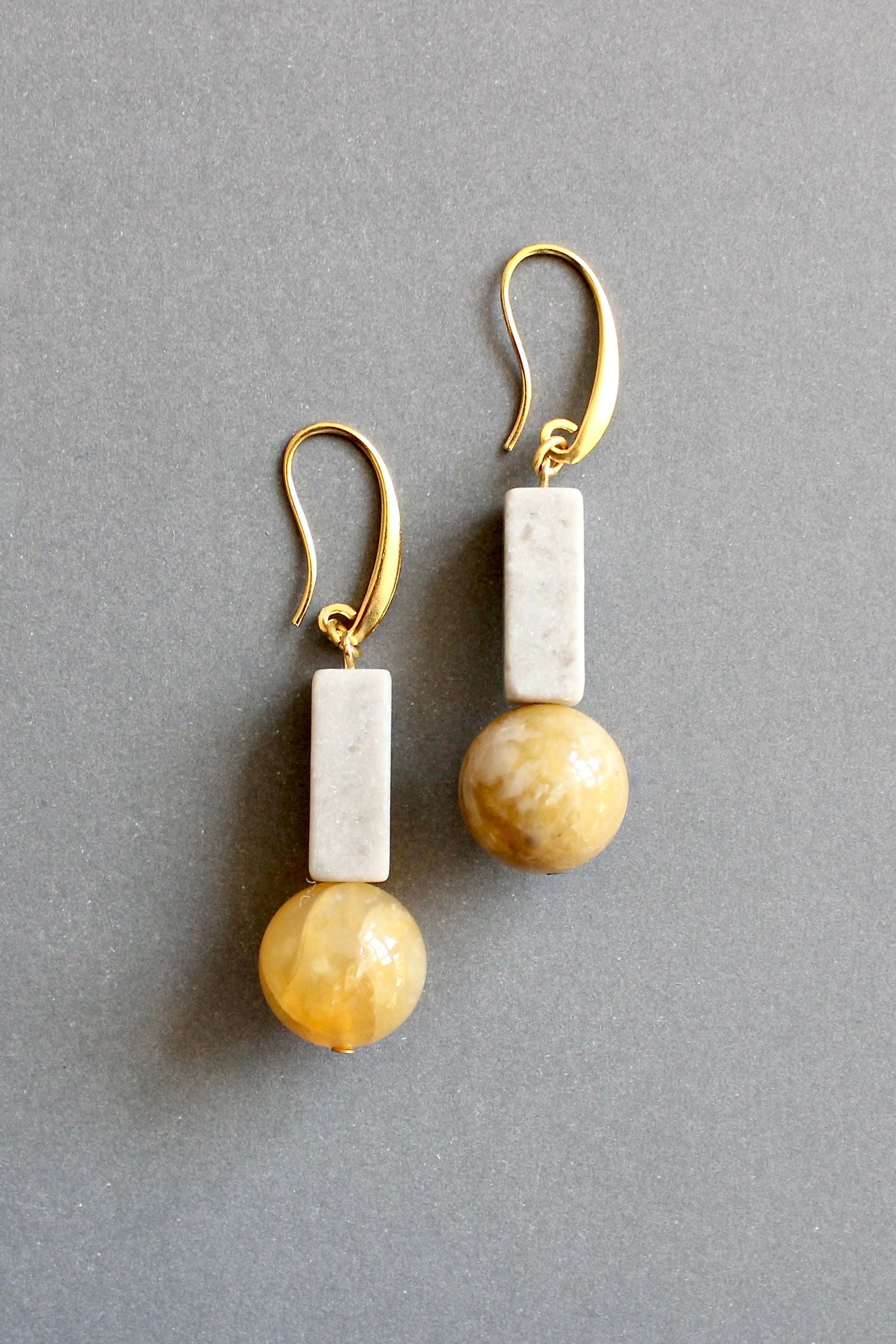 18k gold plated brass earrings with dyed jade. Each earring weighs .23oz and measures 2.25in from top of hook.