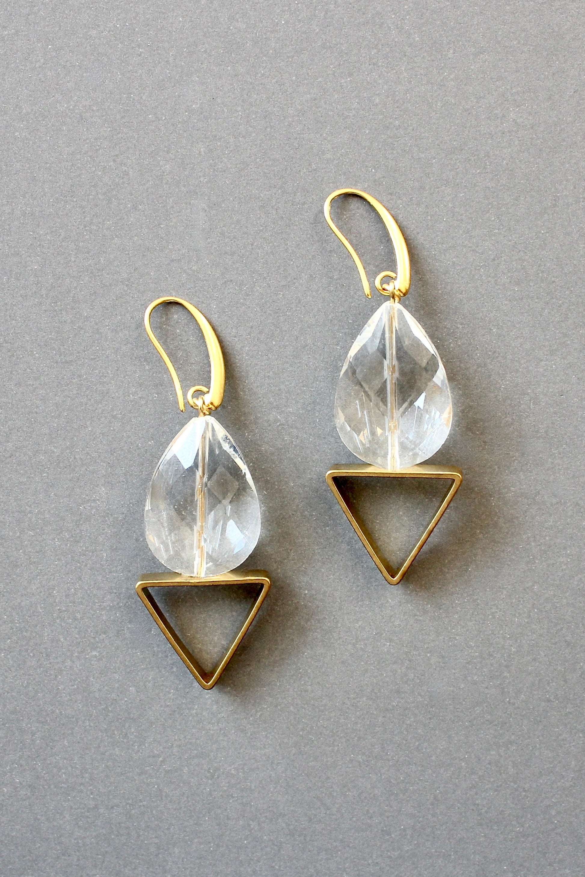 18k gold plated brass earrings with glass and brass. Each earring weighs .23oz and measures 2.5in from top of hook.
