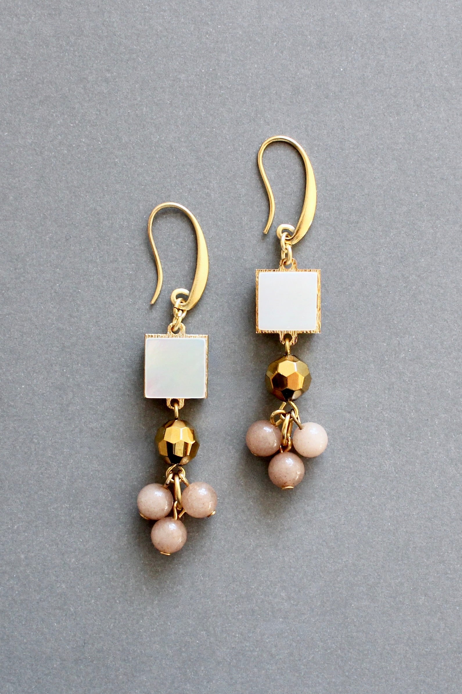 18k gold plated brass earrings with mother-of-pearl, glass, and dyed jade. Each earring weighs .15oz and measures 2.5in from top of hook.