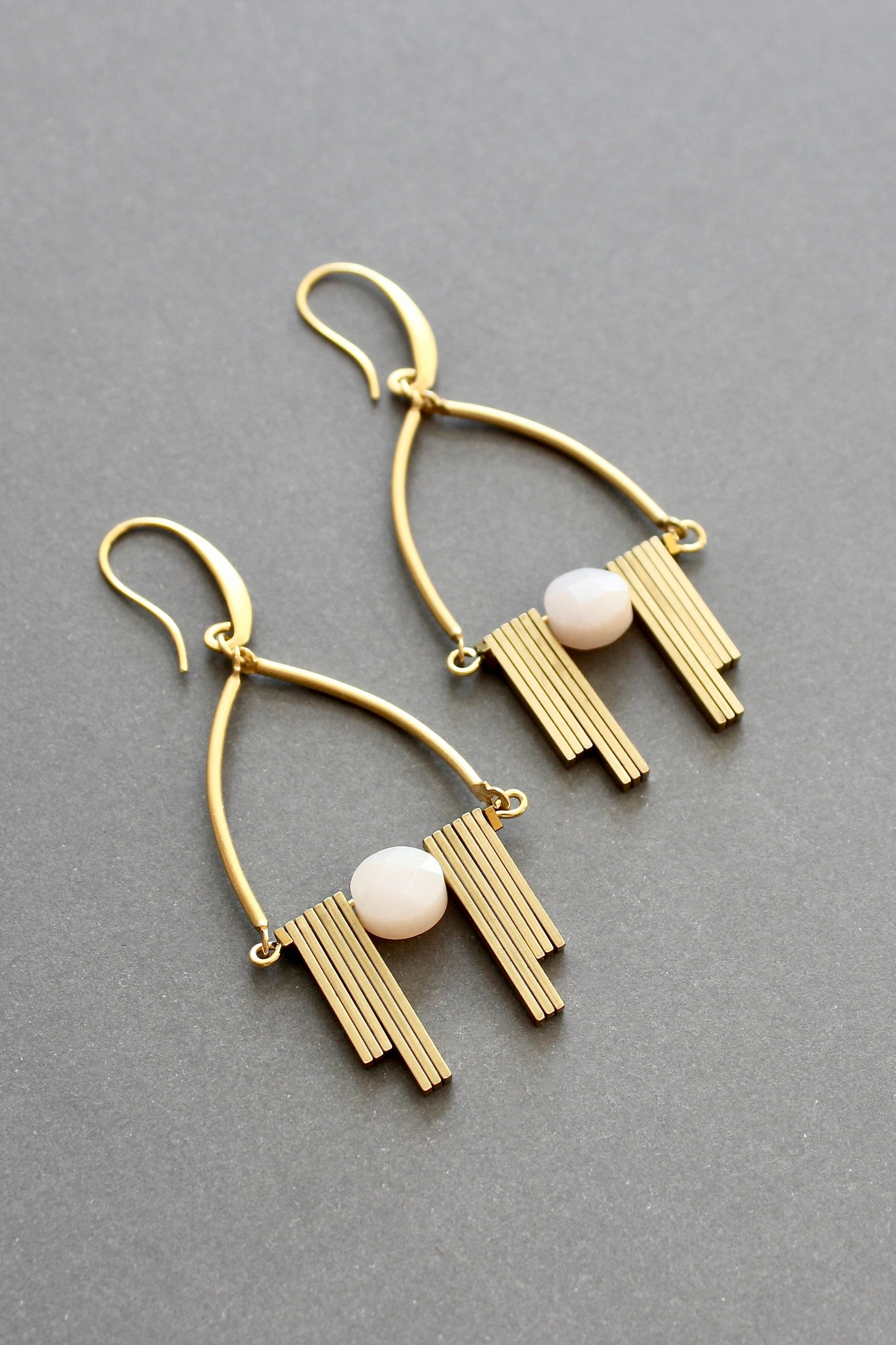 18k gold plated brass earrings with pink agate and brass bars. Each earring weighs .185 and measures 2.75in from top of hook.