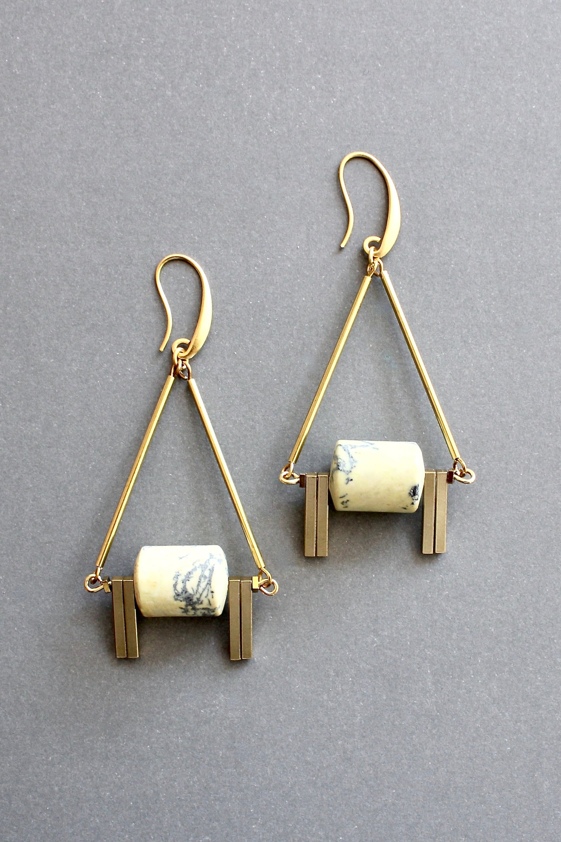 18k gold plated brass earrings with yellow turquoise and brass bars. Each earring weighs .23oz and measures 2.875in from top of hook.