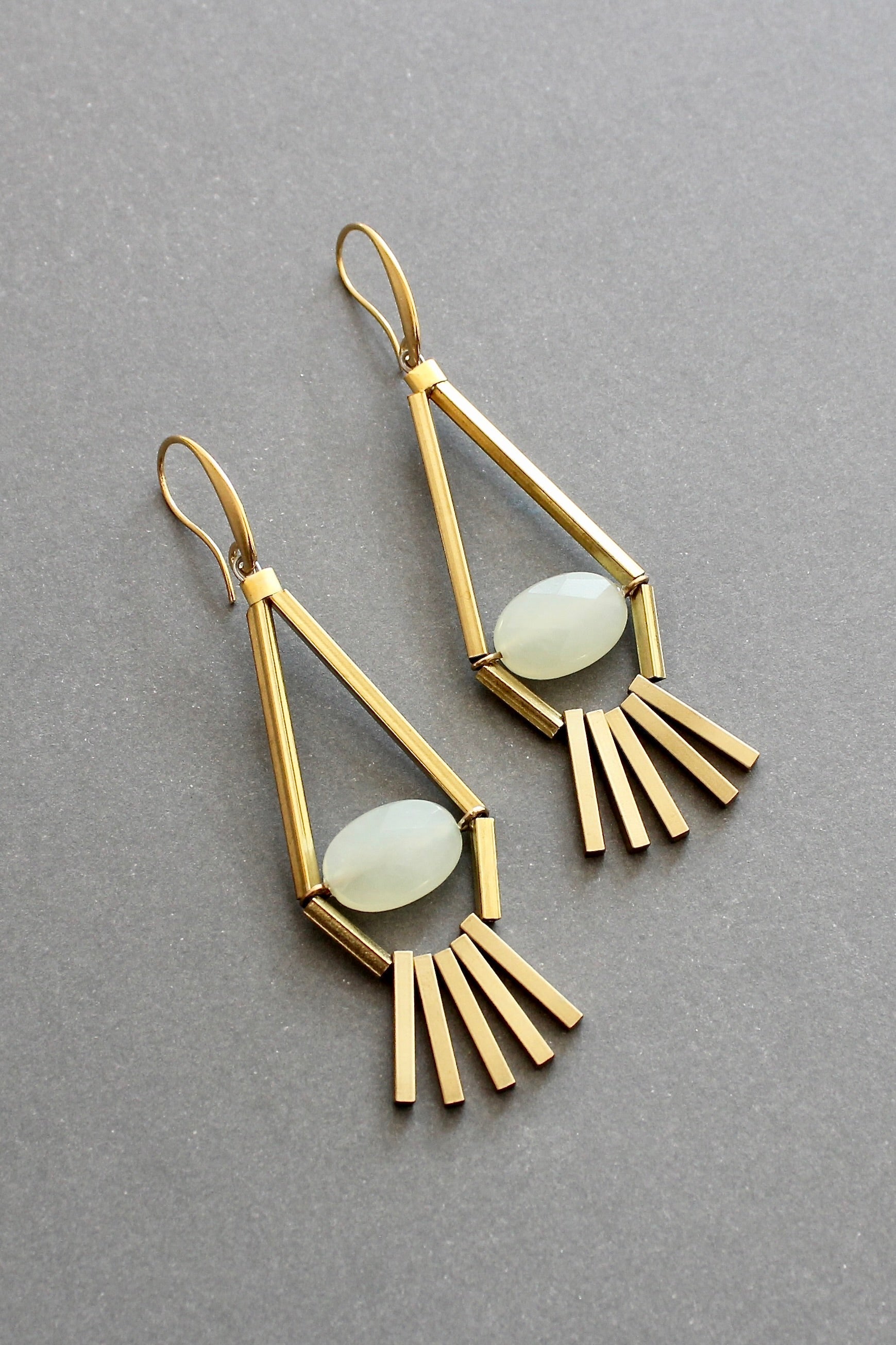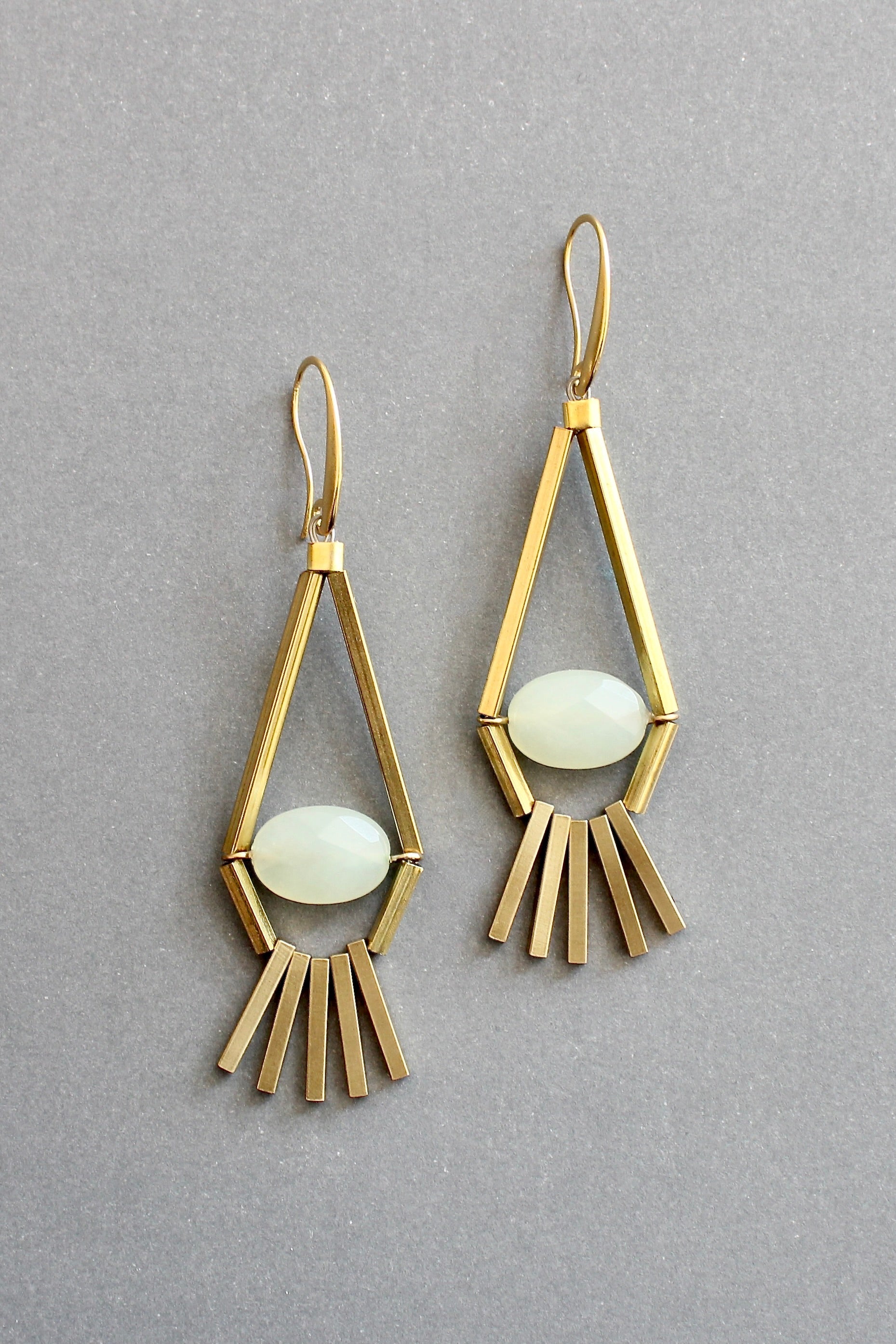 18k gold plated brass earrings with green aventurine and brass bars. Each earring weighs .165oz and measures 3in from top of hook.