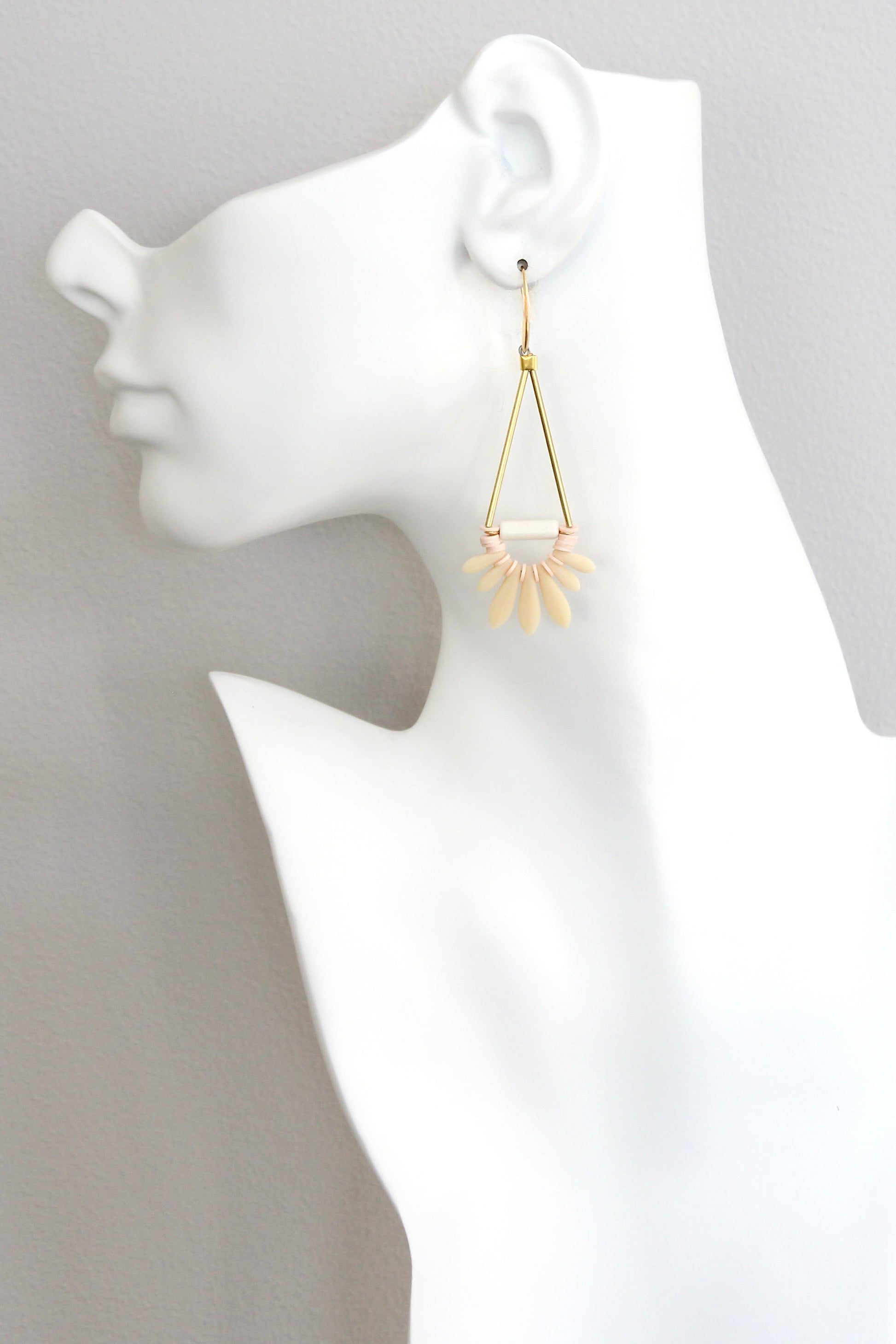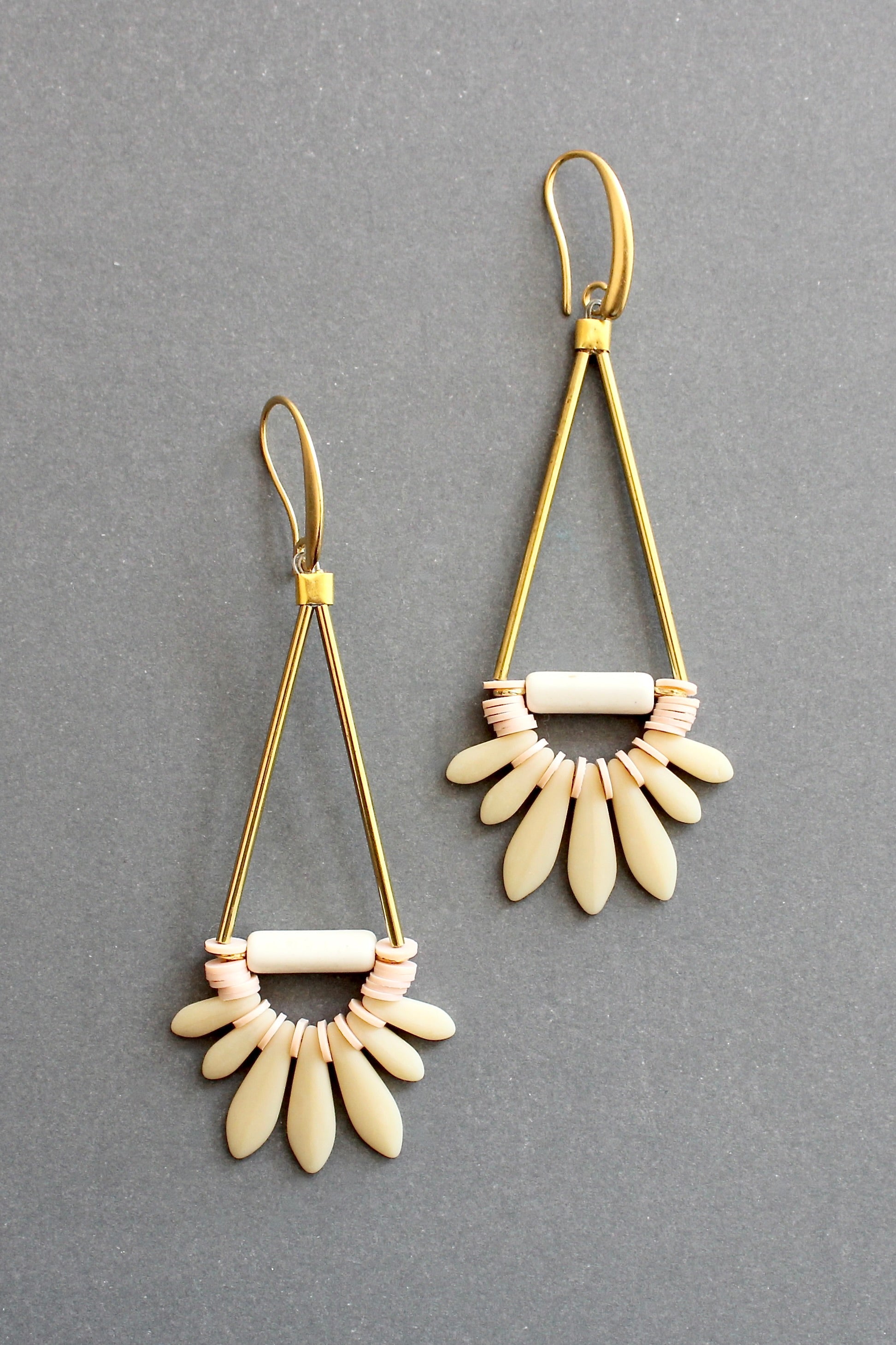 18k gold plated brass earrings with glass, vulcanite, and magnesite. Each earring weighs .105oz and measures 3.125in from top of hook.