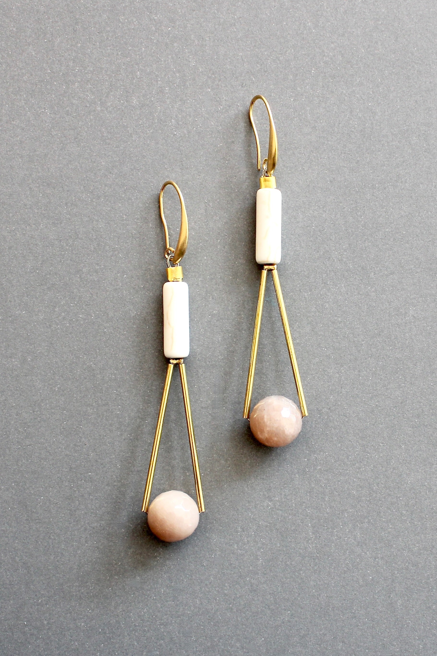 18k gold plated brass earrings with peach moonstone and magnesite. Each earring weighs .14oz and measures 3.375in from top of hook.