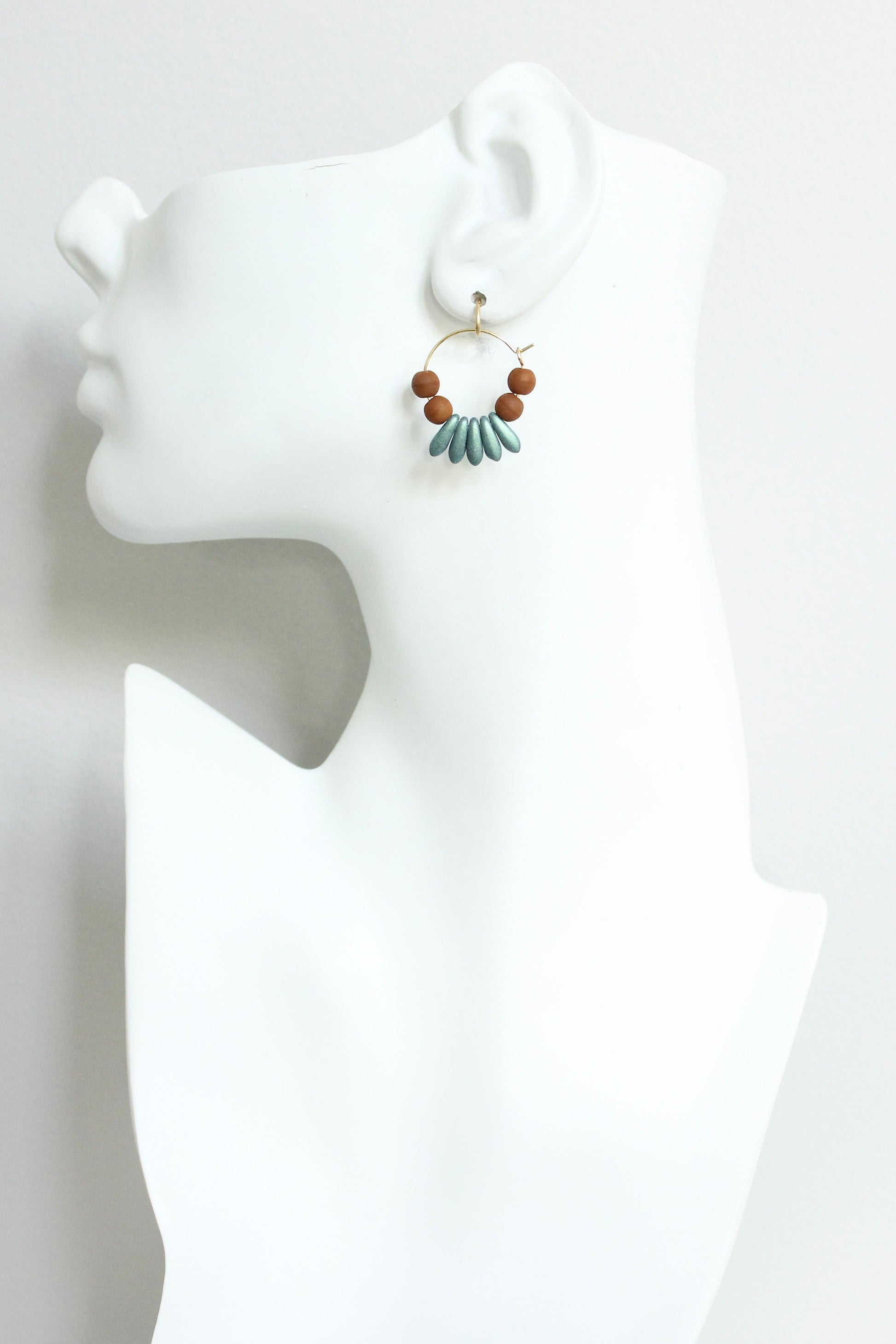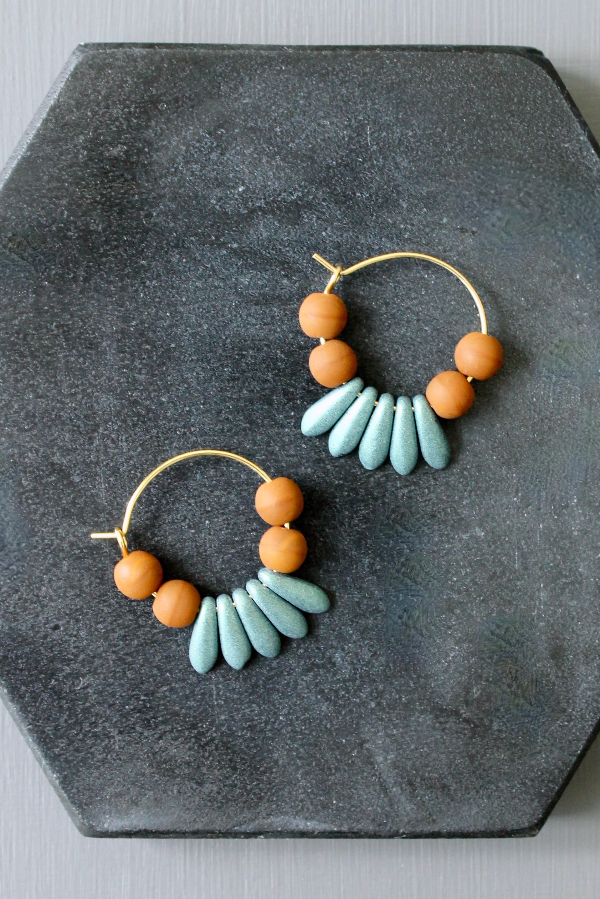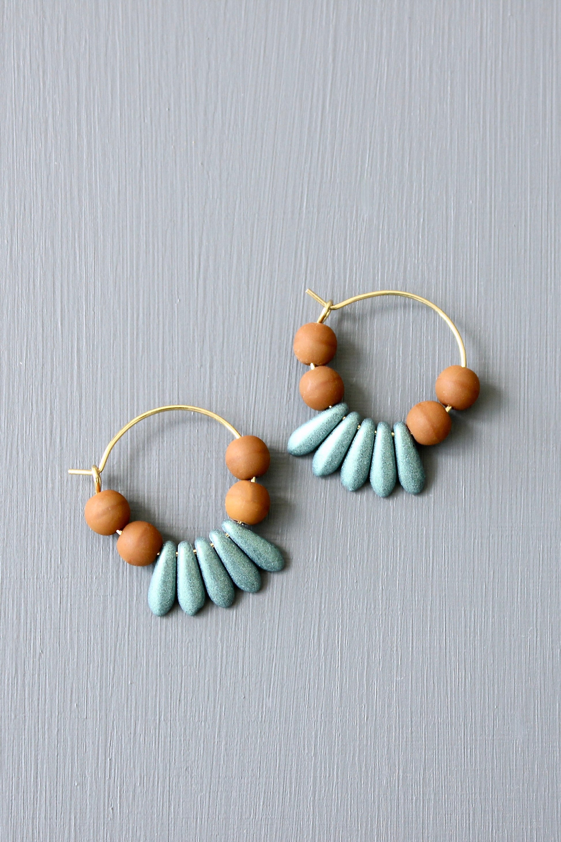 18k Gold plated brass hoop earrings with glass. Each earring weighs .075 oz. and measures 1.125 inches in length from top to bottom.
