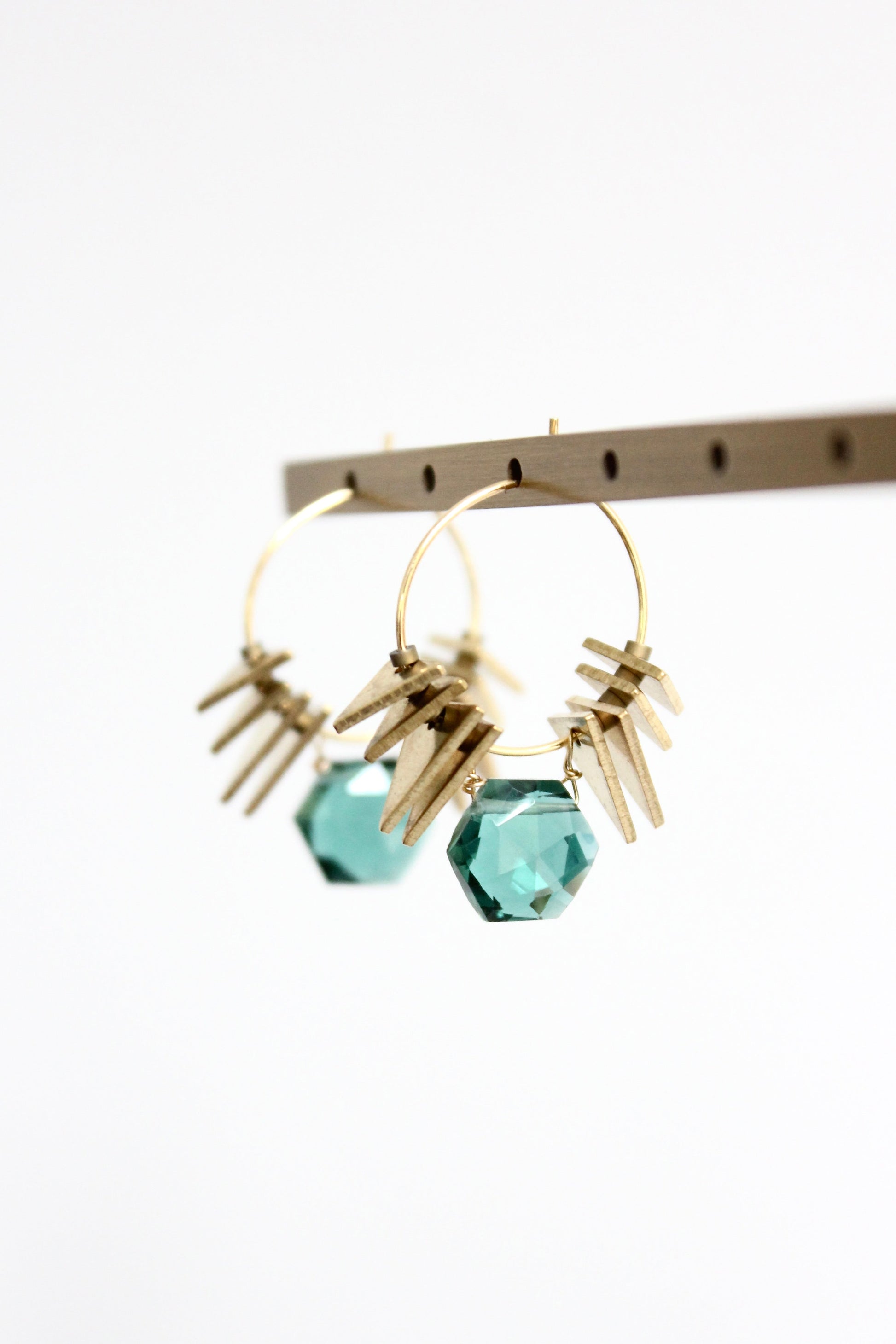 18k Gold plated brass hoop earrings with tourmaline and brass.Each earring weighs .16 oz. and measures 1.25 inches in length from top to bottom.