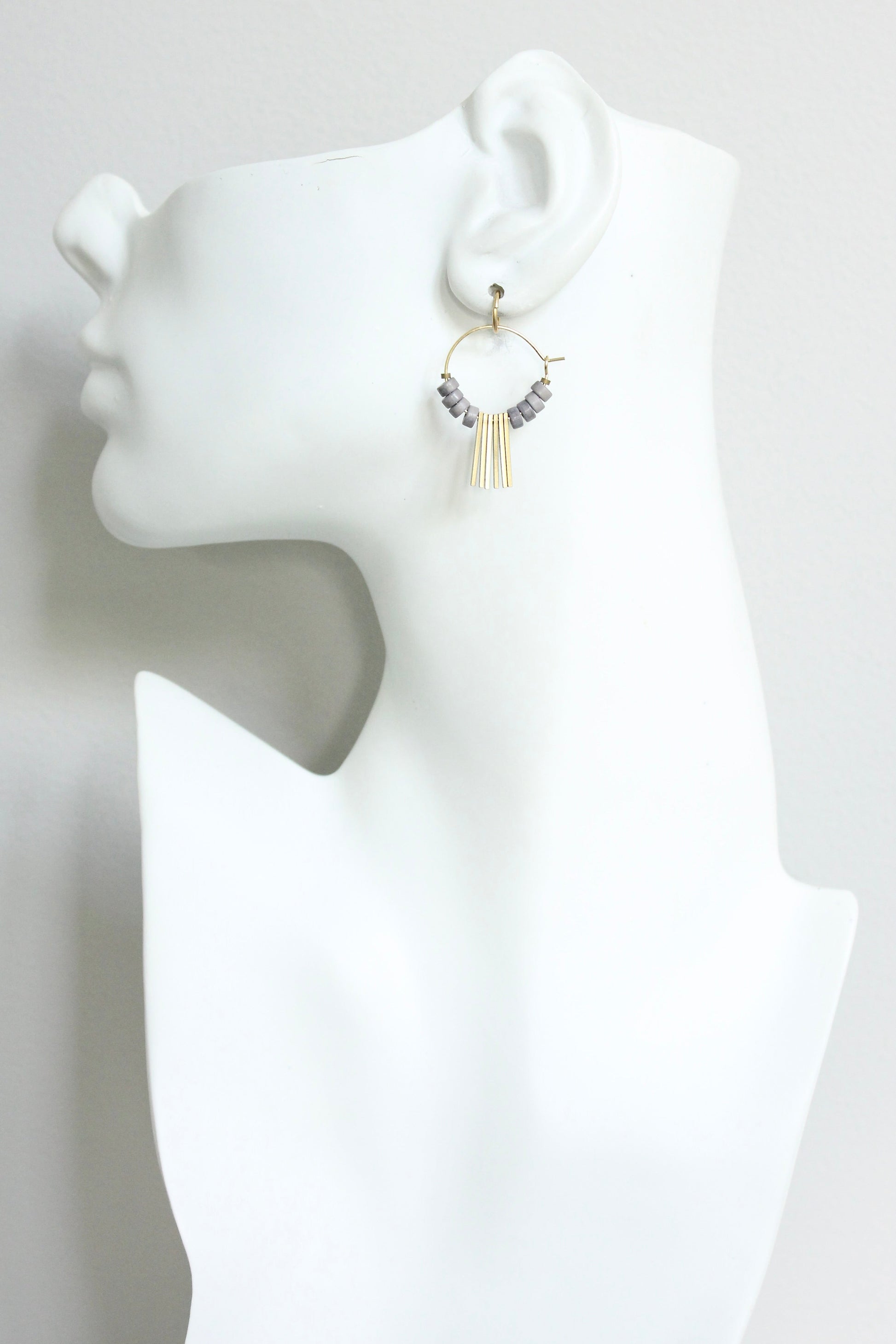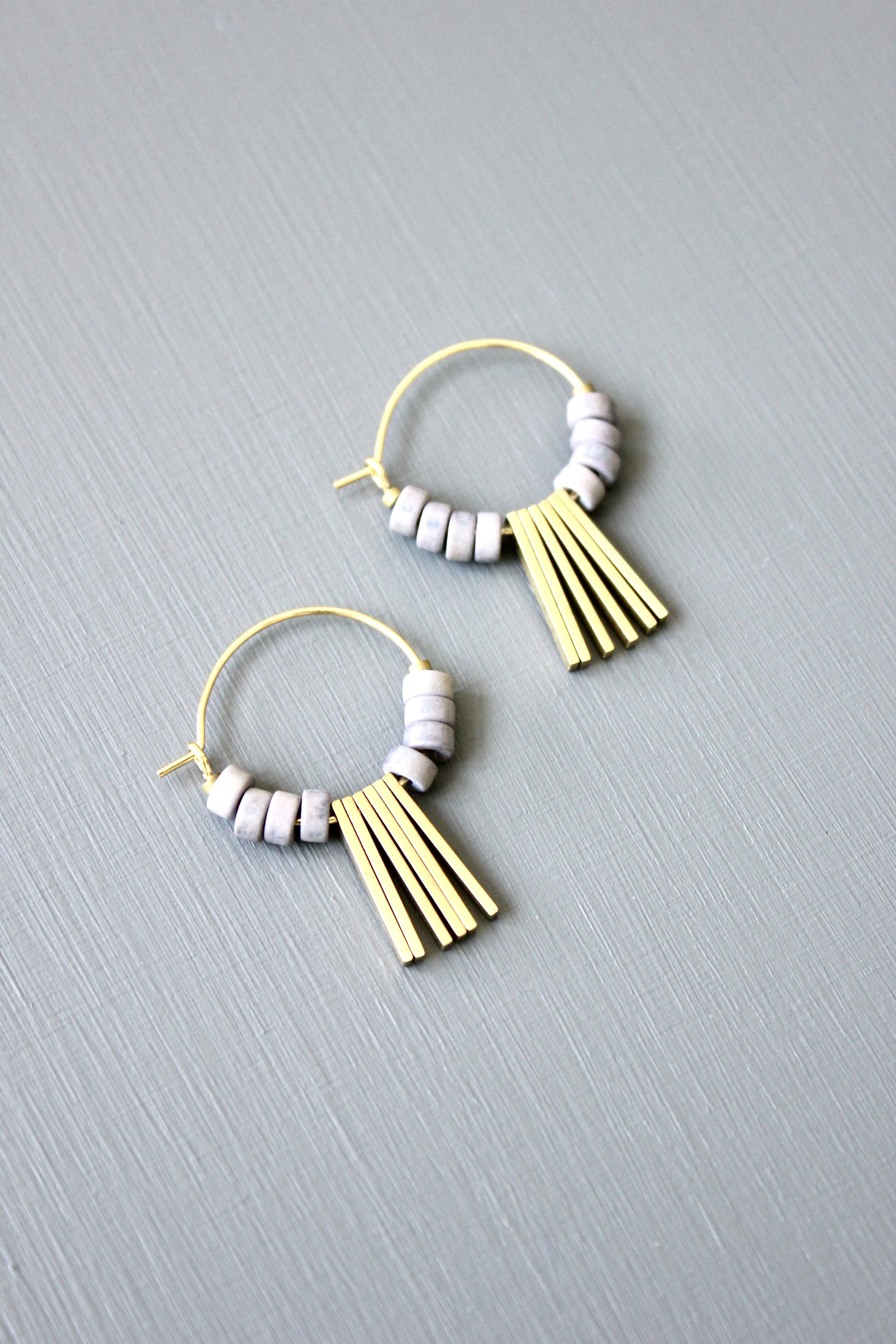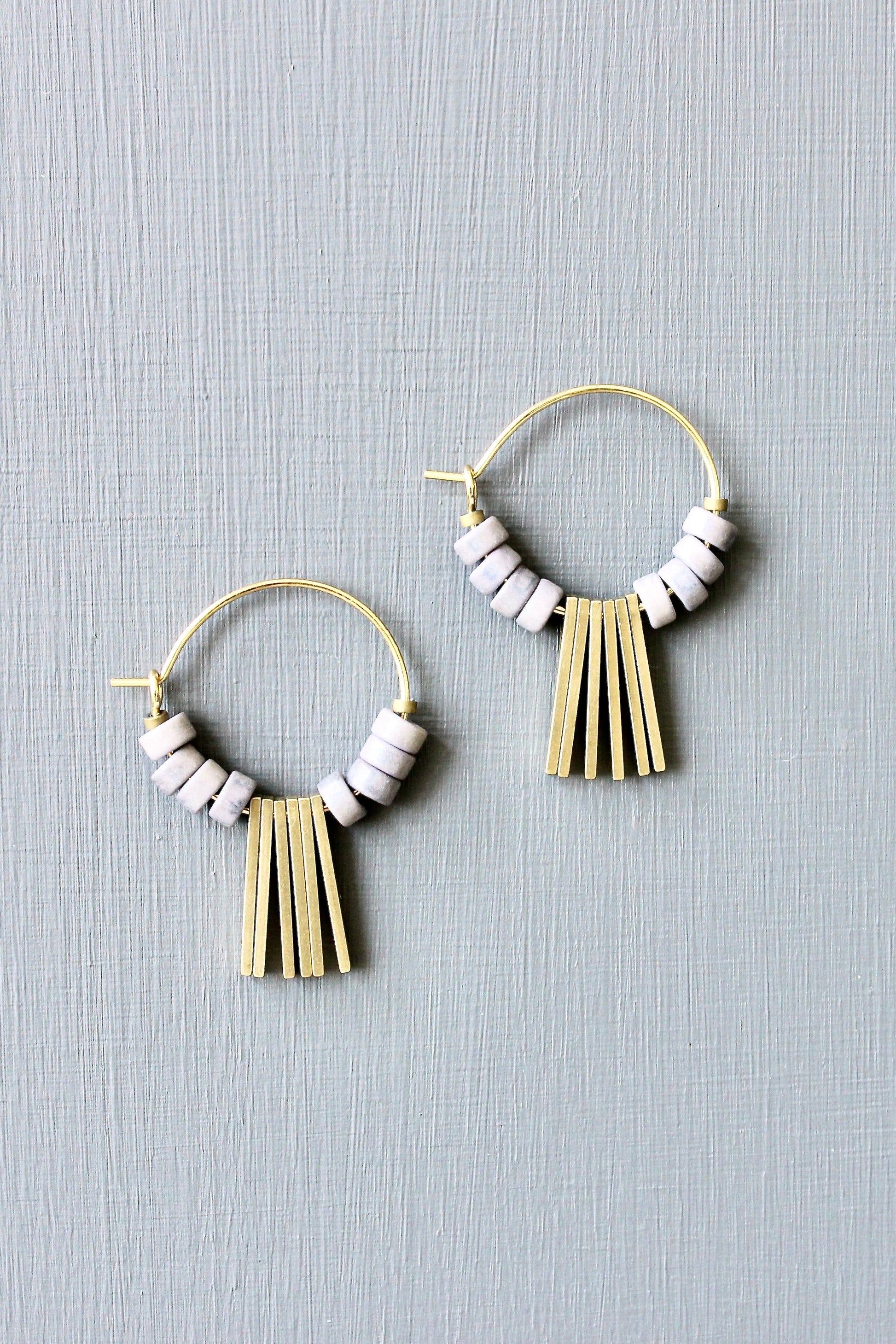 18k Gold plated brass hoop earrings with magnesite and brass. Each earring weighs .08 oz. and measures 1.25 inches in length from top to bottom.
