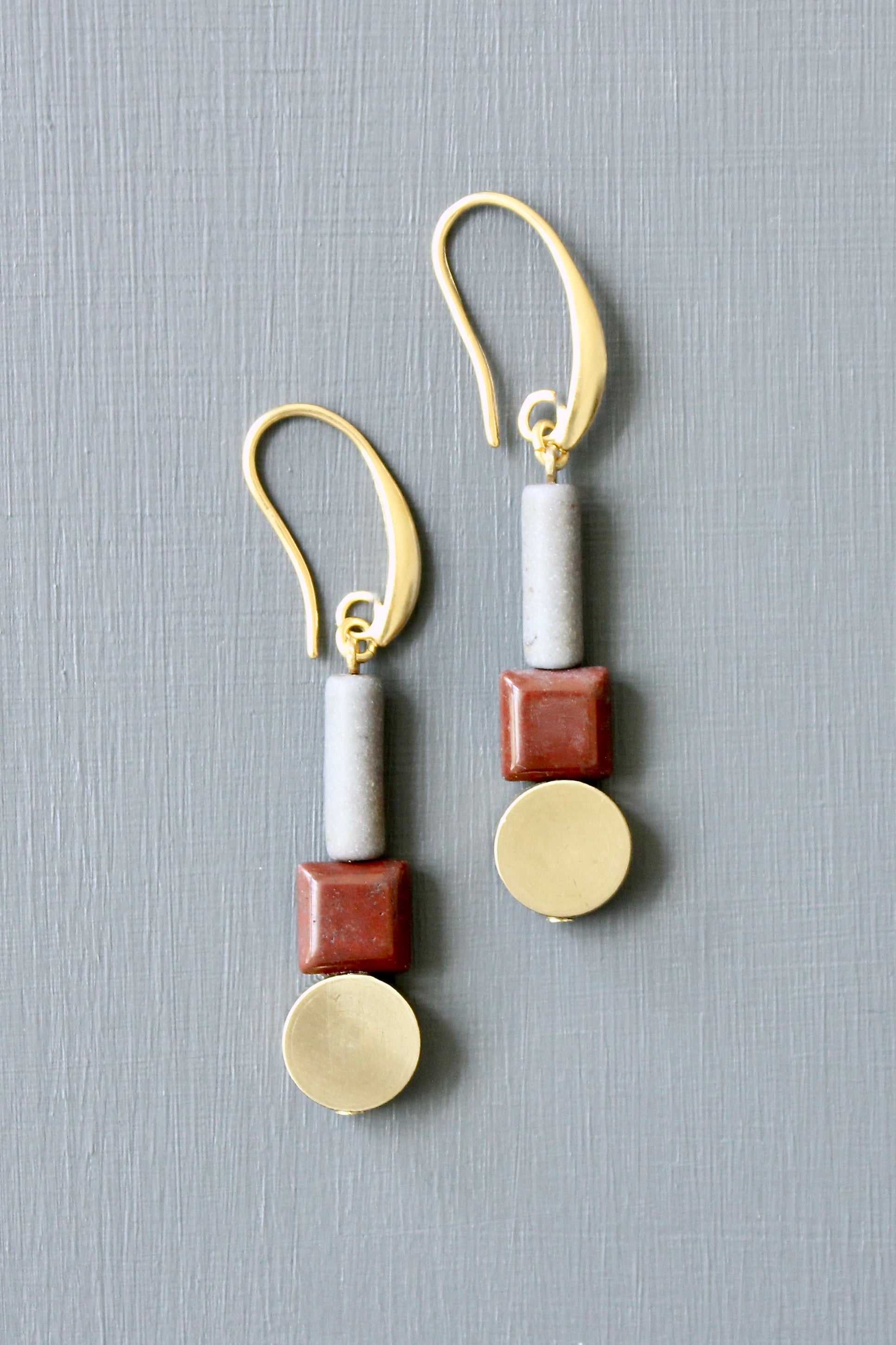 18k Gold plated brass hooks with magnesite, jasper, and brass discs. Each earring weighs .135 oz. and measures 2.125 inches in length from top to bottom.