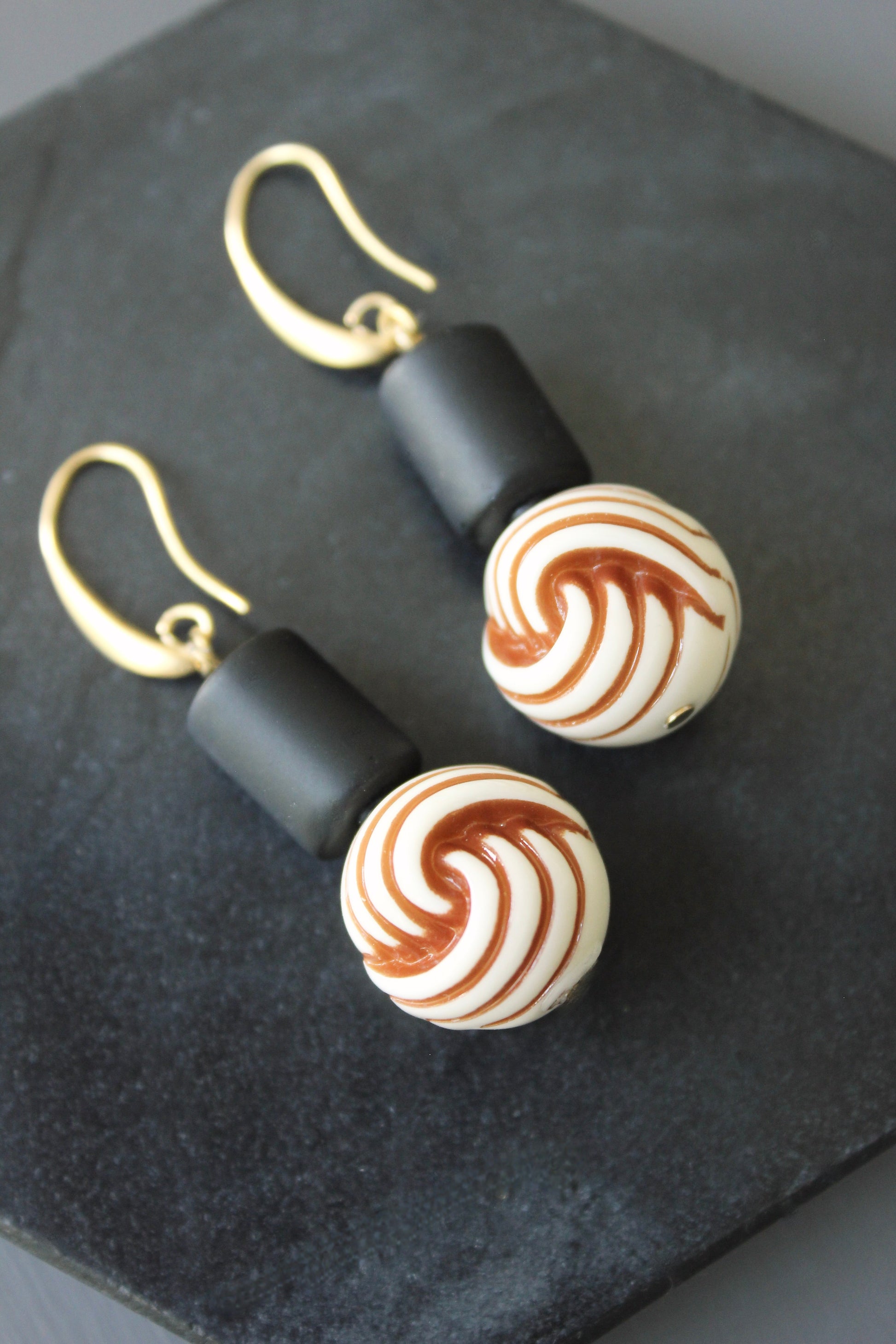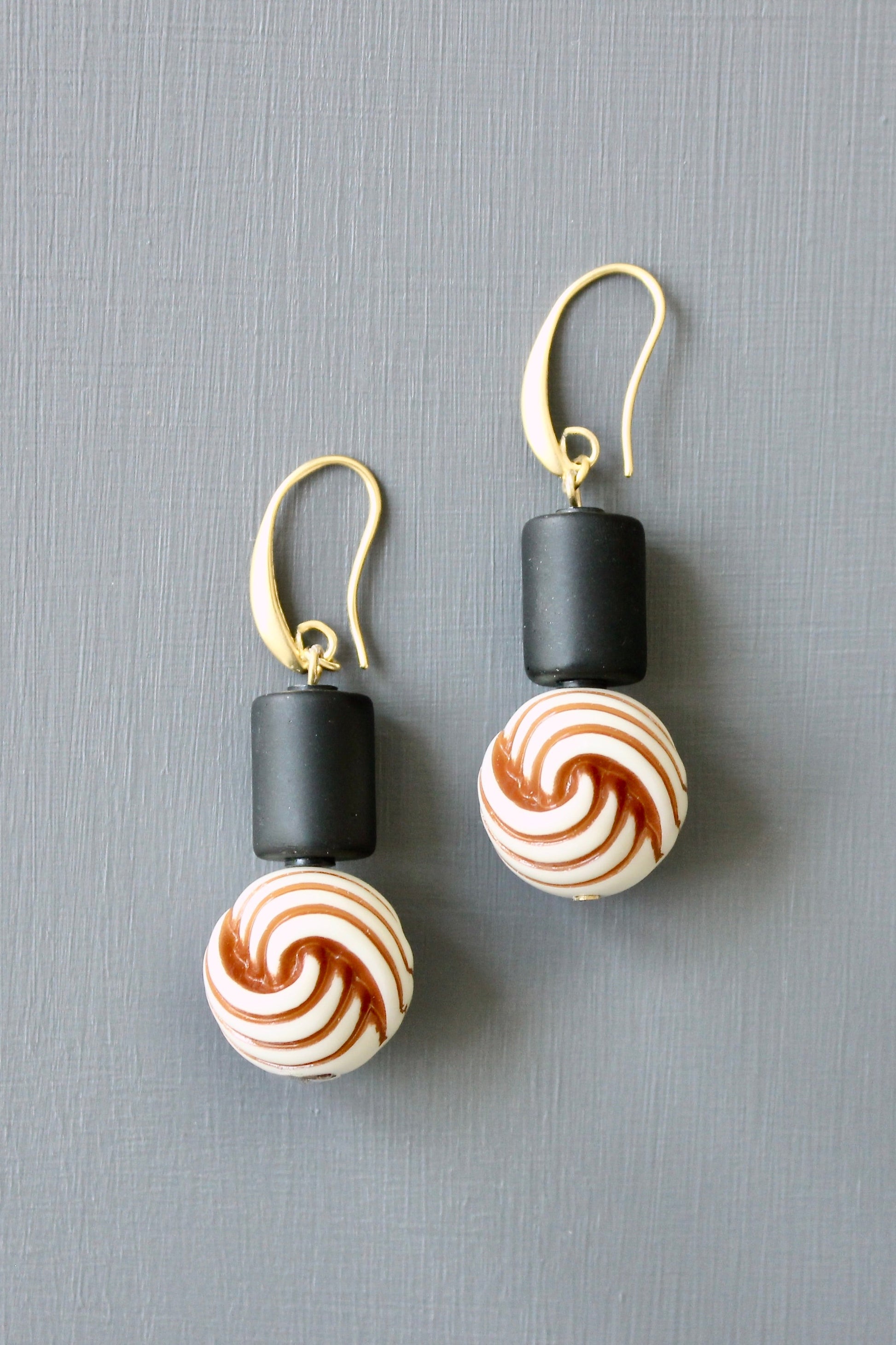 18k Gold plated brass hooks with black glass and vintage swirl acrylic beads. Each earring weighs .23 oz. and measures 2.25 inches in length from top to bottom.