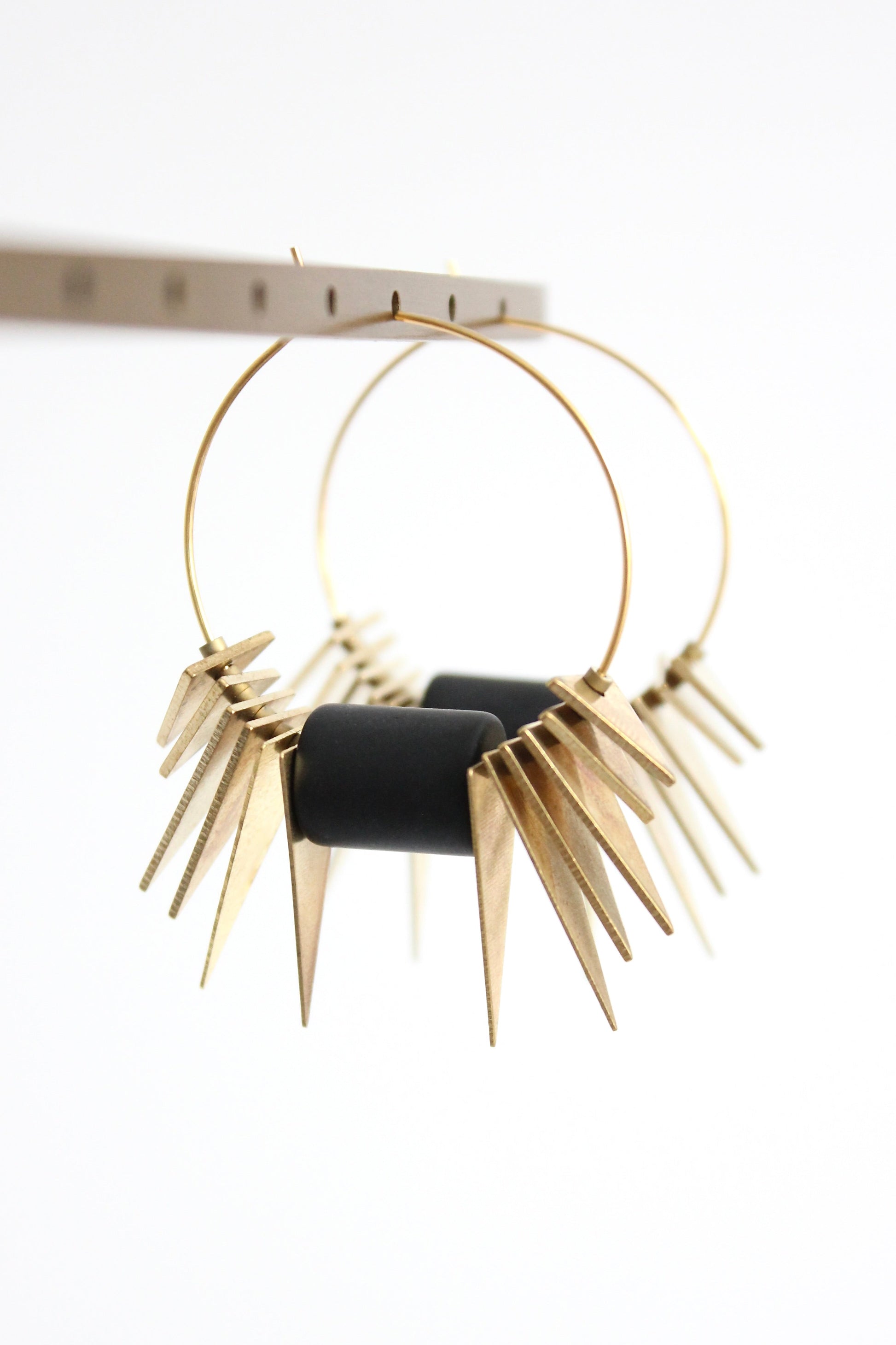18k Gold plated brass hoop earrings with glass and brass. Each earring weighs .37 oz. and measures 2.125 inches in length from top to bottom.