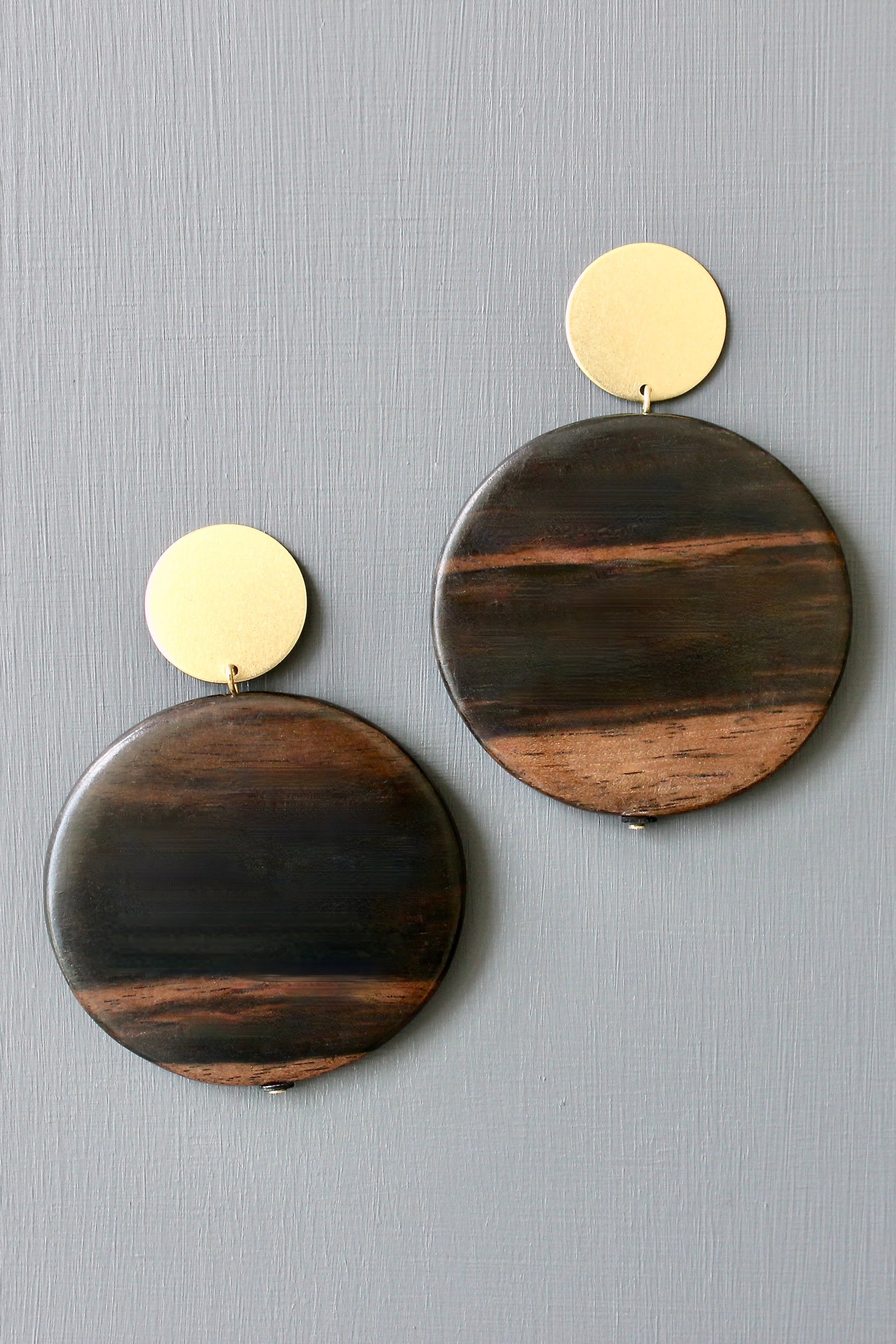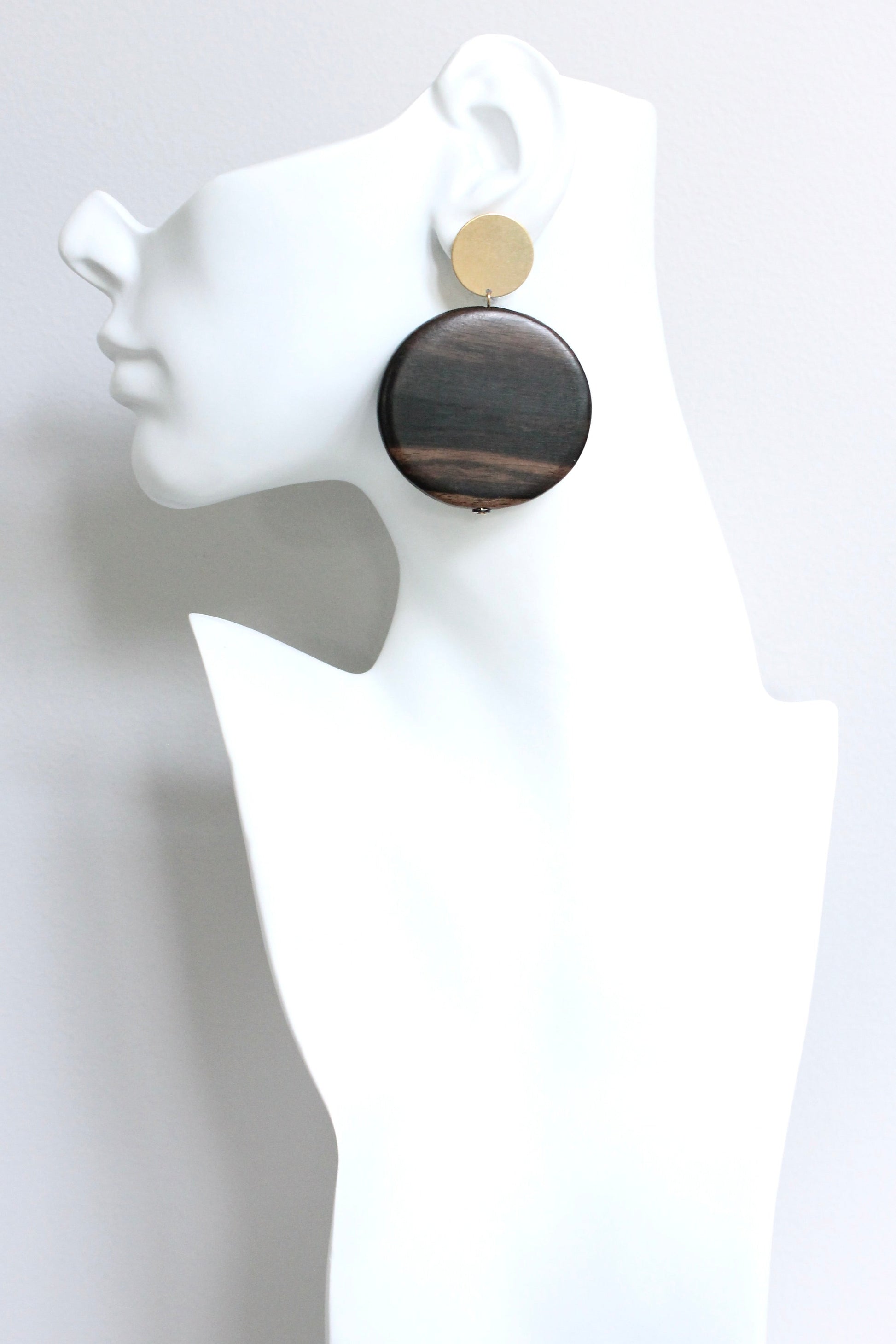 Brass posts with ebony wood. Each earring weighs .425 oz. and measures 2.75 inches in length from top to bottom.