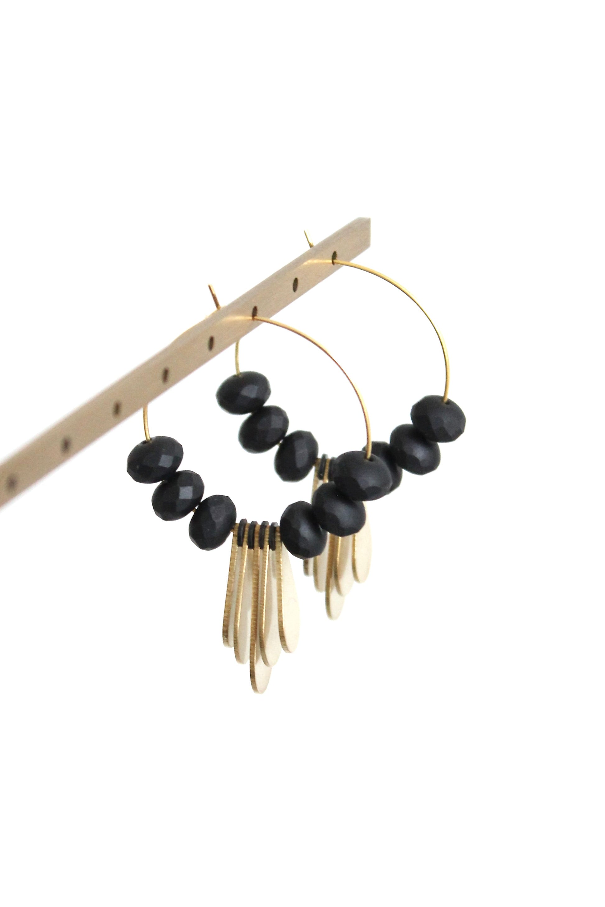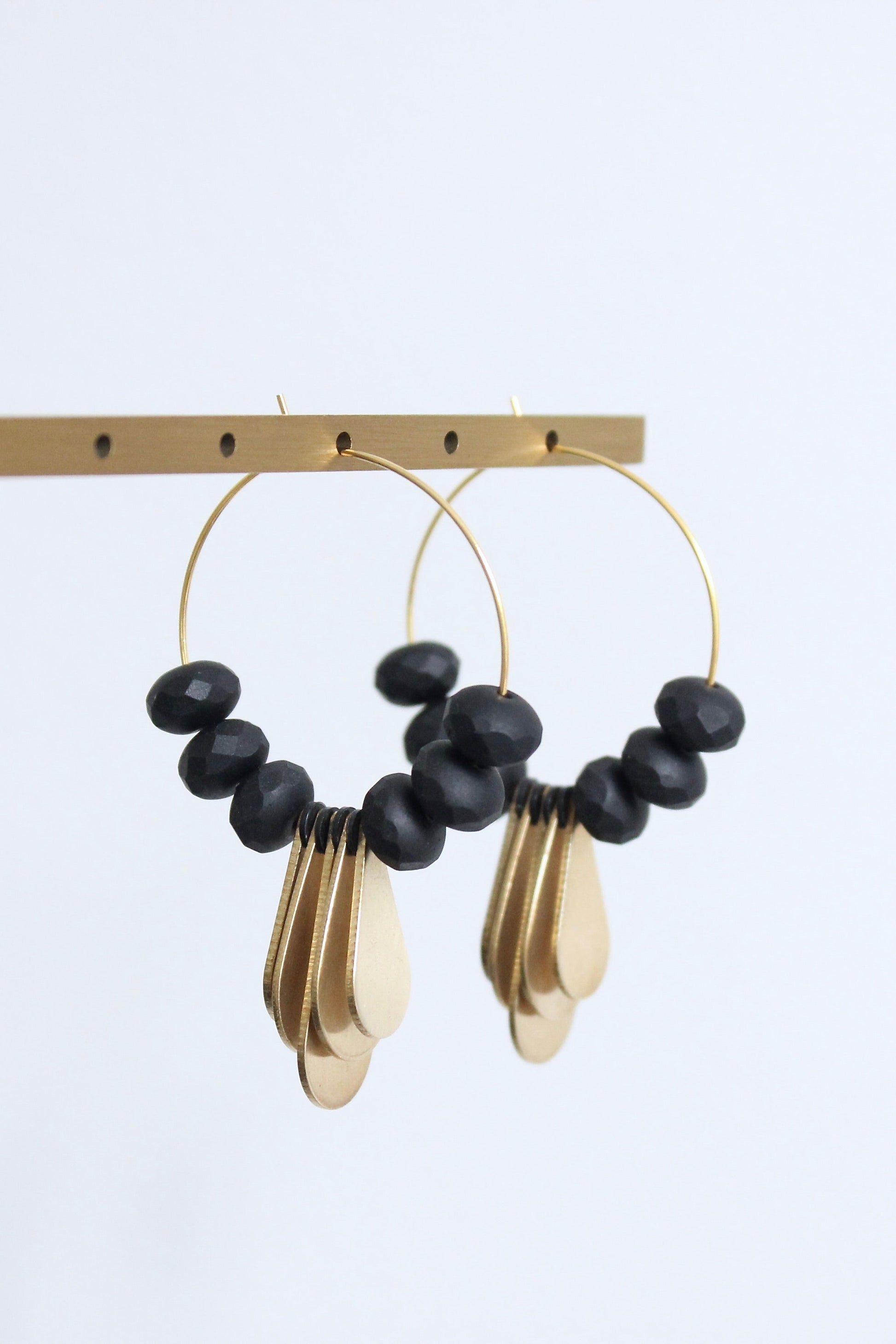 18k Gold plated brass hoop earrings with glass and brass. Each earring weighs .375 oz. and measures 2.375 inches in length from top to bottom.