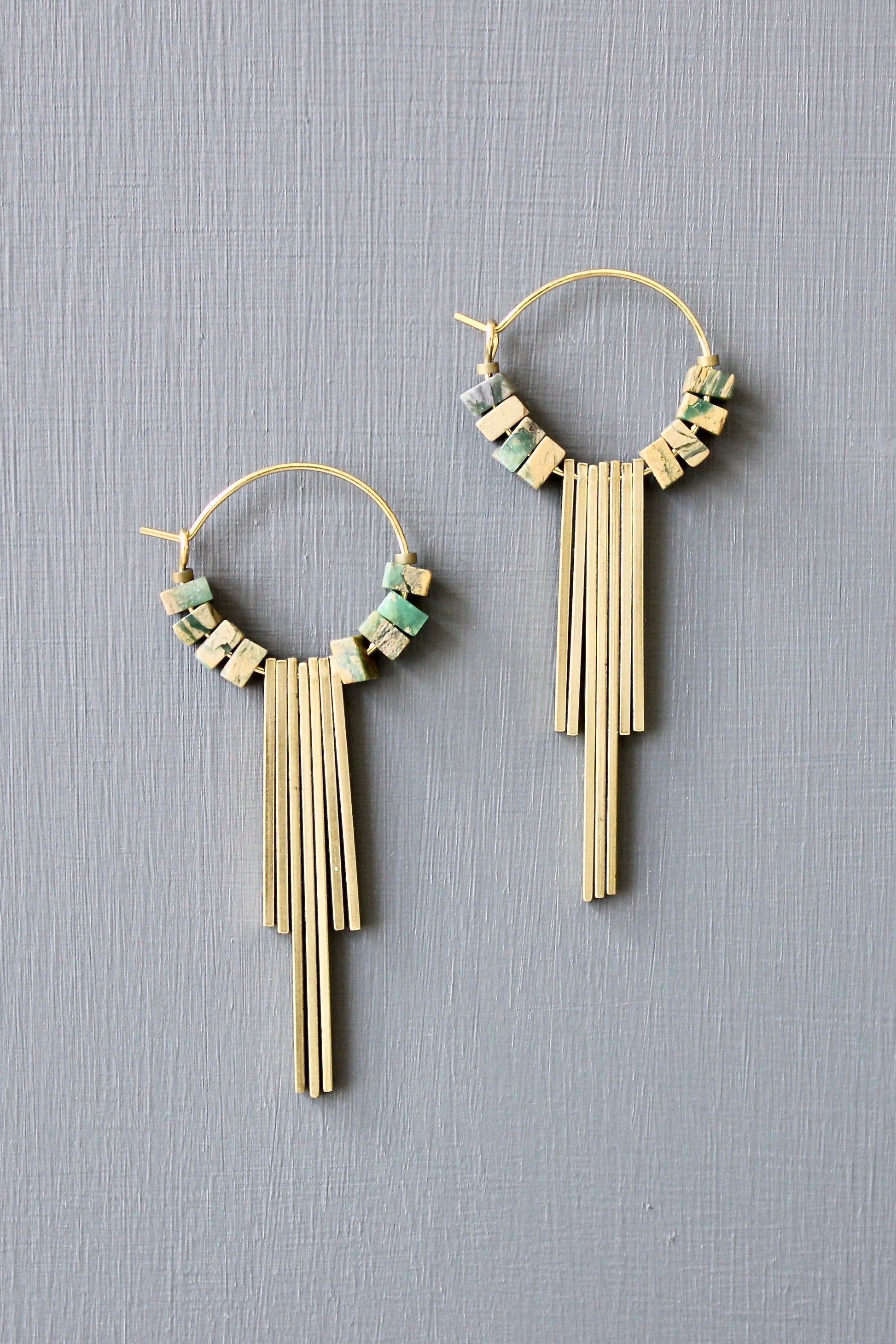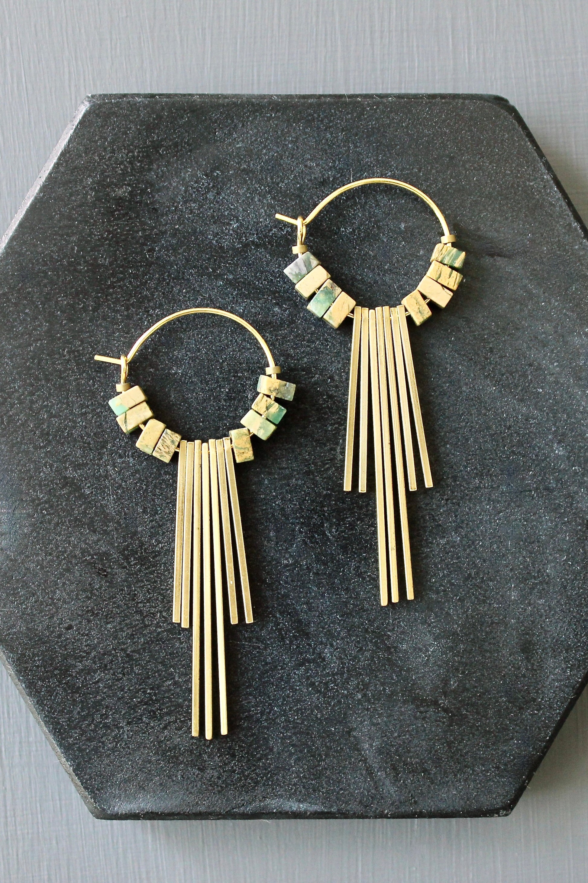 18k Gold plated brass hoop earrings with synthetic jasper chips and brass. Each earring weighs .165 oz. and measures 2.375 inches in length from top to bottom.
