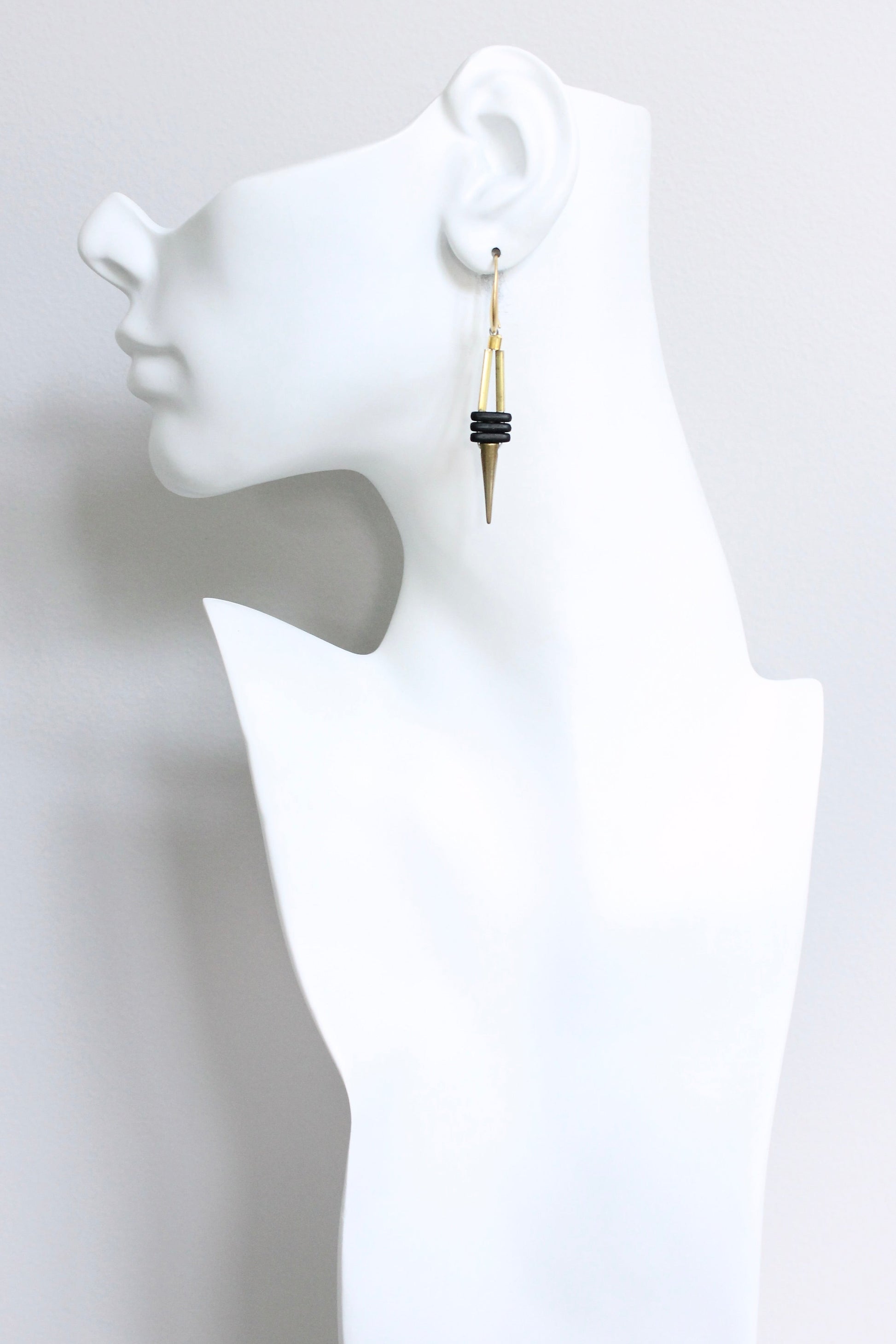 18k Gold plated brass hooks with glass and brass. Each earring weighs .085 oz. and measures 2.375 inches in length from top to bottom.
