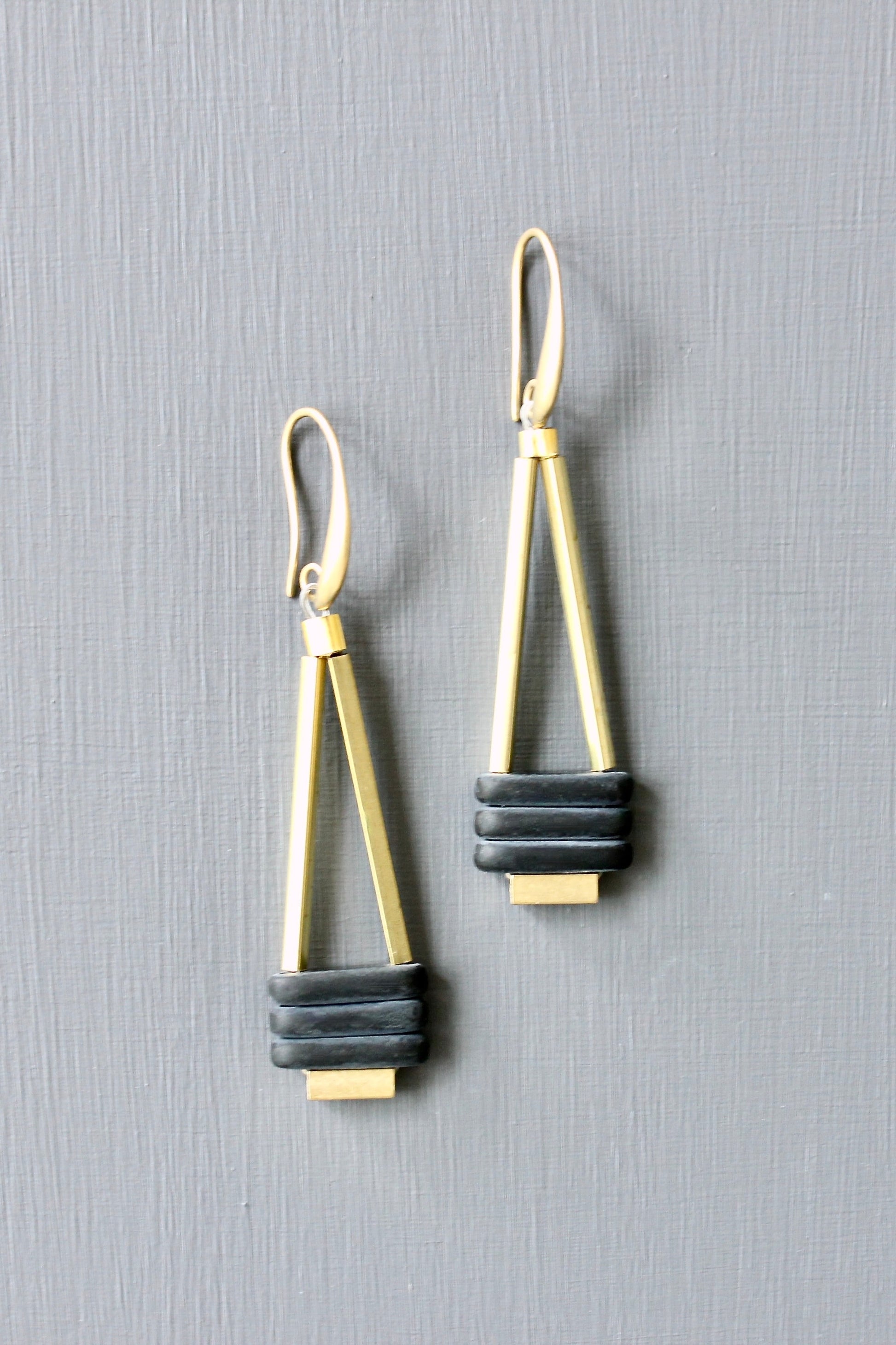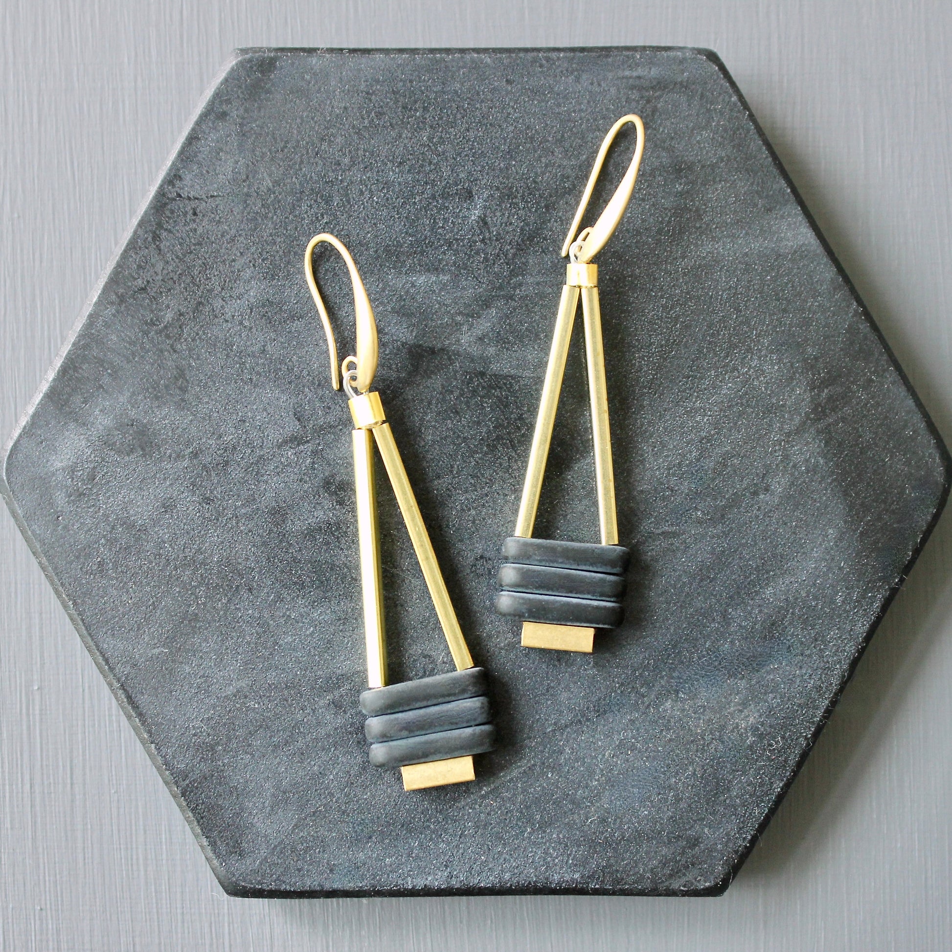 18k Gold plated brass hooks with glass and brass. Each earring weighs .10 oz. and measures 2.5 inches in length from top to bottom.