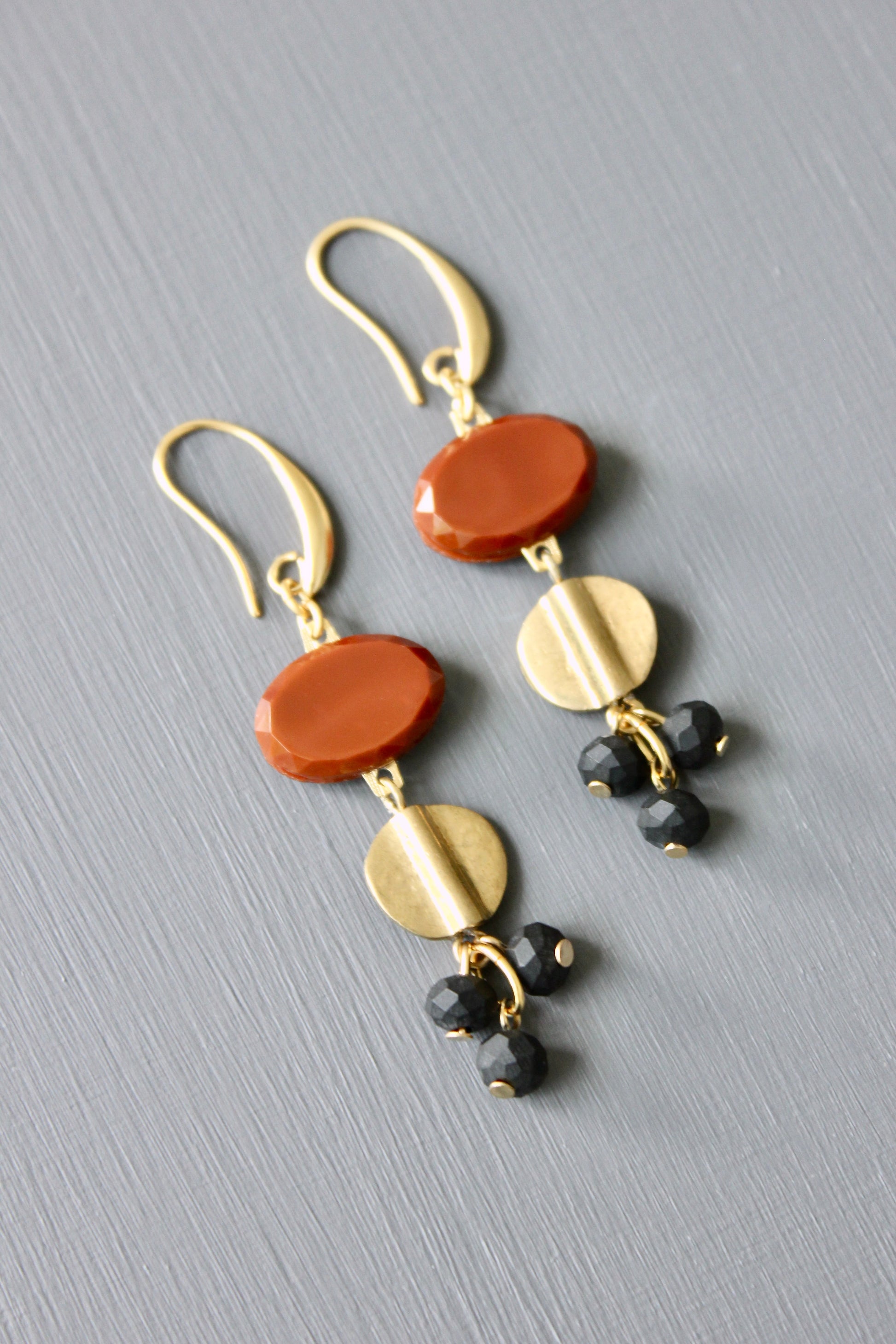 18k Gold plated brass hooks with vintage glass, brass, and matte black glass. Each earring weighs .17 oz. and measures 2.625 inches in length from top to bottom.
