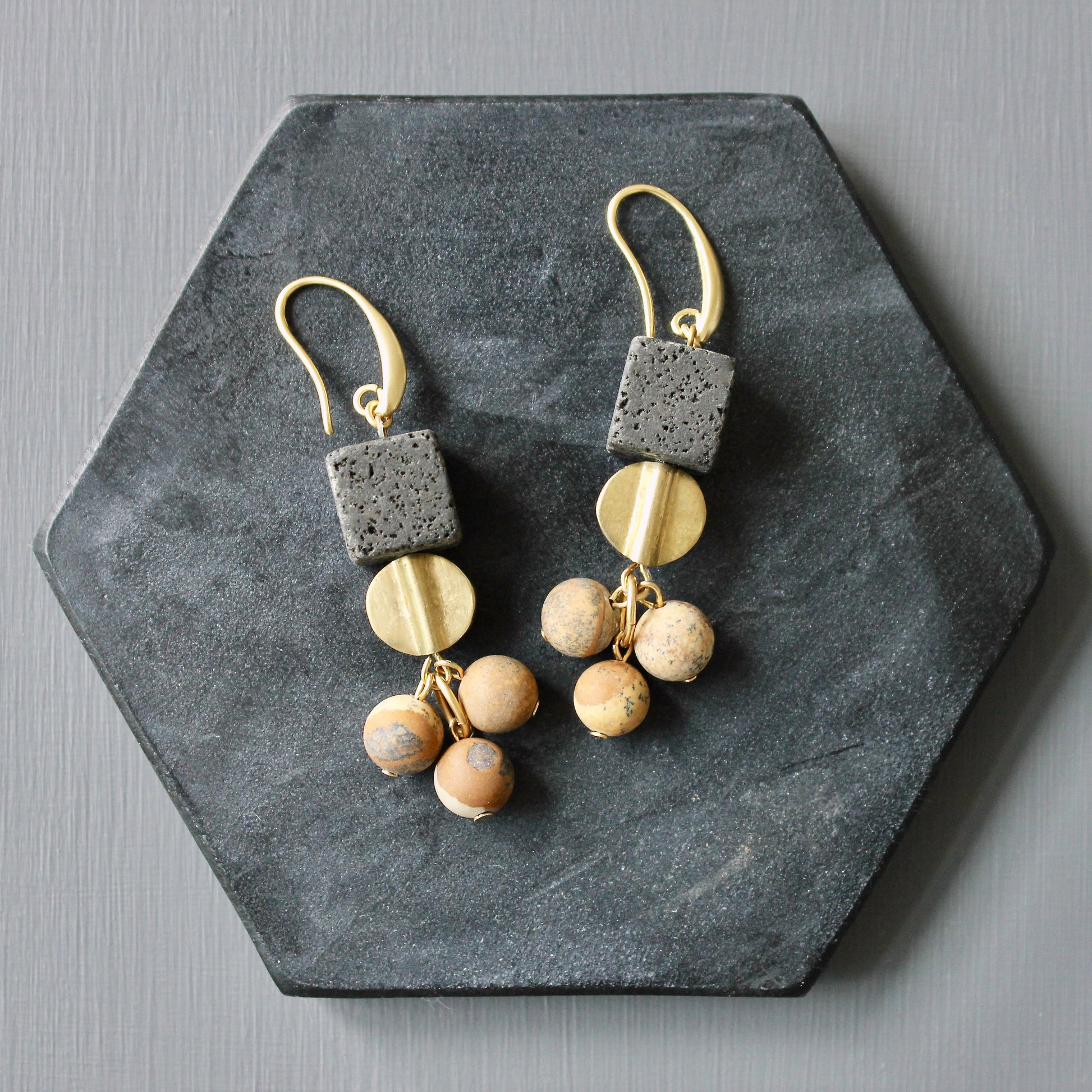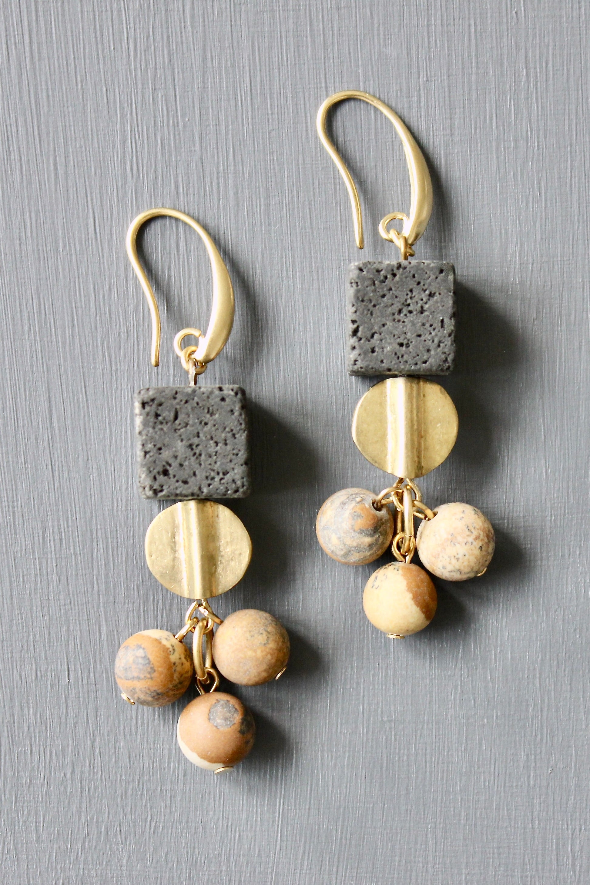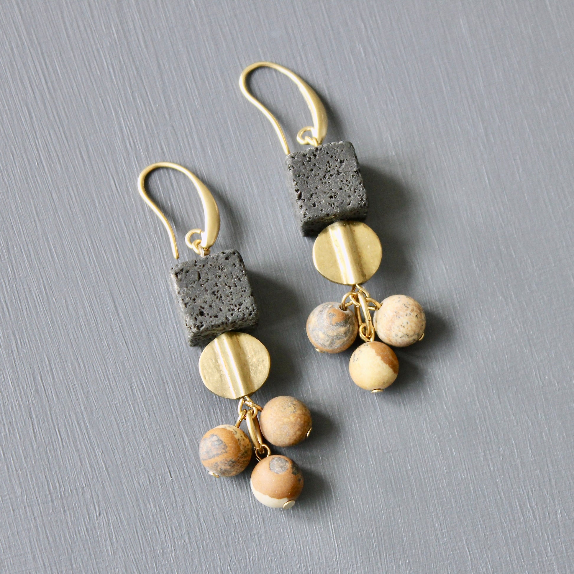 18k Gold plated brass hooks with lava beads and jasper. Each earring weighs .33 oz. and measures 2.625 inches in length from top to bottom.