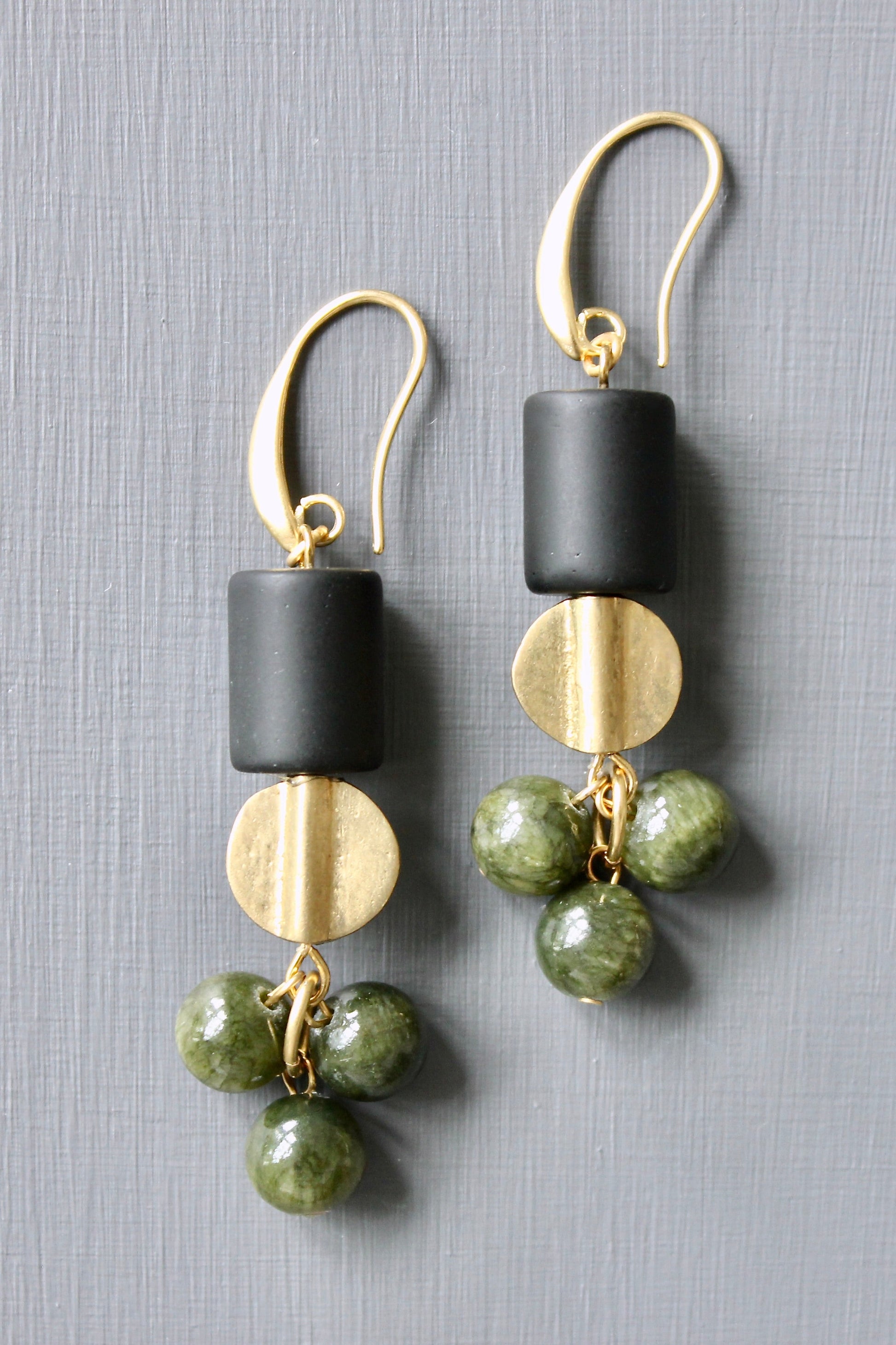 18k Gold plated brass hooks with glass and dyed jade. Each earring weighs .27 oz. and measures 2.625 inches in length from top to bottom.